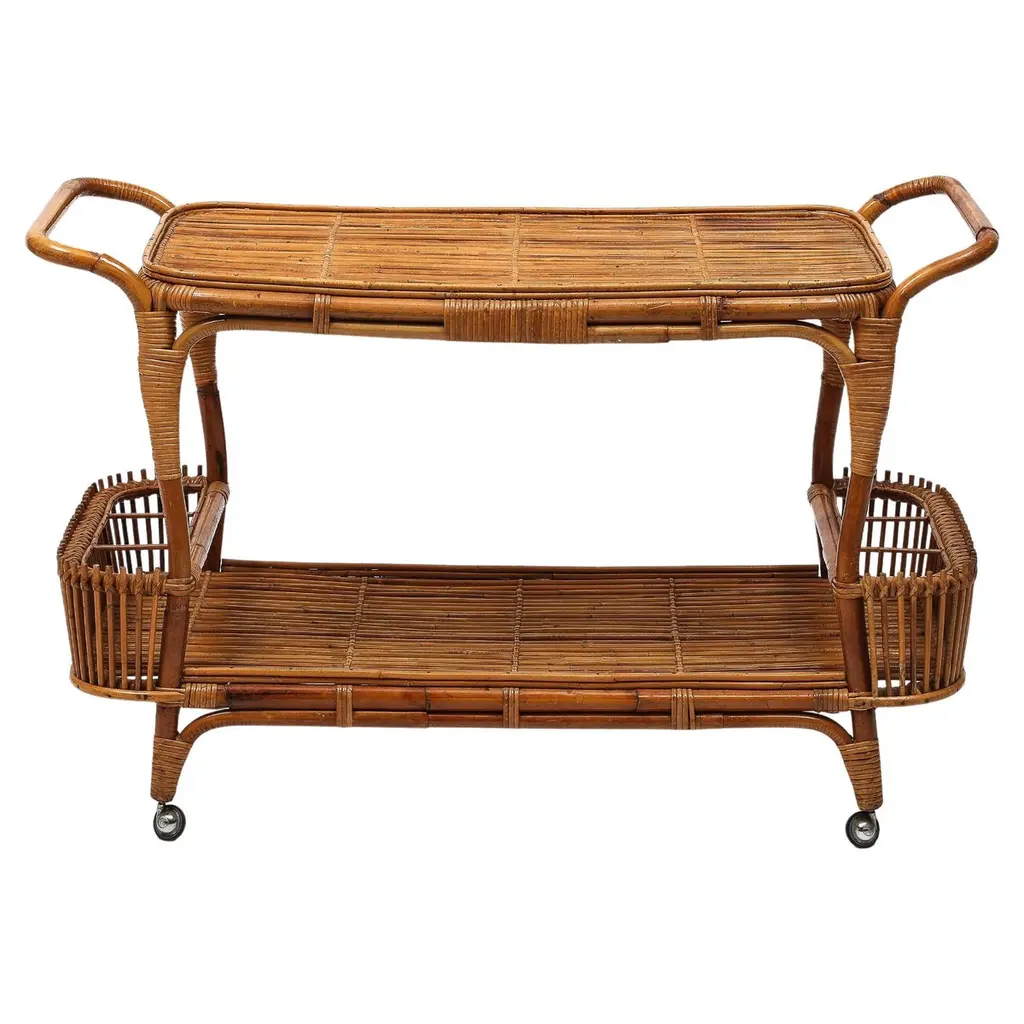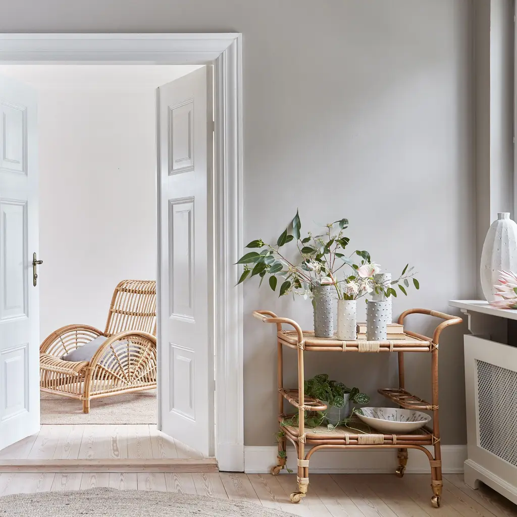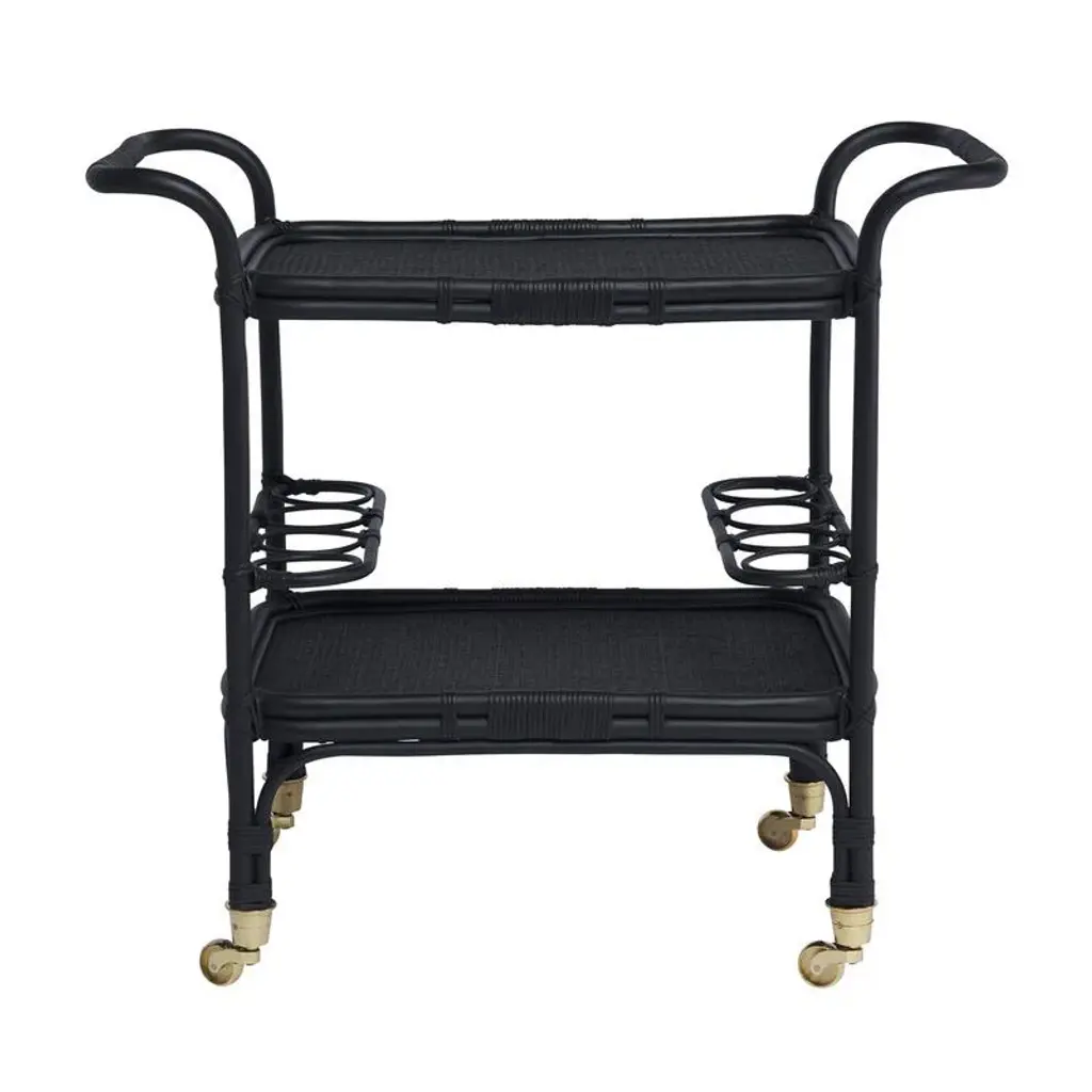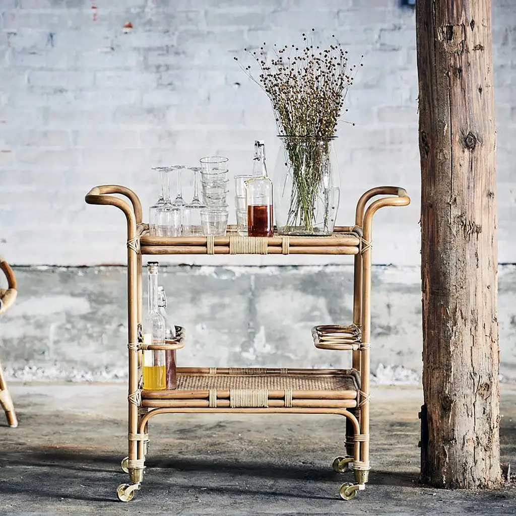 Bringing back the glamour of the 1950s and 1960s, when dinner parties and merry mixers were all the rage, the Carlo Bar Cart/Trolley from Sika Design is an elegant, yet rustic addition to your well-appointed home. Handmade from lightweight, durable Rattan, this two-tiered bar trolley showcases two woven shelfs, caned bottle racks and brass finished castors for a touch of glamor. Over time, the natural rattan weathers to a silvery patina, adding to the vintage vibe of your home bar. Highlights