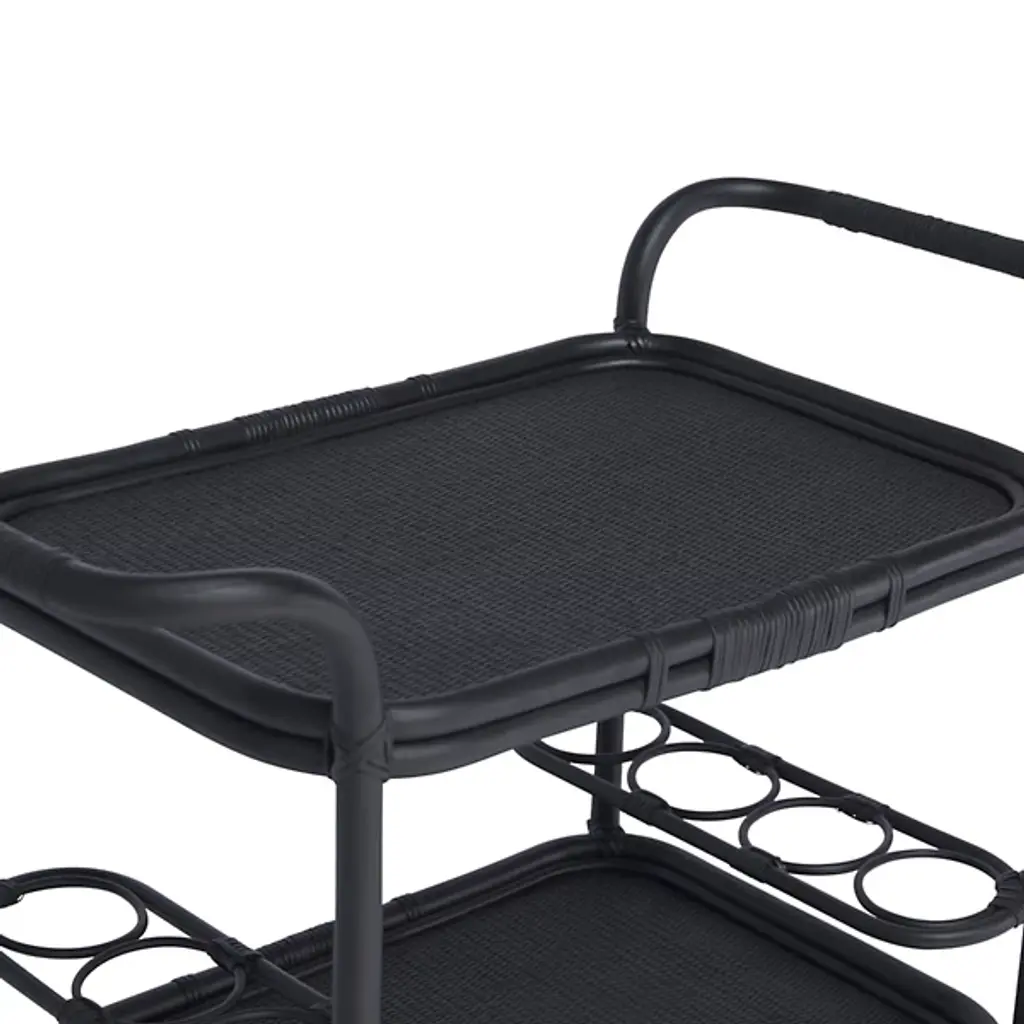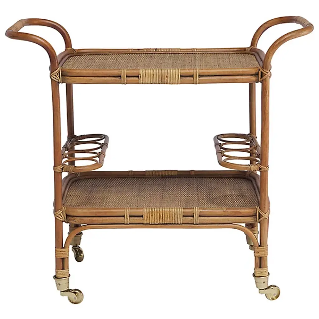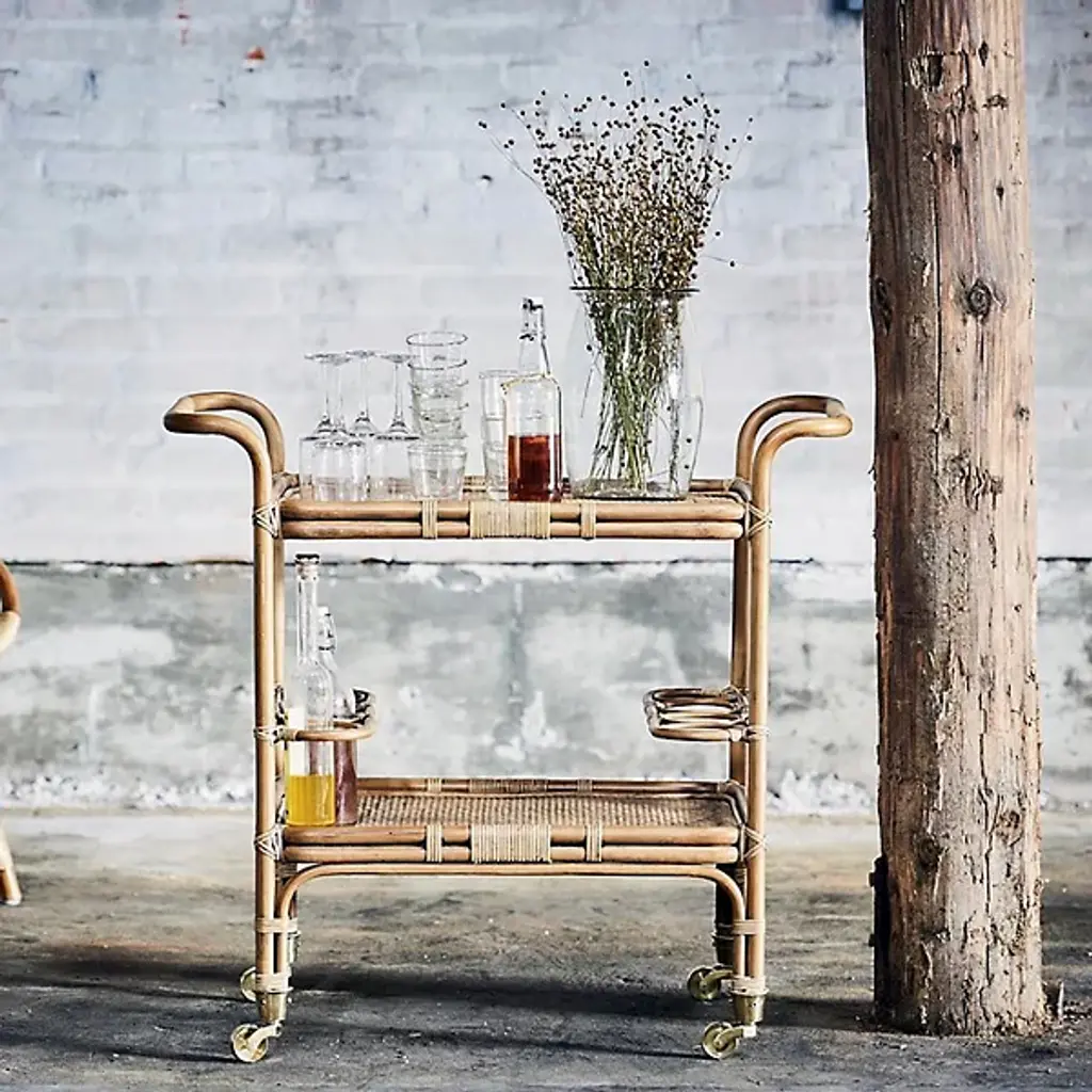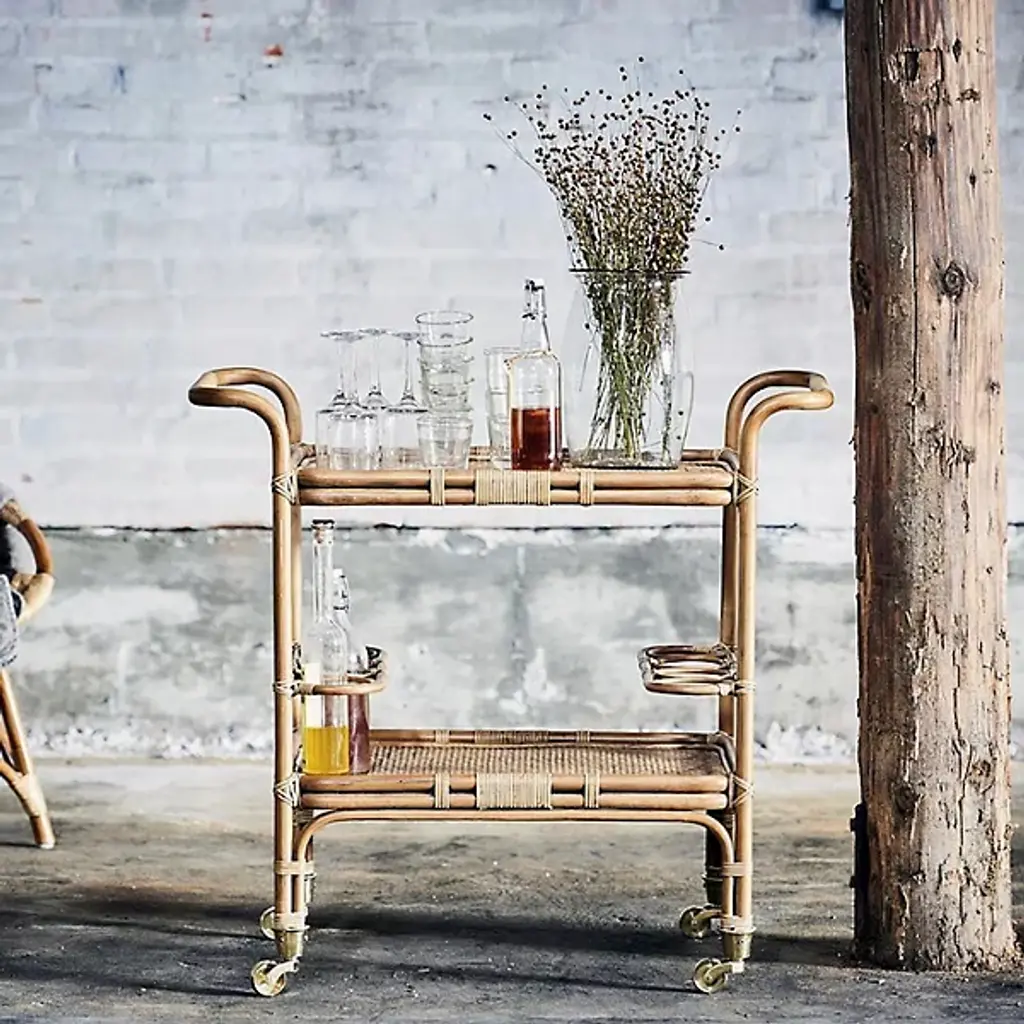 The Carlo Outdoor Bar Cart by Sika Design channels the charm of 1950s entertaining with a timeless midcentury design. Handcrafted from sustainably harvested rattan, it features two woven tiers with tempered glass inserts, elegant cane bottle racks, and curved trolley handles. Smooth caster wheels make it easy to move from room to room. Suitable for indoor use in kitchens, dining, or living areas, it’s a stylish, functional piece that brings a touch of vintage glamour to any gathering.