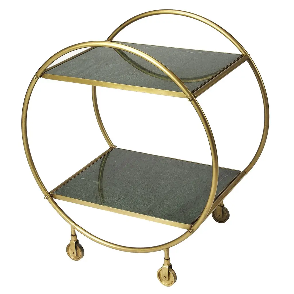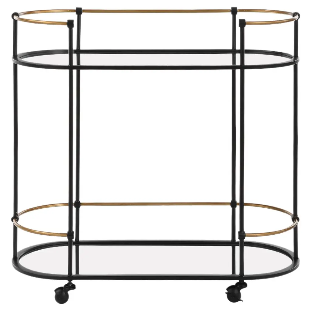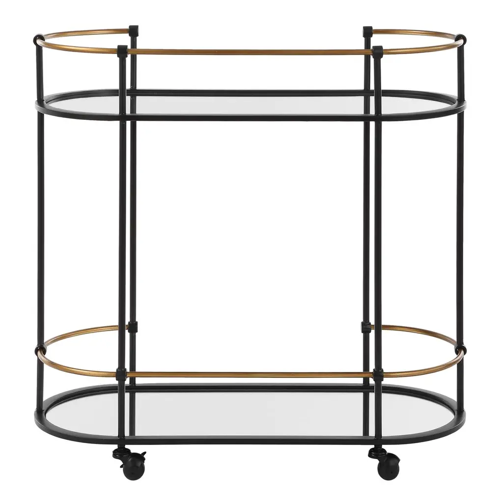 Introducing the Cassian Bar Cart, a masterpiece of elegance and functionality. Its clean, pill-shaped design is a testament to modern sophistication, while the sleek iron legs provide a striking contrast to the antique gold accents. This bar cart is not just a piece of furniture; it's a statement of style and grace. The two mirrored shelves offer a glamorous stage for your cherished glassware and spirits, reflecting the beauty of your collection. With rolling and locking casters, it effortlessly glides to wherever the party takes you, ensuring your gatherings are as seamless as they are stylish. The Cassian Bar Cart is more than just a cart; it's an invitation to celebrate life's finest moments with a touch of romance and allure.