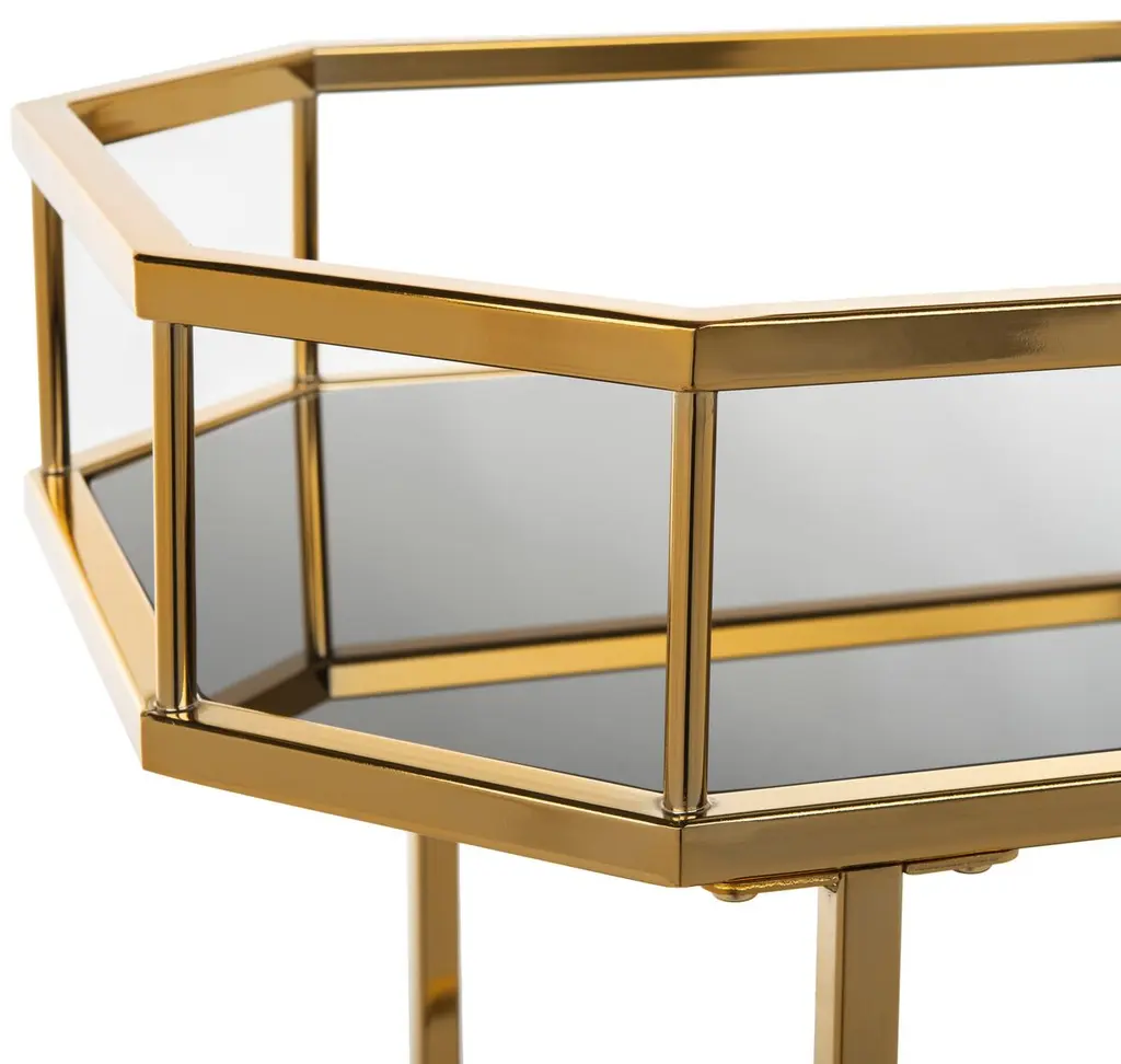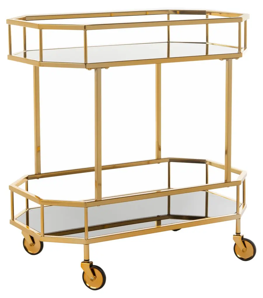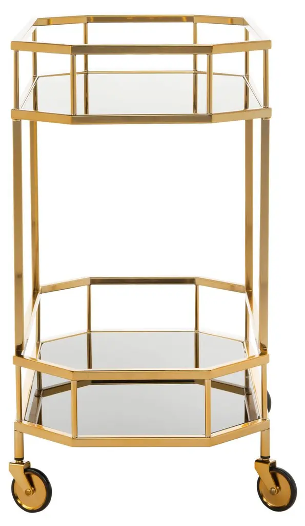 Designed with a geometric iron frame and glass surfaces, this petite bar cart delivers charming retro style to any home bar. Caster wheels allow for easy mobility and protect floors from scratching and marring.
