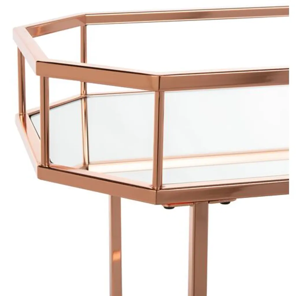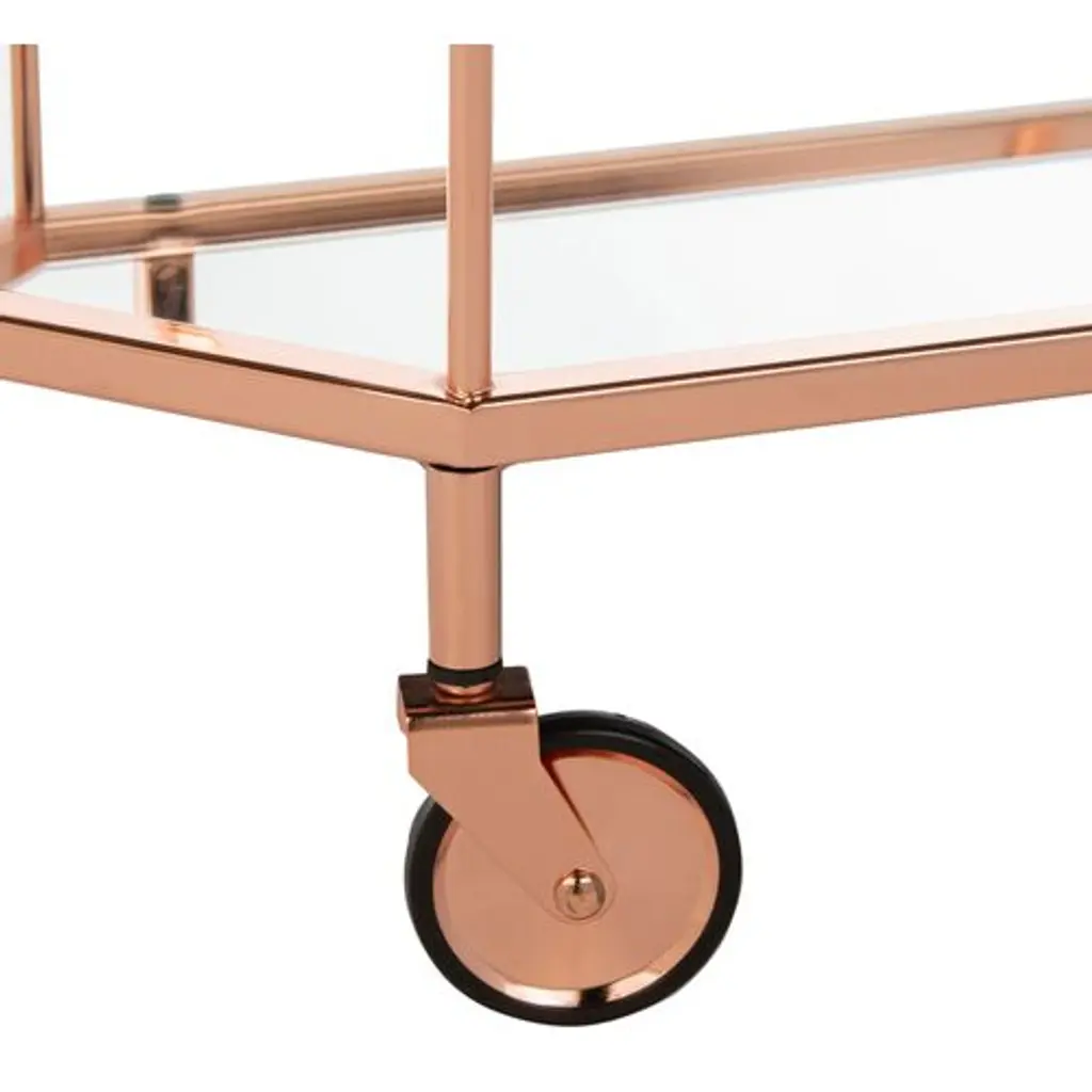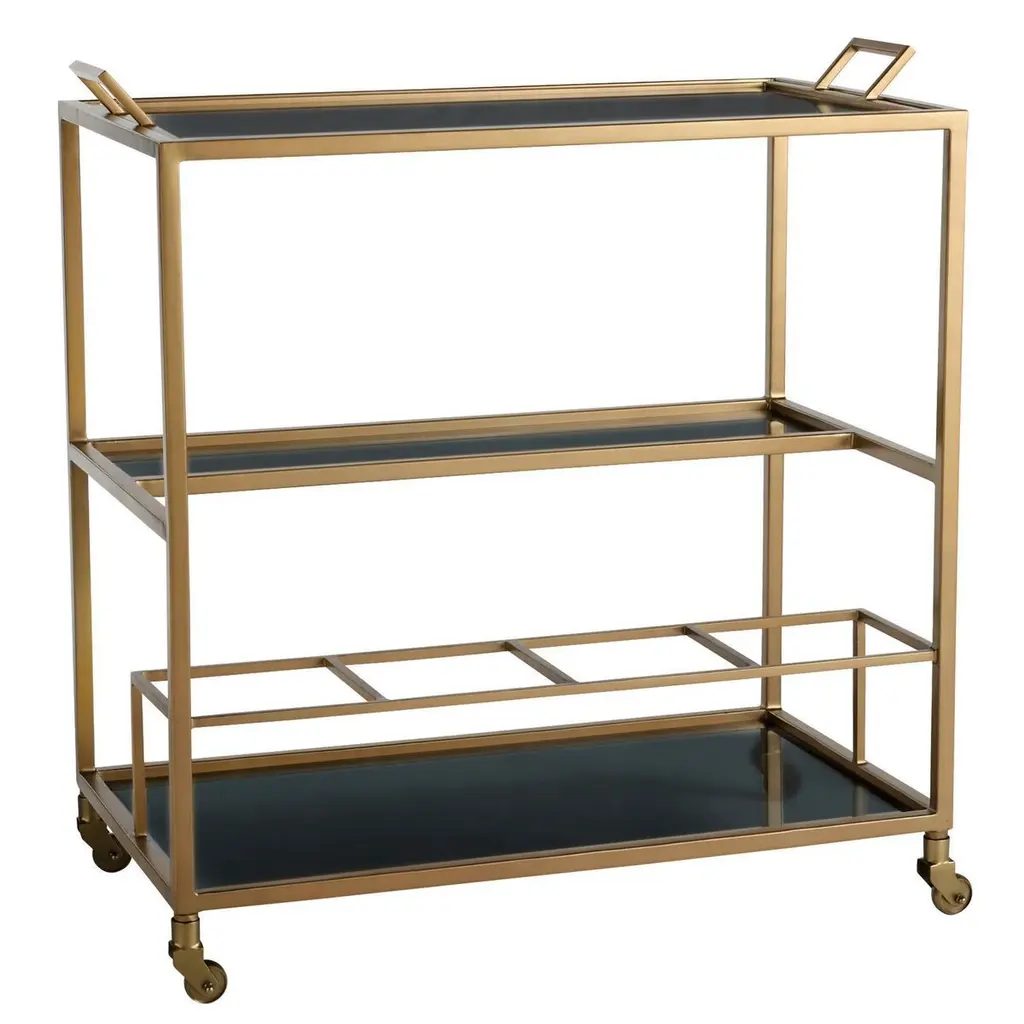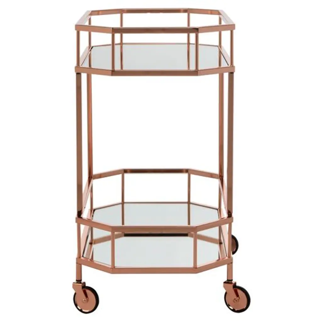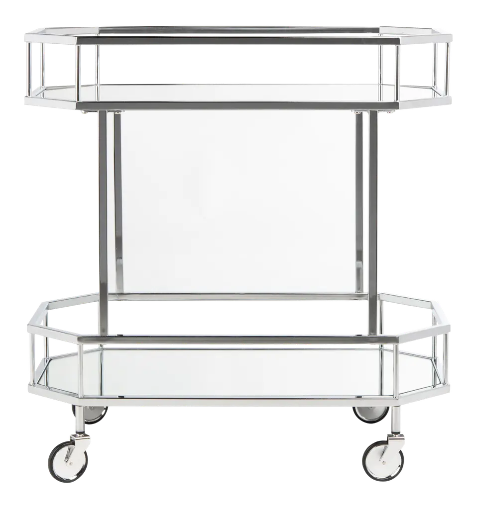 Designed with a geometric iron frame and mirrored glass surfaces, this petite bar cart delivers charming retro style to any home bar. Caster wheels allow for easy mobility and protect floors from scratching and marring.