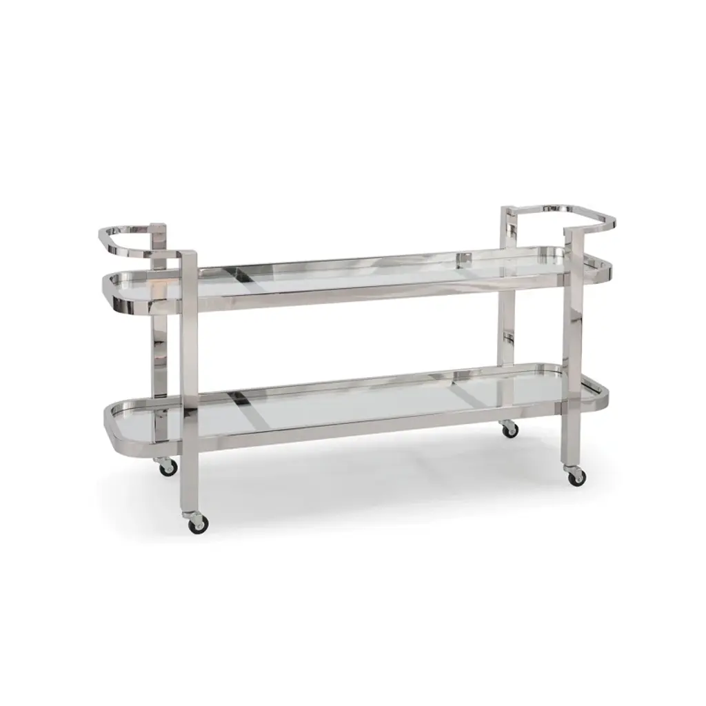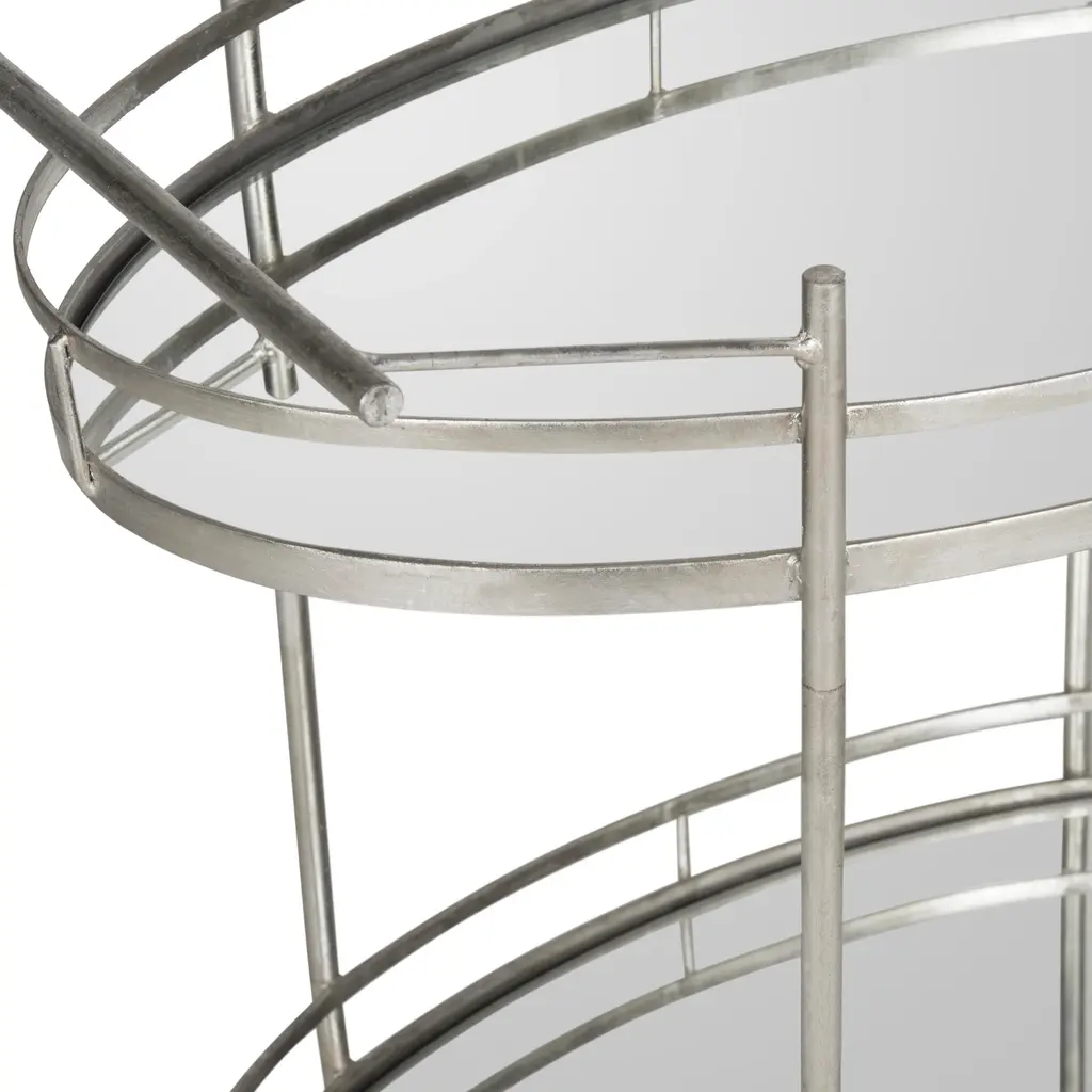 Recalling the elegance of hotel and restaurant dessert and cocktail trolleys, the bar cart makes home entertaining special. This trolley on casters features chic mirrored glass shelves and a frame of sturdy iron in a lustrous silver finish. Dust with a soft, dry cloth. Do not use abrasive cleaner. To clean mirror/glass, spray a small amount of glass cleaner onto a lint-free cloth and wipe mirror/glass clean. Some assembly required.
