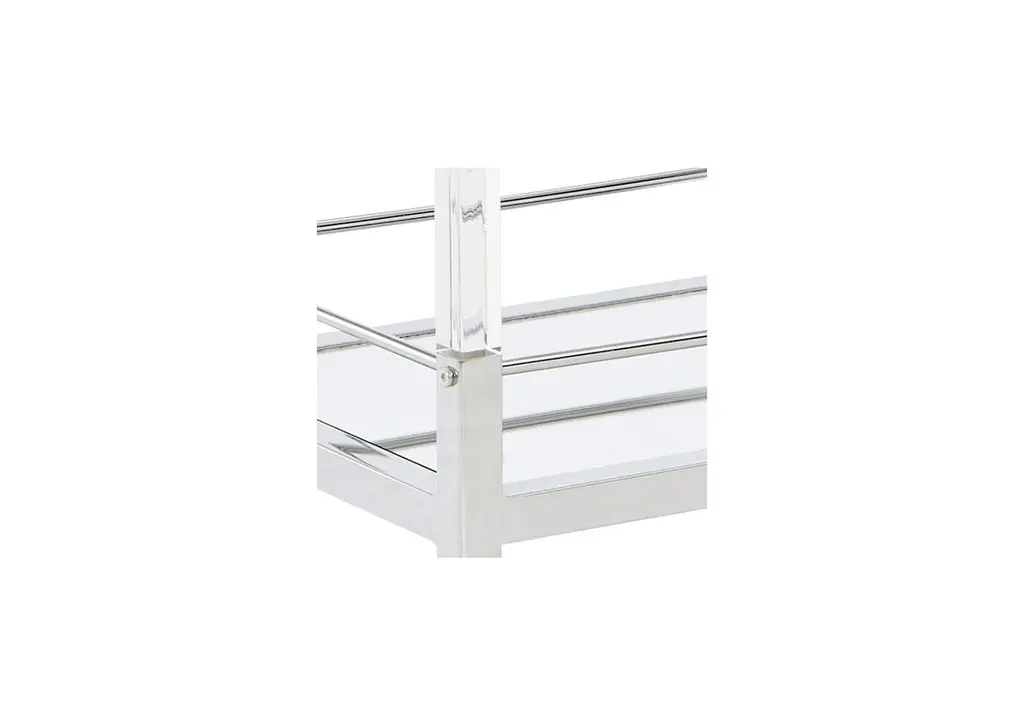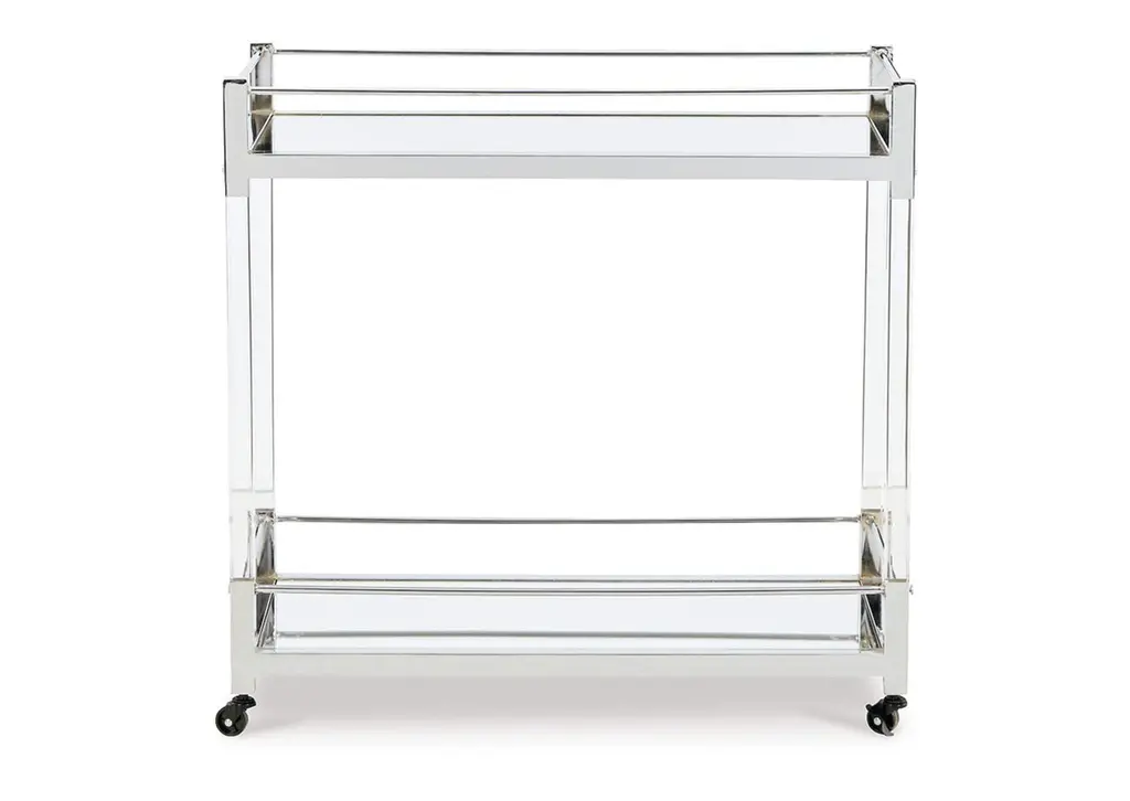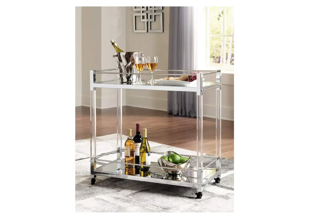 Reflect your love for contemporary style with the Chaseton bar cart. With two shelves made with mirrored glass, it adds both light and a touch of glam to your space. A clear acrylic and chrome-tone frame is a modern take on understated elegance. And thanks to rolling casters, serving your guests has never been easier. Weight 43.000 lbs. (19.35kgs.)