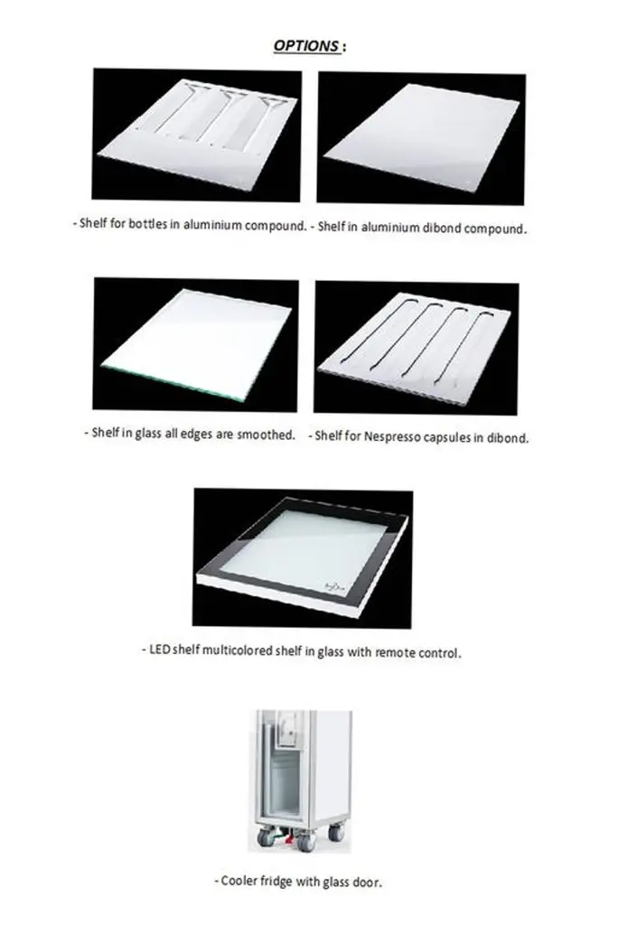 Aircraft bar trolley chrome rivet, unique design riveted chrome integral. Trolley on wheels. With 1 drawer in anodized aluminium and with 3 shelves in aluminium dibond compound material included.price: 5900,00€With optional extras for the interior of the trolley, on request:Cover plate in felt dark grey or light grey, price: 30,00 €Chopping board, price: 220,00 €Dibond aluminum top, price: 80,00 €Drawer in anodized aluminum, price: 80,00 €Drawer synthetic material, semi transparent, price: 45,00 €Cutlery tray for drawer sturdy polysyrene alu metallic, price: 30,00 €Pencil tray frame in black aluminium, price: 85,00 €Shelf for bottles in aluminium compound material, price: 80,00 €Shelf in aluminium dibond compound material, prix: 45,00€Shelf in glass all edges are smoothed, price: 60,00 €Shelf for nespresso capsules in dibond aluminum, price: 80,00 €LED shelf multicolored shelf in glass with remote control, price: 490,00 €Cooler fridge with glass door, price: 890,00 €Consult us to arrange your cart.