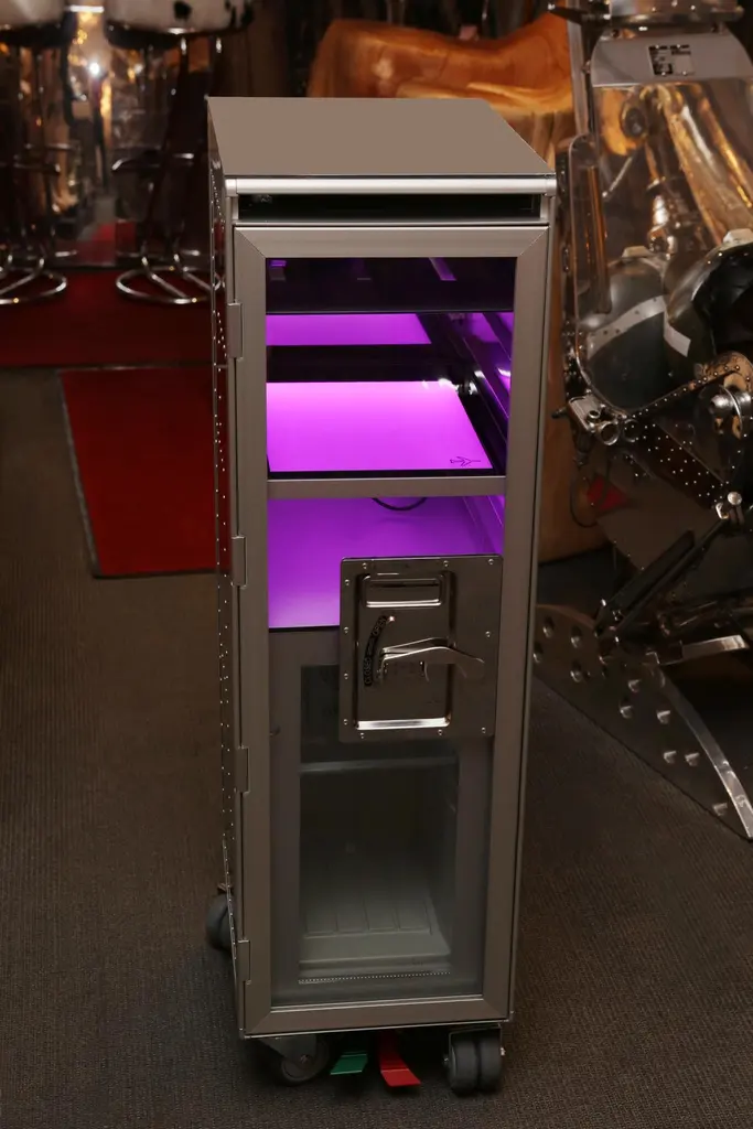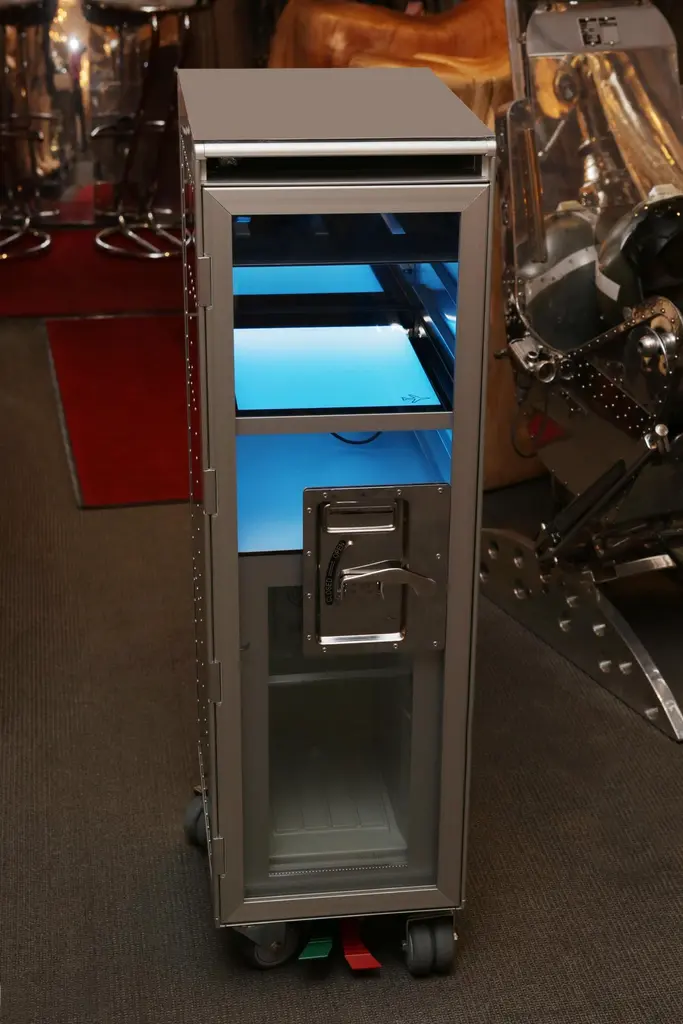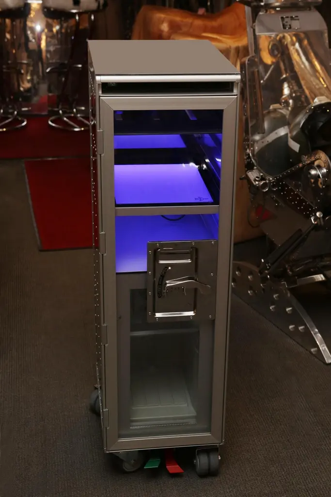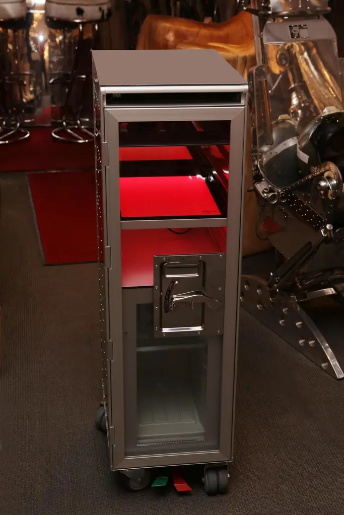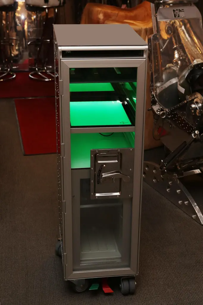 Trolley Chrome Aircraft made with steel structure in polished riveted aluminium. With wheels including a lockable system. Trolley includes a fridge and a led lighted tablet inside with color change with remote control. With 1 sliding tablet for 3 bottles range. Fridge with one door and Trolley with lockable door in transparent plexiglass.