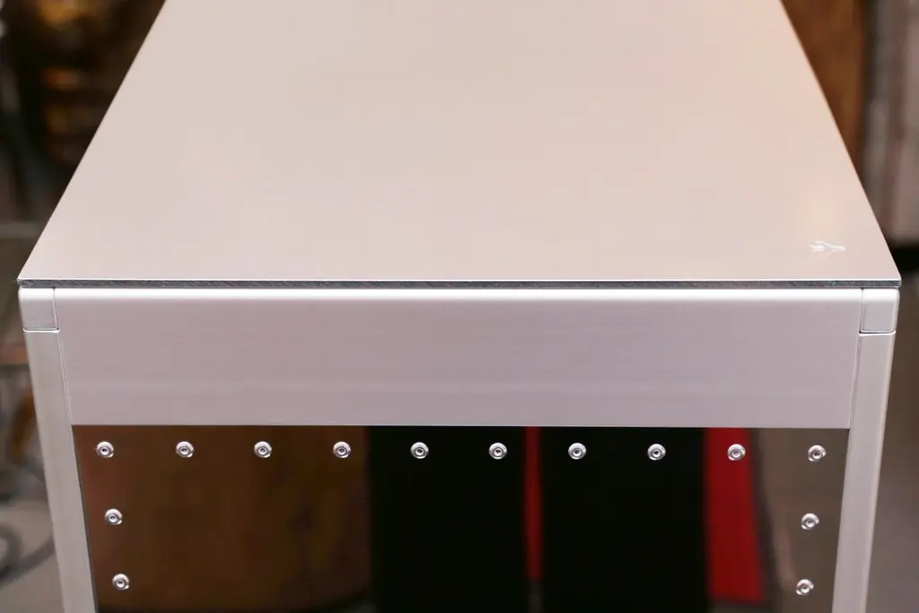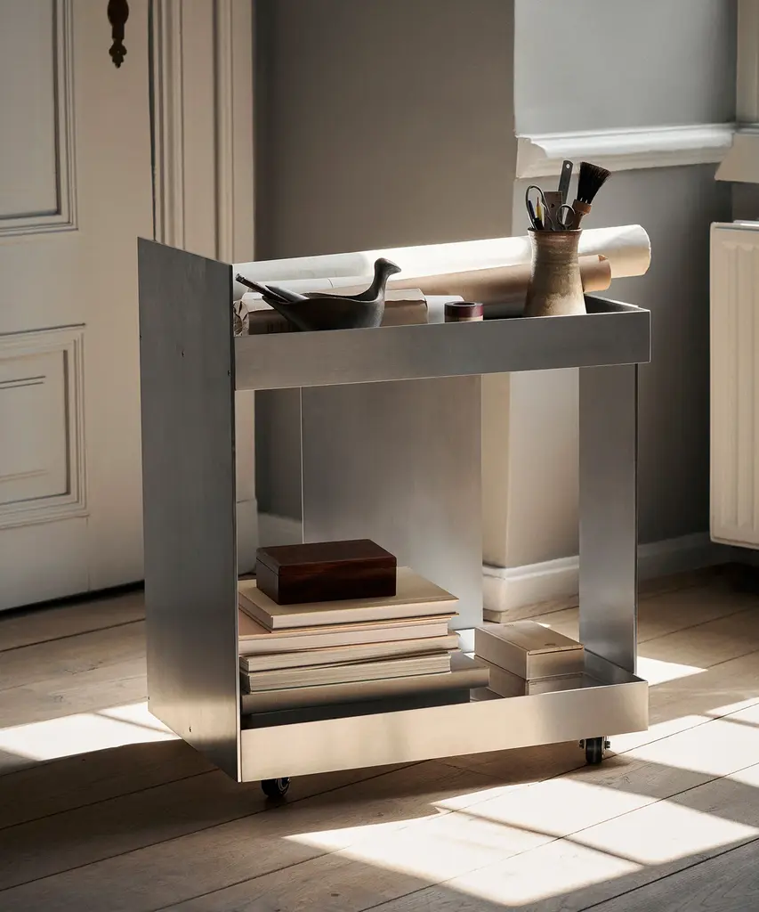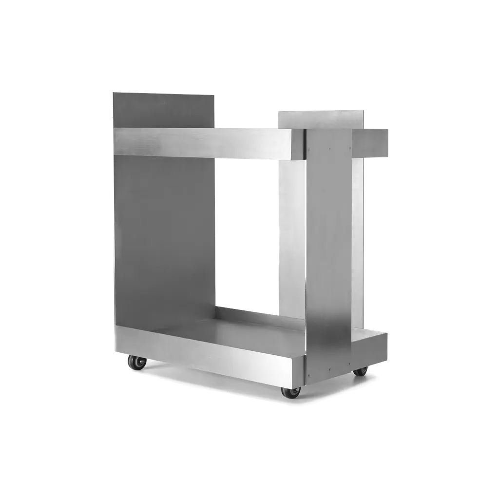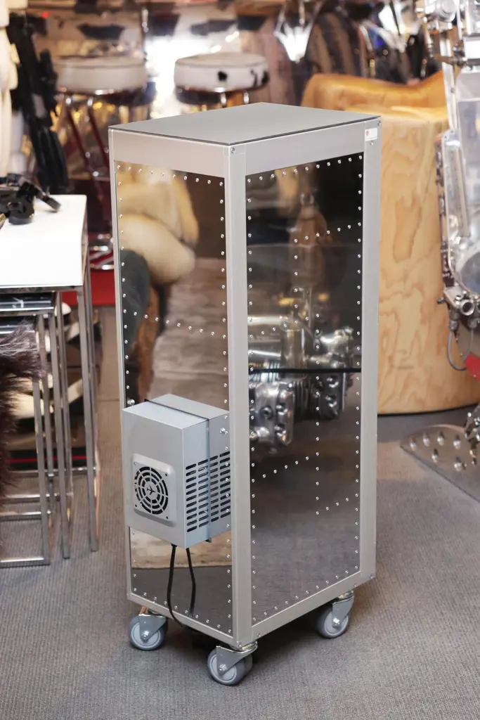 Trolley Chrome Aircraft made with steel structure in polished riveted aluminium. With wheels including a lockable system. Trolley includes a fridge and a led lighted tablet inside with color change with remote control. With 1 sliding tablet for 3 bottles range. Fridge with one door and Trolley with lockable door in transparent plexiglass.