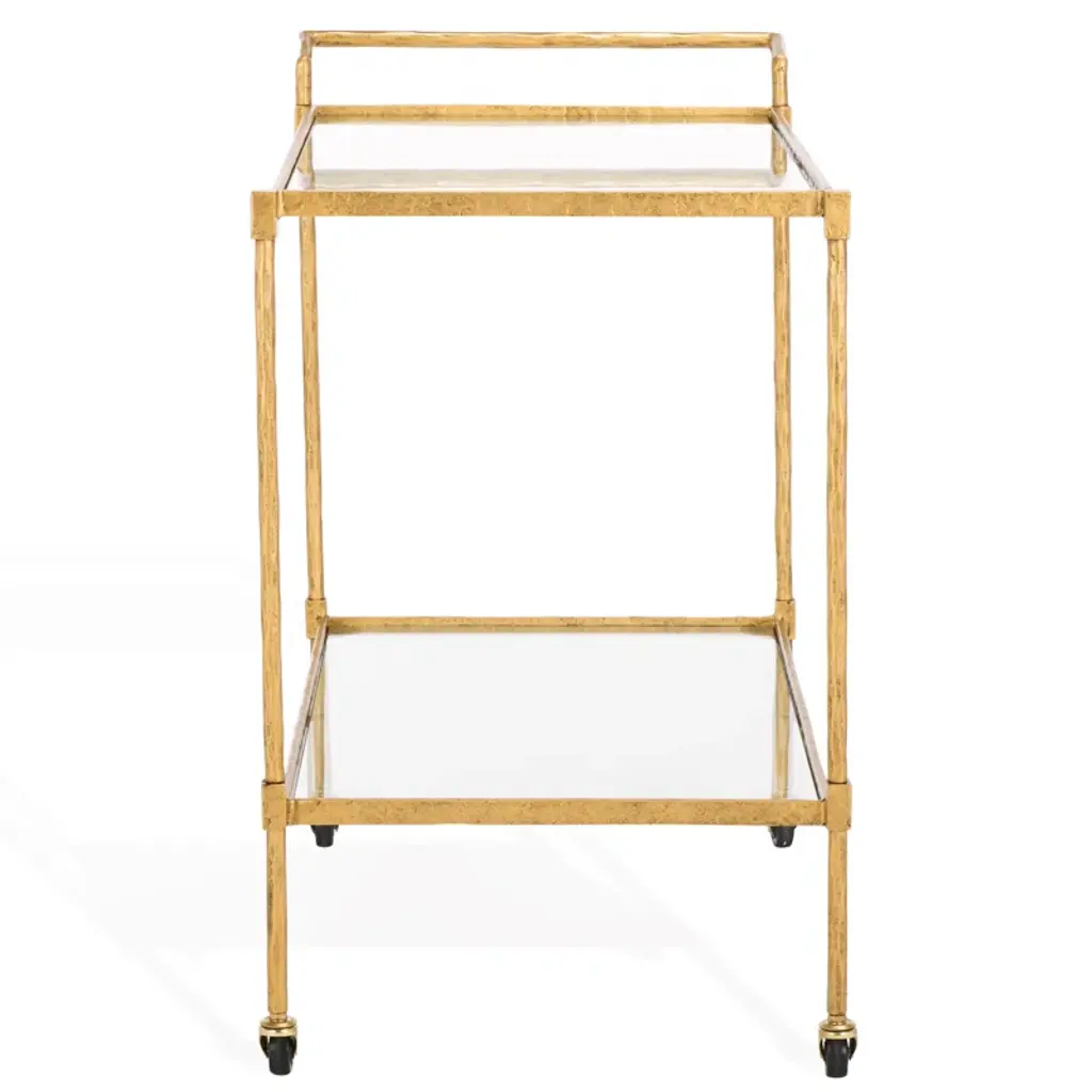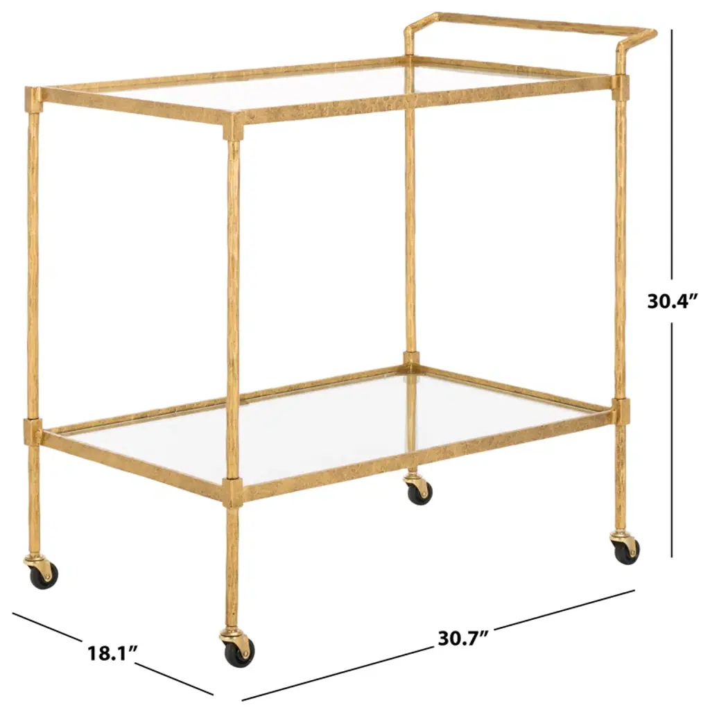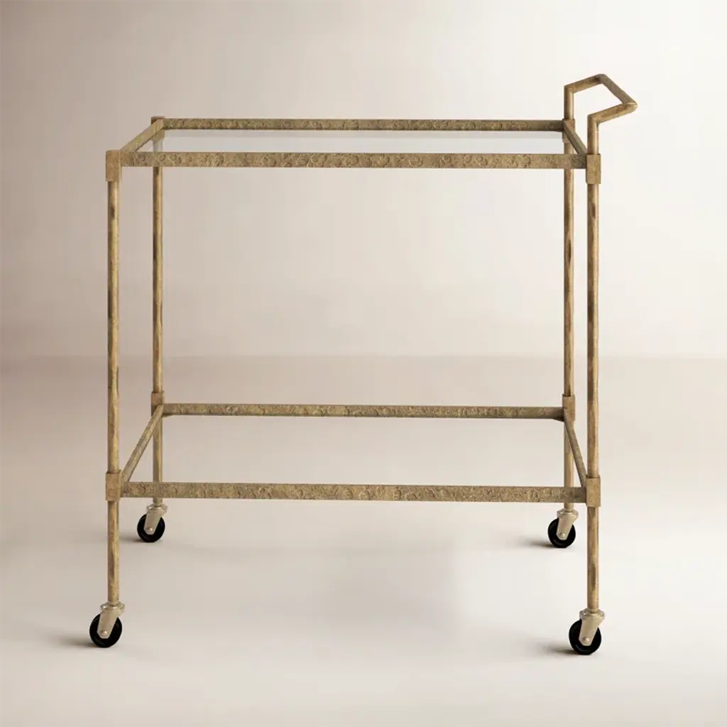 Bring a touch of elegance and sophistication to your entertainment space with our exquisite Isabellina Metal and Glass Bar Cart. Beautifully crafted from resilient iron in a timeless brass finish, offering unrivaled durability and an alluring charm. It boasts a clear, stylish glass top, making it the perfect showcase for your favorite bottles of fine liquor or wine. This Bar Cart doesn’t just offer functionality with its ample storage space, but it also adds an artistic flair to any room, turning any ordinary area into a chic, lively entertaining spot. Be it a festive cocktail party or a quiet evening with a few close friends, the Isabellina Metal and Glass Bar Cart creates an elegant atmosphere, leaving a lasting impression on all your guests. Upgrade your hosting experience today and embrace the chic lifestyle with this stunning bar cart.