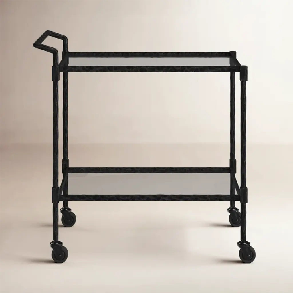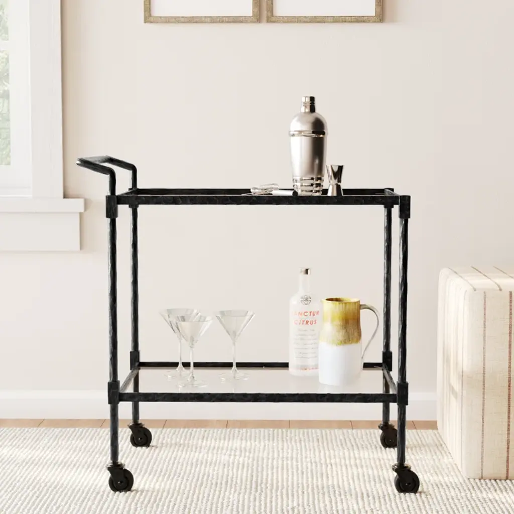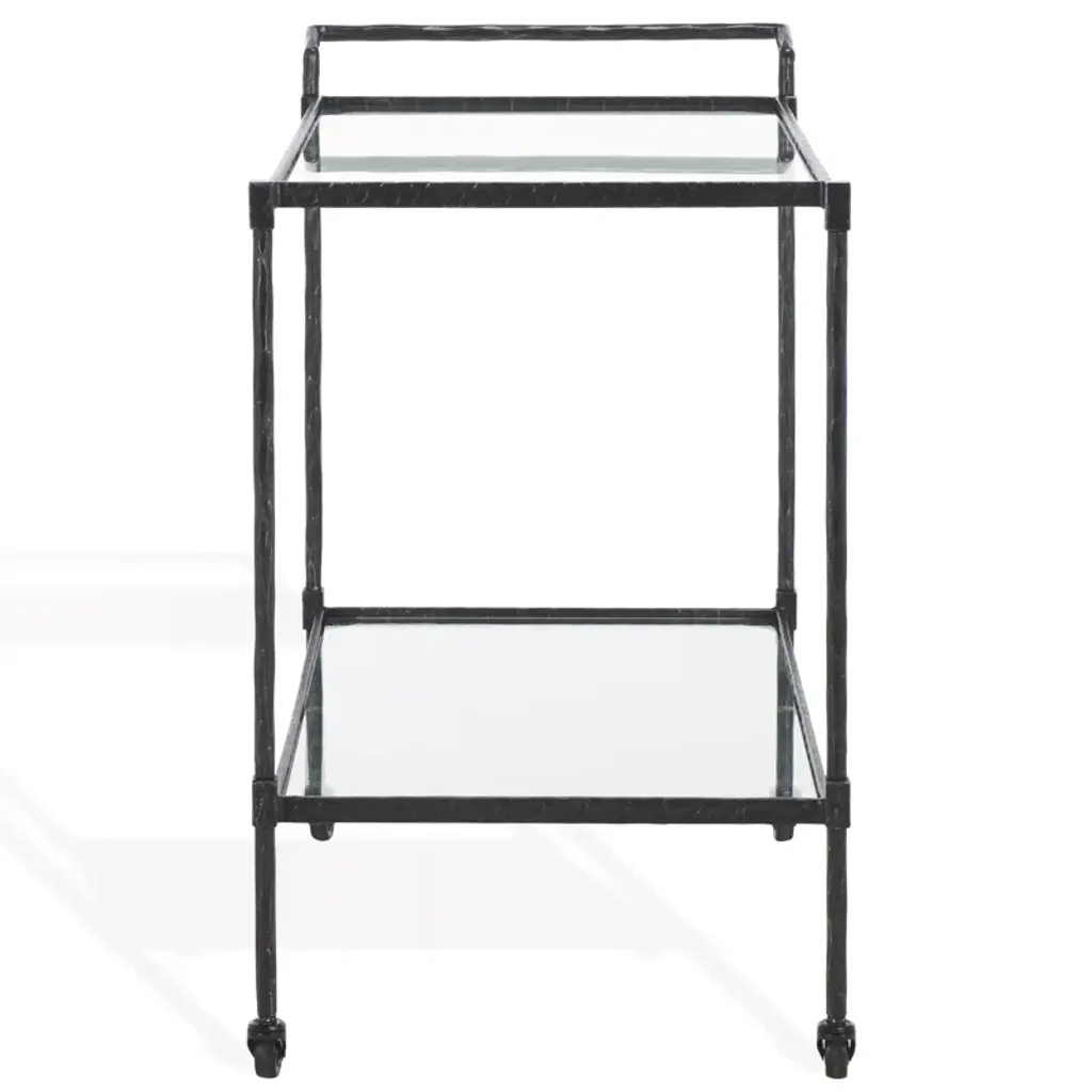 Elevate your entertaining ensemble with our Claudia Metal and Glass Bar Cart. Crafted from durable iron in a bold black finish, this exquisite bar cart exudes sophistication and elegance. The clear glass top showcases your finest liquor collection while providing a sturdy surface to mix your favorite drinks. The minimalist design seamlessly blends with any decor, from modern to traditional, making it a timeless addition to your home. The resilience of iron ensures lasting durability, while the glass top adds a touch of class and refinement. Whether for cocktail parties or casual gatherings, the Claudia Metal and Glass Bar Cart enhances your repertoire with style, convenience, and a dash of panache.