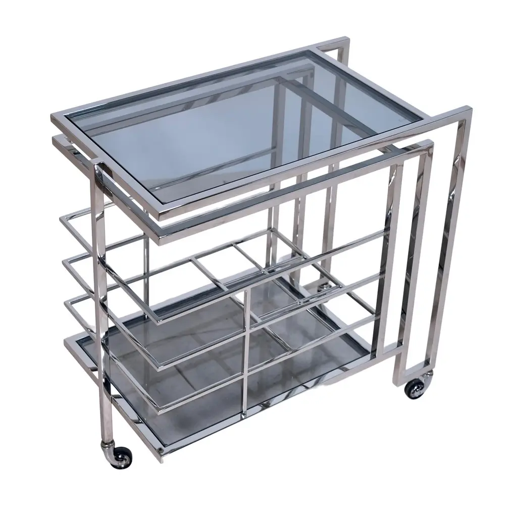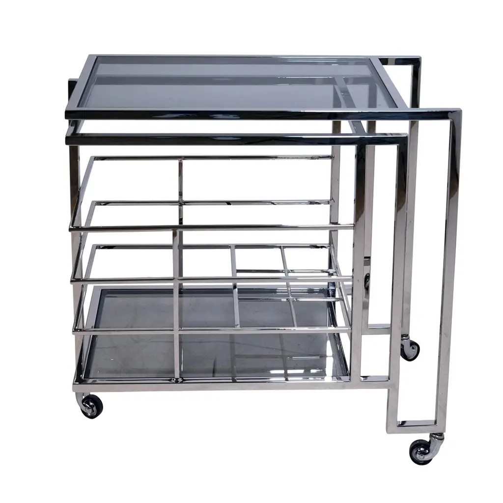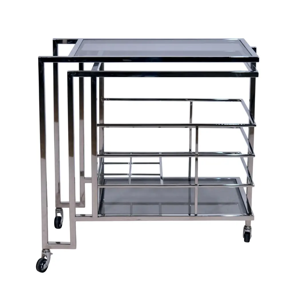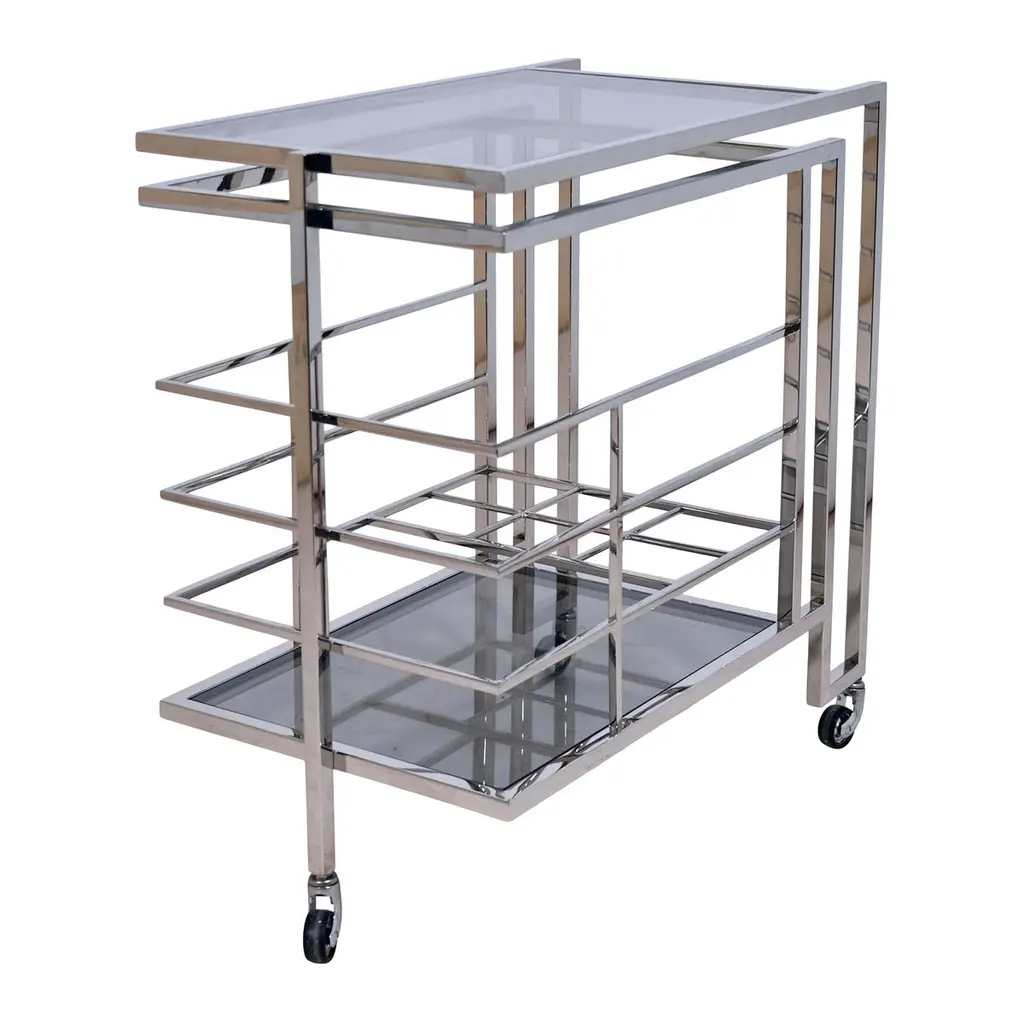 This modern bar cart, made of nickel-plated brass square tubes, is a perfect addition to your home, offering mobility and flexibility in your living room with its three wheels.The design is inspired by a strict modernist style in the spirit of Art Deco, giving the bar cart an elegant and contemporary aesthetic. With its clean lines and shiny finish, it becomes a focal point in your home. The bar cart provides ample space for storing bottles, cocktail glasses, and other bar utensils, making it a practical and stylish companion for your home. Whether you're treating your guests to exquisite cocktails or simply want a selection of drinks readily available, this bar cart is the ideal solution.