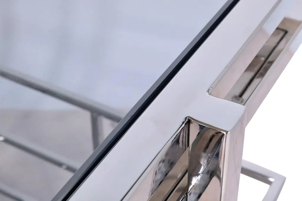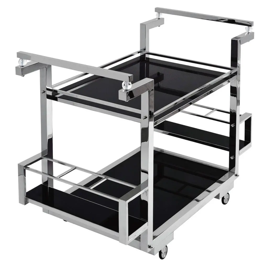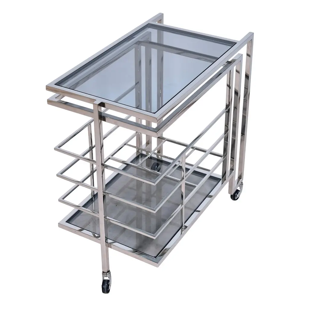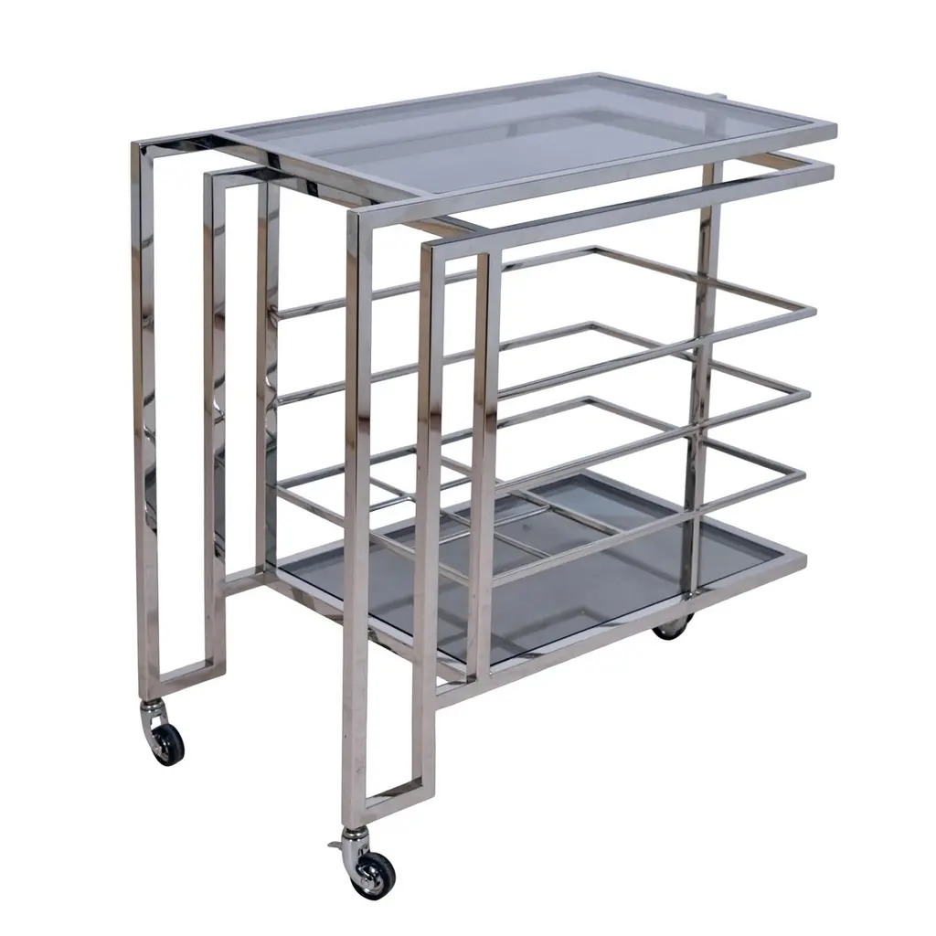 This modern bar cart, made of nickel-plated brass square tubes, is a perfect addition to your home, offering mobility and flexibility in your living room with its three wheels.The design is inspired by a strict modernist style in the spirit of Art Deco, giving the bar cart an elegant and contemporary aesthetic. With its clean lines and shiny finish, it becomes a focal point in your home. The bar cart provides ample space for storing bottles, cocktail glasses, and other bar utensils, making it a practical and stylish companion for your home. Whether you're treating your guests to exquisite cocktails or simply want a selection of drinks readily available, this bar cart is the ideal solution.