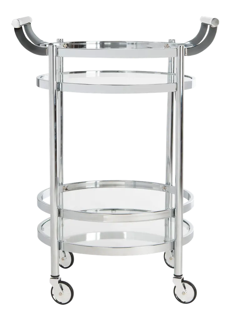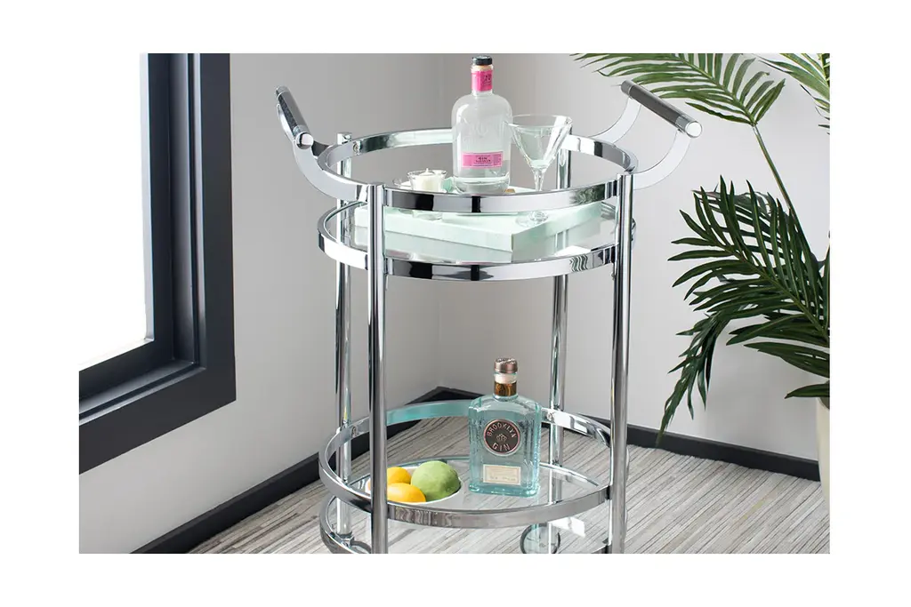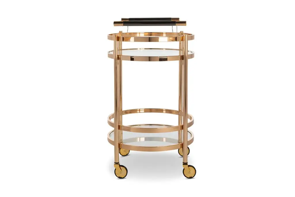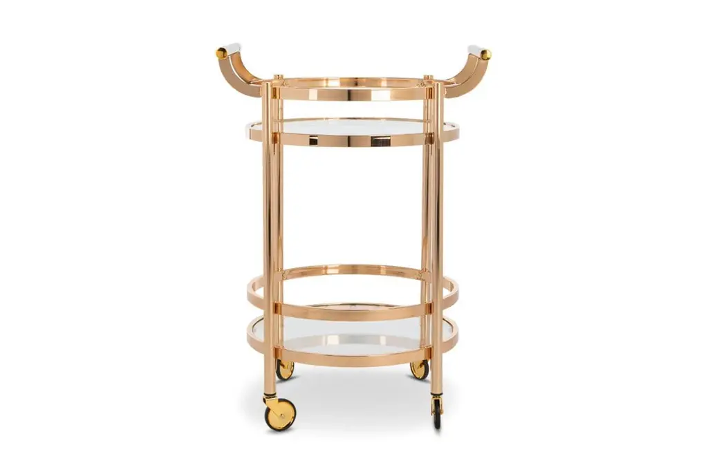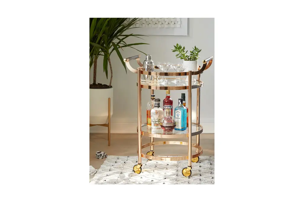 Designed with sleek, stylish curves, the Cosmo Bar Cart ensures easy entertaining in any room. Its two glass layers and shimmering gold finish create a stunning showcase for glasses and barware, making it a must-have for the modern host.