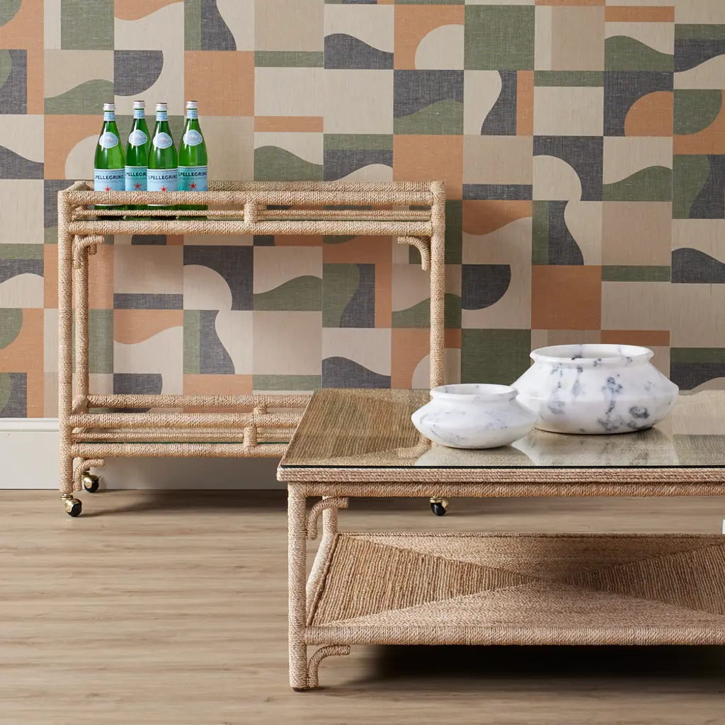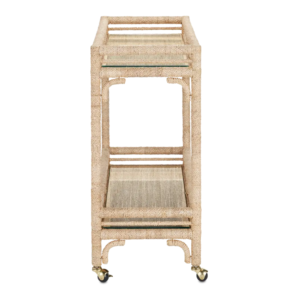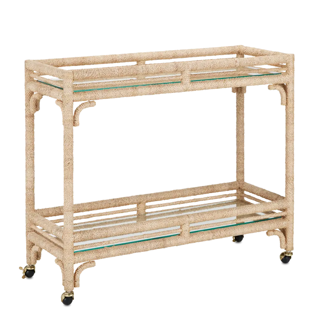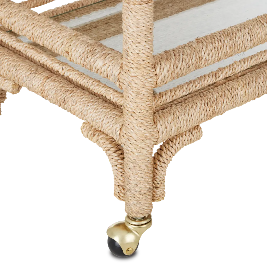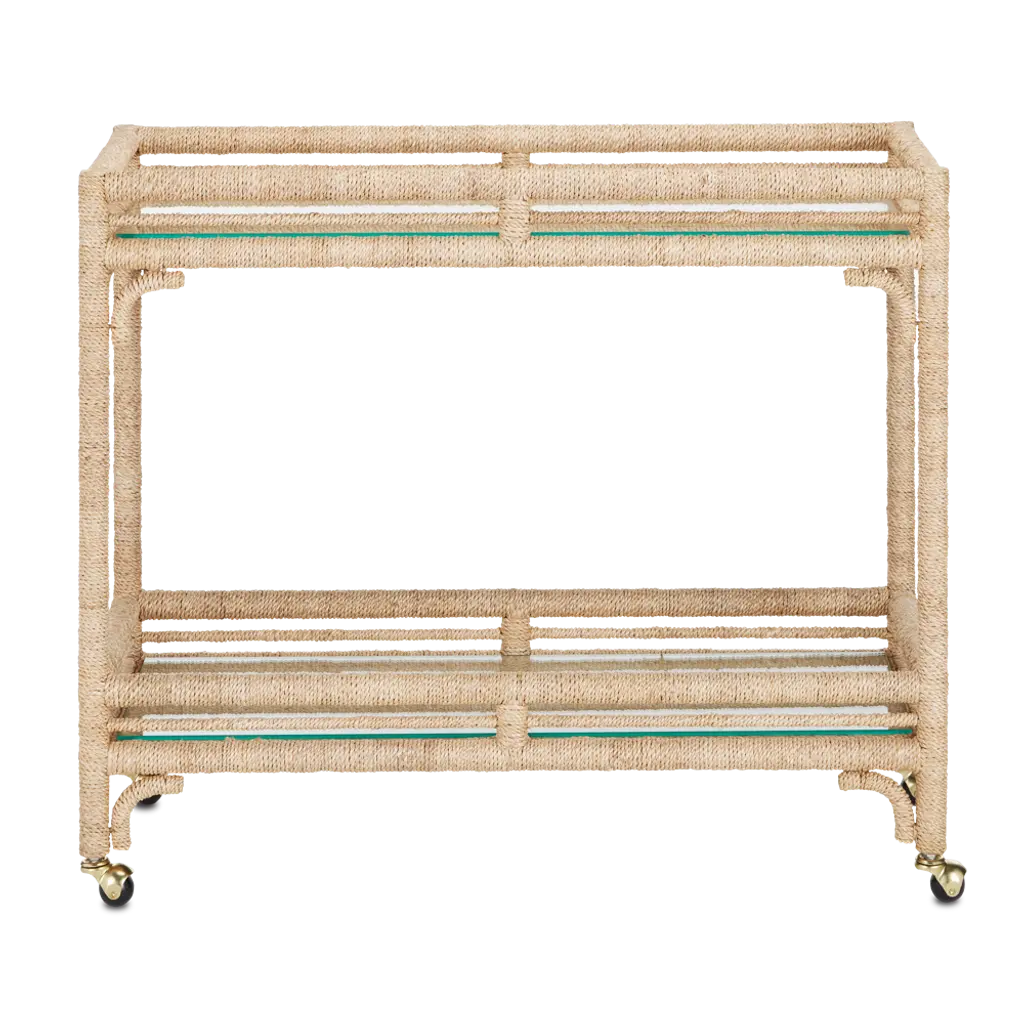 With the earthy feel of rattan and wicker, the Olisa Bar Cart is covered in braided abaca rope to bring a natural elegance to a room. The dexterity required to wrap a piece of furniture so skillfully makes this tan bar cart special. Glass inserts on the upper and lower shelves protect the absorbent material from liquid that would stain it if spilled drinks and spritzes of fruit escaped their intended glasses. The roller feet make this happy hour helpmate easy to move around, and it is narrow enough to place in hallways. Additional Materials: Glass Care Instructions: Wipe with clean cloth