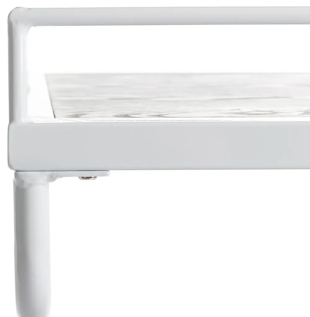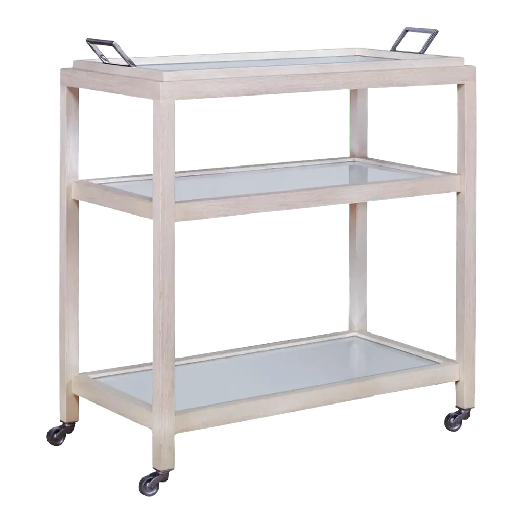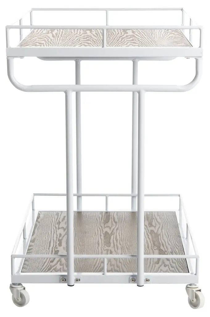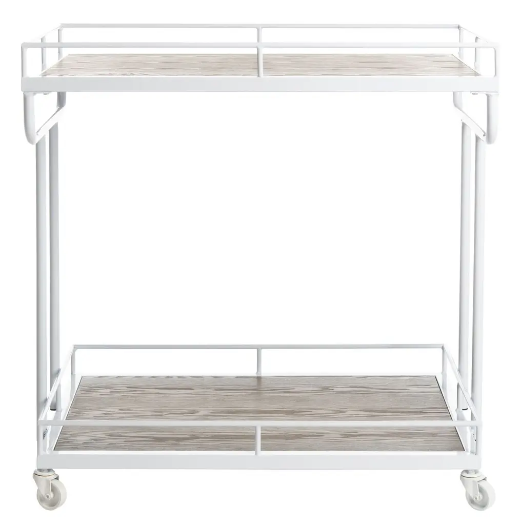 Crafted of steel with an impressive openwork design, this bar cart lends retro style to any home bar. We love how the clean white frame is beautifully offset by two rustic oak surfaces. Caster wheels allow for easy mobility and protect floors from scratching and marring.