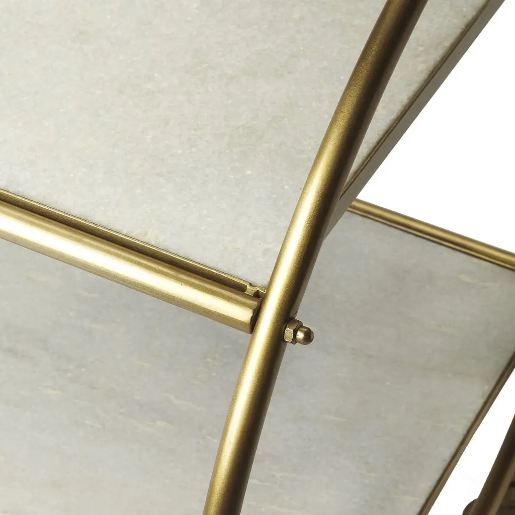 Create a home bar that exudes both style and functionality with this captivating cart. Designed with four castered feet, it glides effortlessly between spaces, making it perfect for entertaining. The circular frame, crafted with exquisite detail, supports two tiers that offer a sophisticated platform for showcasing your finest decanters and culinary delights. This piece is not just a bar cart; it's a statement of elegance and charm, inviting you to serve and display with grace.