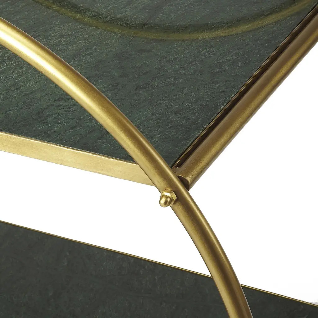 Create a home bar that exudes both style and functionality with this captivating cart. Designed with four castered feet, it glides effortlessly between spaces, making it perfect for entertaining. The circular frame, crafted with exquisite detail, supports two tiers that offer a sophisticated platform for showcasing your finest decanters and culinary delights. This piece is not just a bar cart; it's a statement of elegance and charm, inviting you to serve and display with grace.