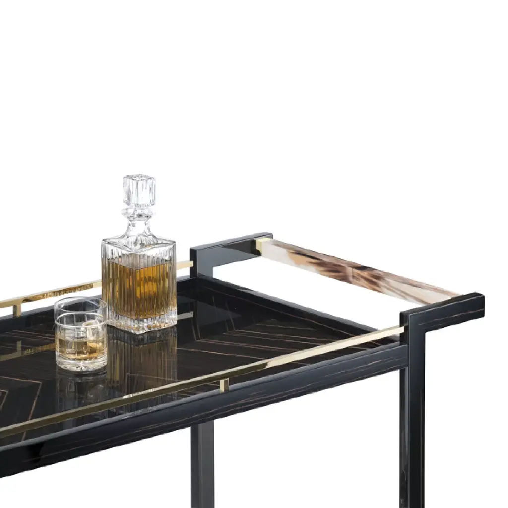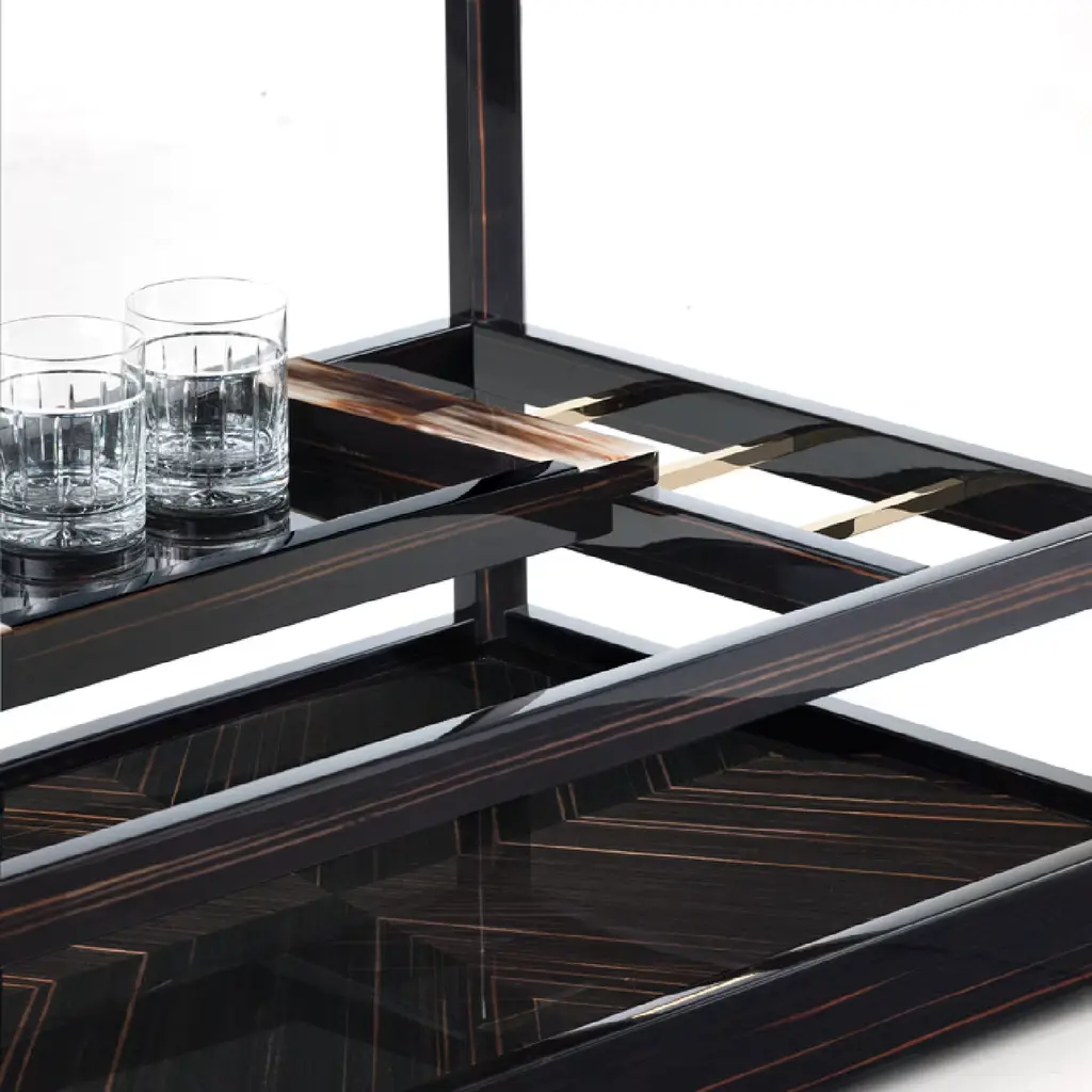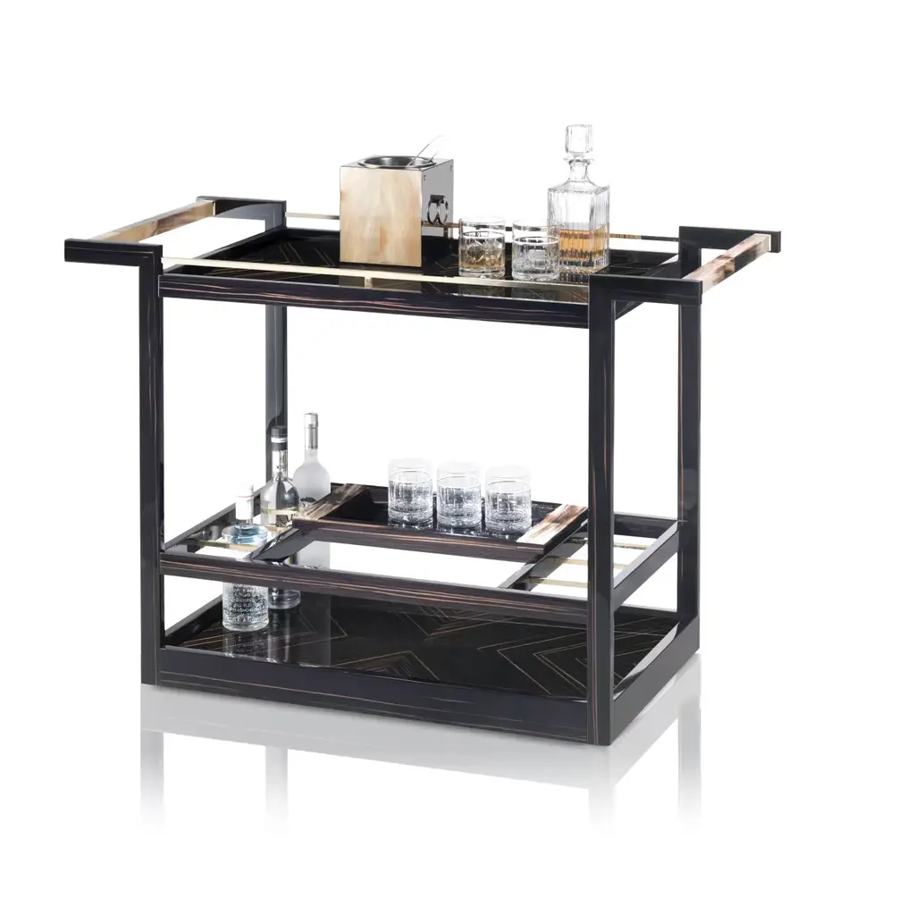 Set atop hidden rubber wheels, this opulent bar cart boasts a trio of shelves that provide ample storage from top to bottom. The glossy finish of the macassar ebony highlights the geometric pattern of the surface, adding a regal feel of the entire piece. Three tiers of open shelving provide display and storage for fine vintage collections, glasses, barware, and bartender tools. The top shelf has two 24k gold-plated brass gallery rails and two distinctive handles in natural horn. A chic addition to any space for formal entertaining, this cart is a stunning focal point for any room.