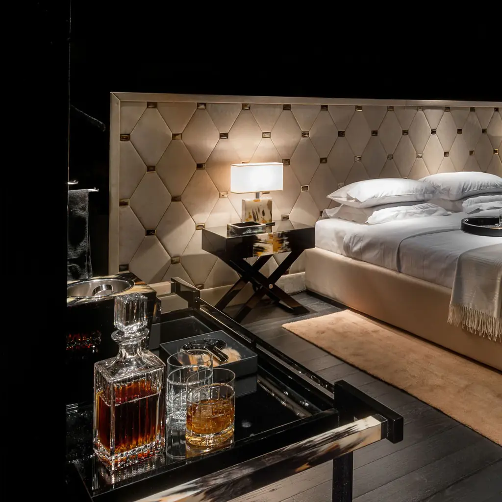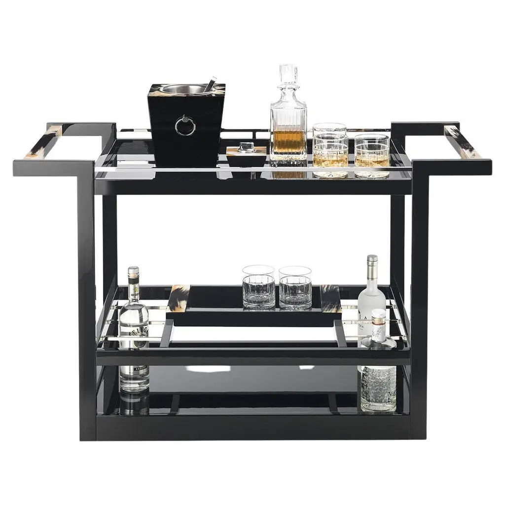 Elevate your home entertaining game with the Elia Trolley from Arcahorn. The sleek glossy ebony structure, adorned with exquisite horn details, exudes timeless sophistication. With two 24k gold plated brass bottle racks and a removable serving tray in stunning horn and ebony veneer, this trolley effortlessly combines practicality and elegance. Highlights