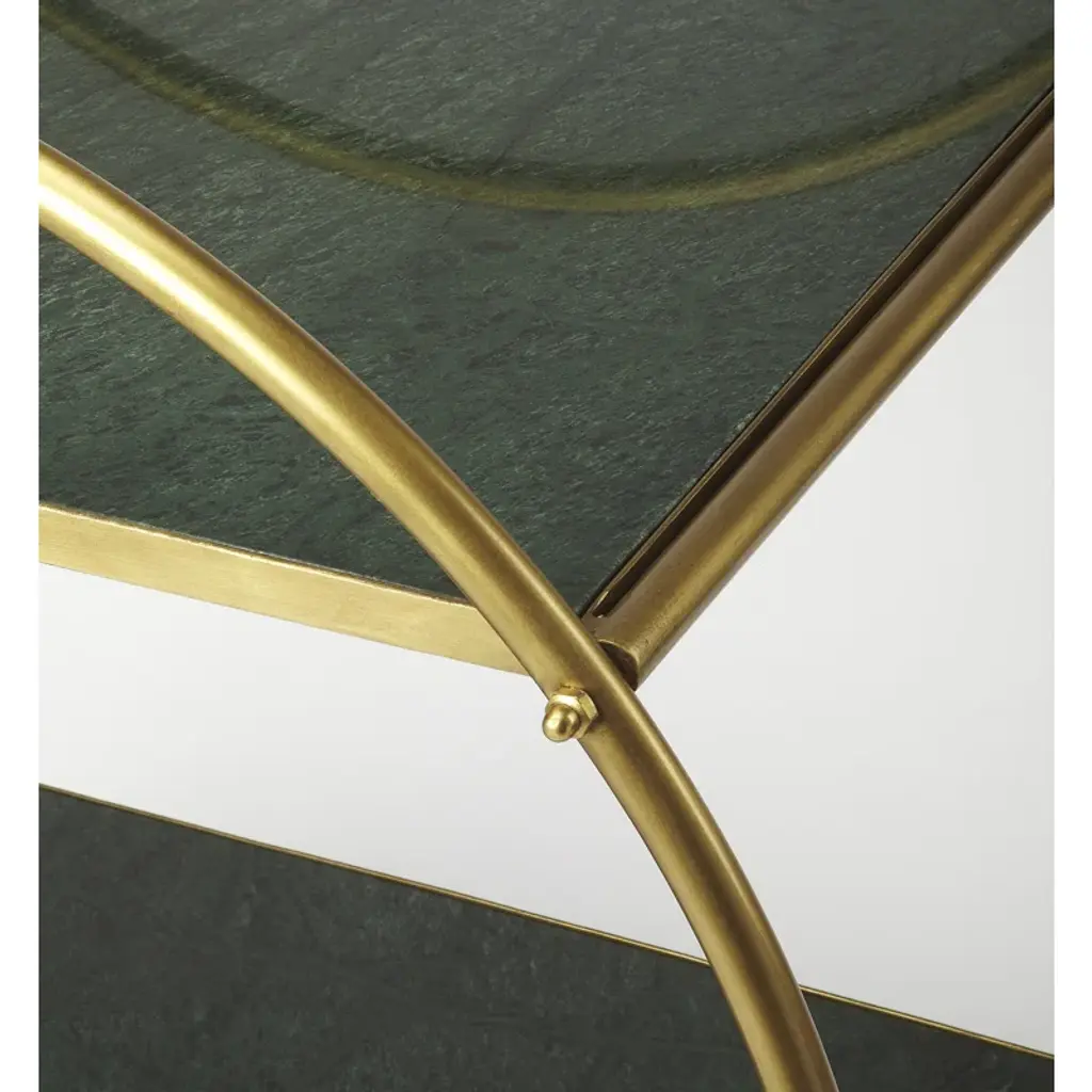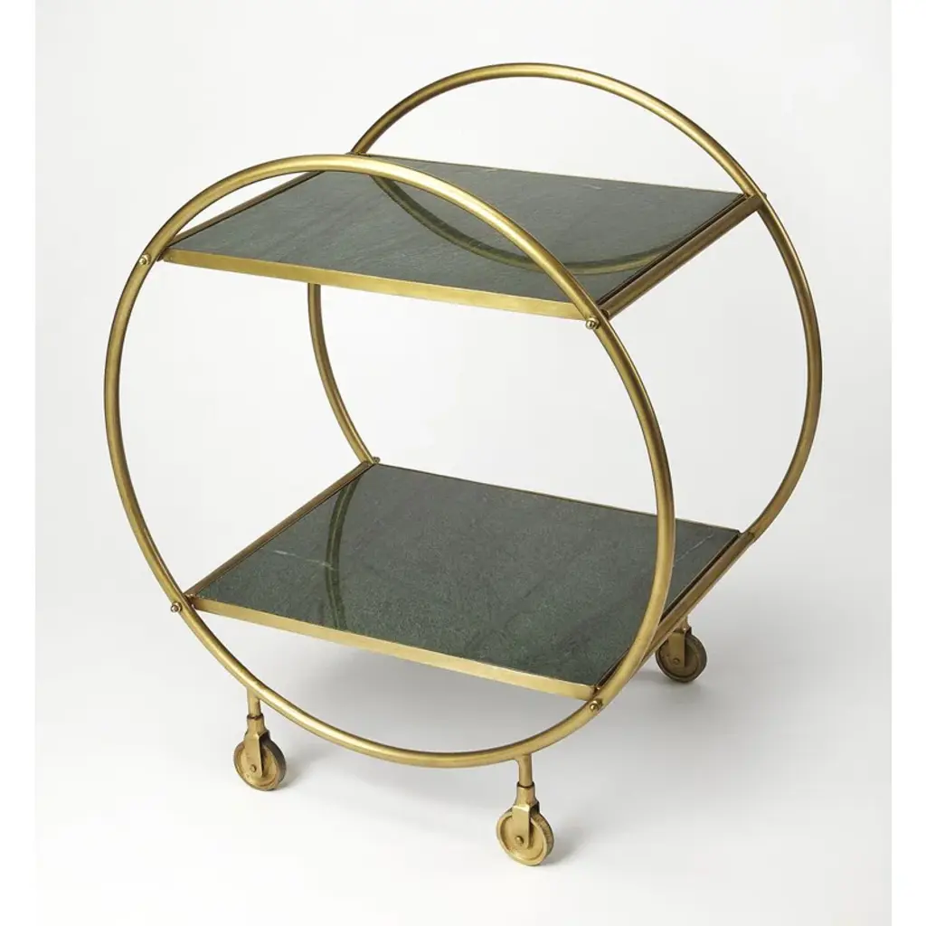 Add a pop of sophistication to any space. Classic white marble lays three tiers of smooth shelving for plenty of space. Antique brass frame and casters place a feminine spin on bar styling.