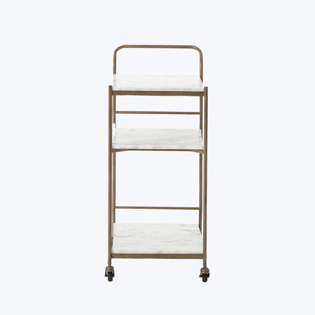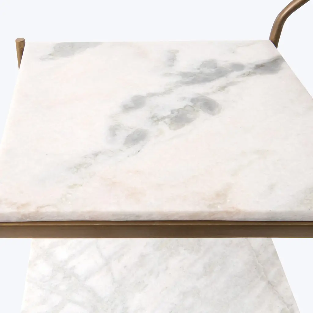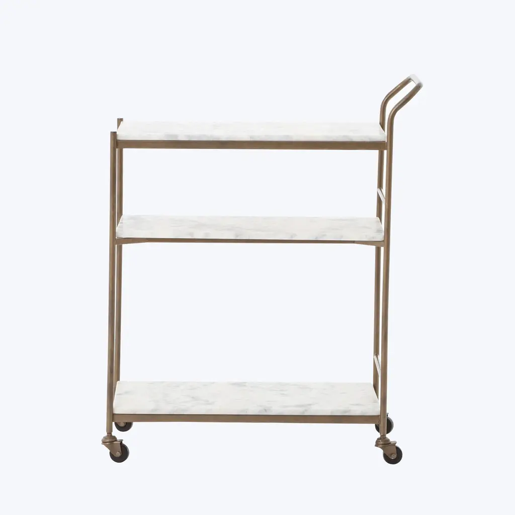 The Four Hands Felix Bar Cart, crafted from iron and solid marble, brings a touch of sophistication to any room. With dimensions of 16" W x 19" D x 38.5" H and a weight of 52.91 lb, itÕs designed to impress with three sleek marble shelves that provide ample space for your bar essentials or decorative items. The antique brass frame, complemented by smooth casters, adds a refined, feminine touch to this modern piece.Made in India, the Four Hands Felix Bar Cart combines timeless materials and a versatile design, effortlessly enhancing your living space. Its durable construction and elegant detailing make it not only a functional addition but a statement piece that elevates your home decor.