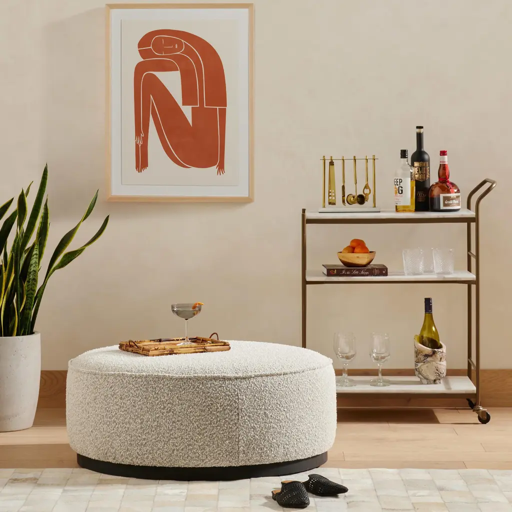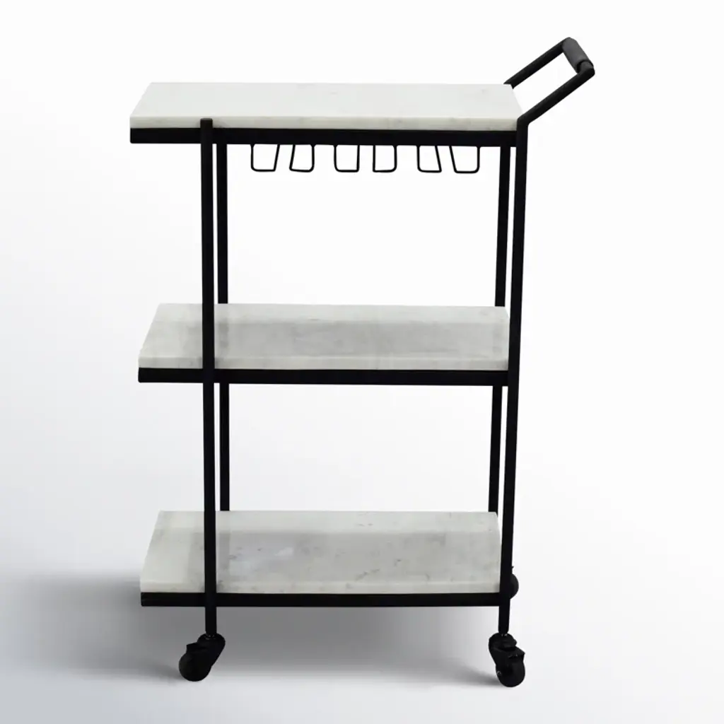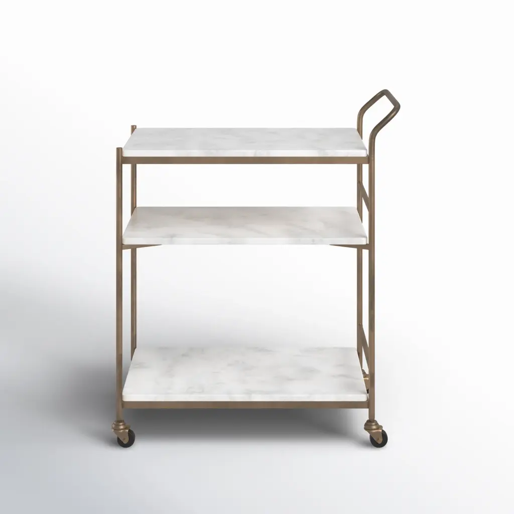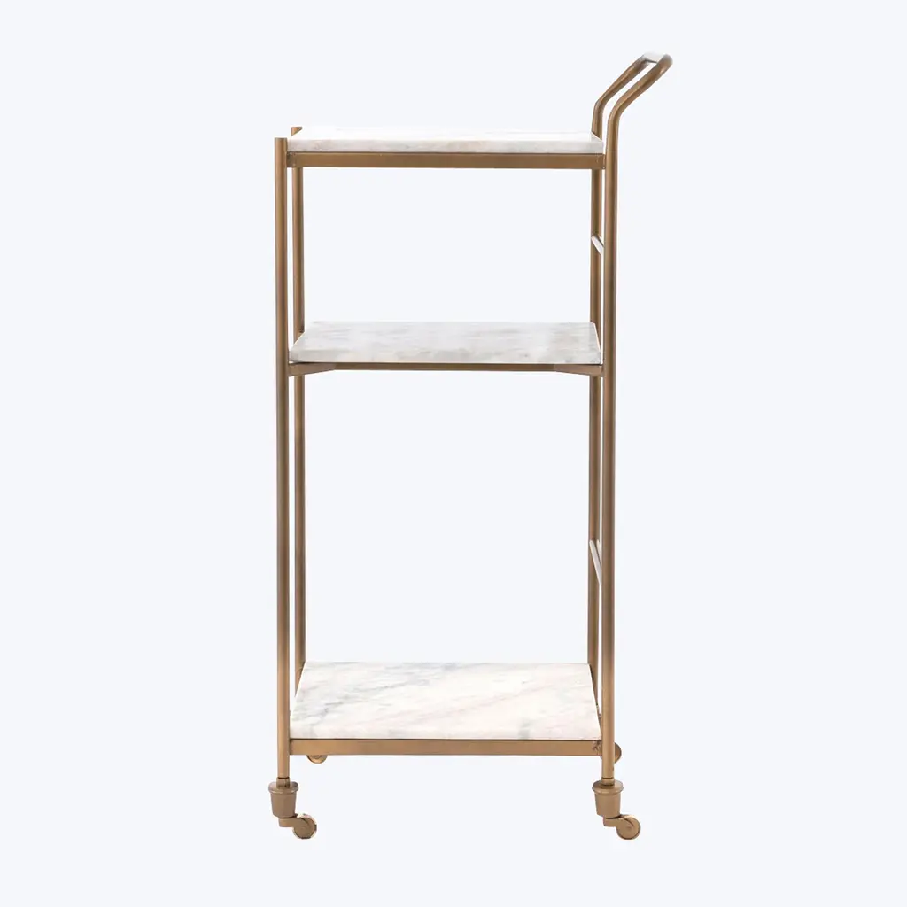 The Four Hands Felix Bar Cart, crafted from iron and solid marble, brings a touch of sophistication to any room. With dimensions of 16" W x 19" D x 38.5" H and a weight of 52.91 lb, itÕs designed to impress with three sleek marble shelves that provide ample space for your bar essentials or decorative items. The antique brass frame, complemented by smooth casters, adds a refined, feminine touch to this modern piece.Made in India, the Four Hands Felix Bar Cart combines timeless materials and a versatile design, effortlessly enhancing your living space. Its durable construction and elegant detailing make it not only a functional addition but a statement piece that elevates your home decor.
