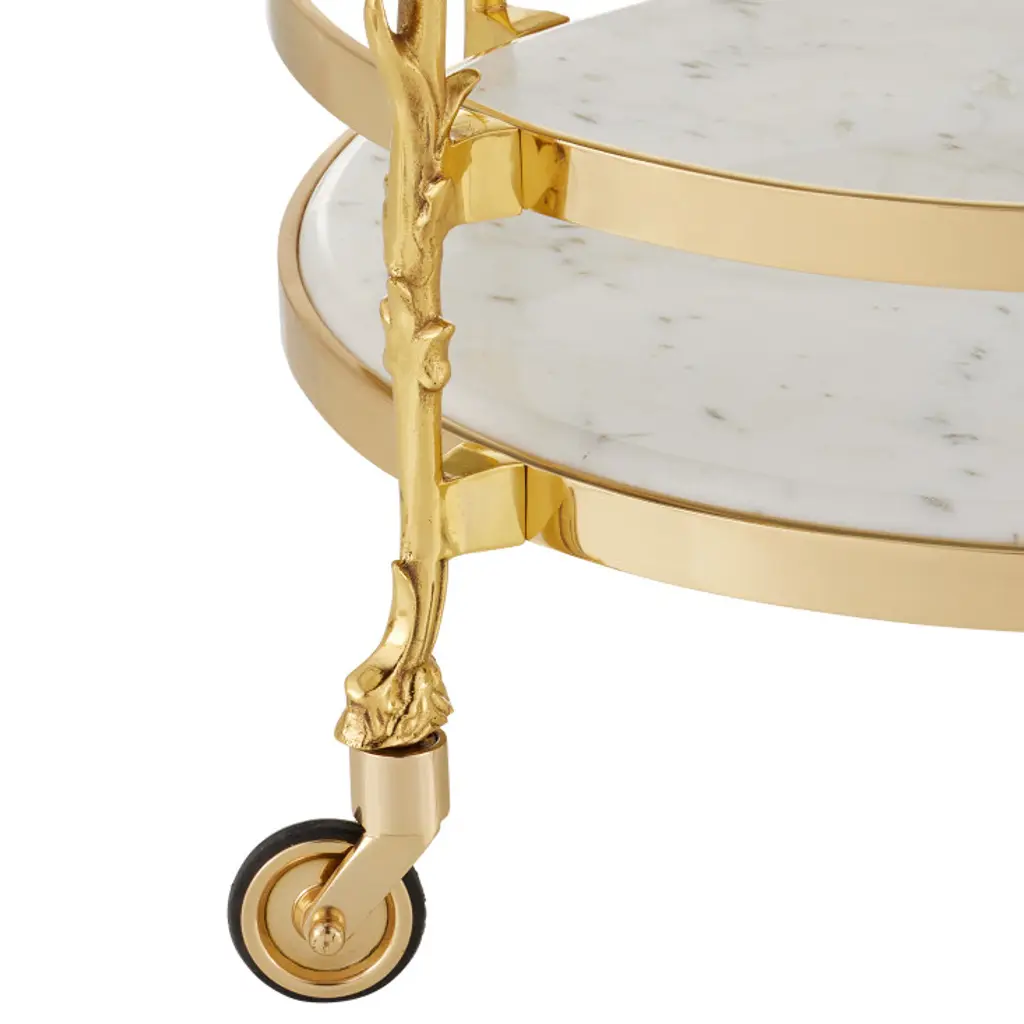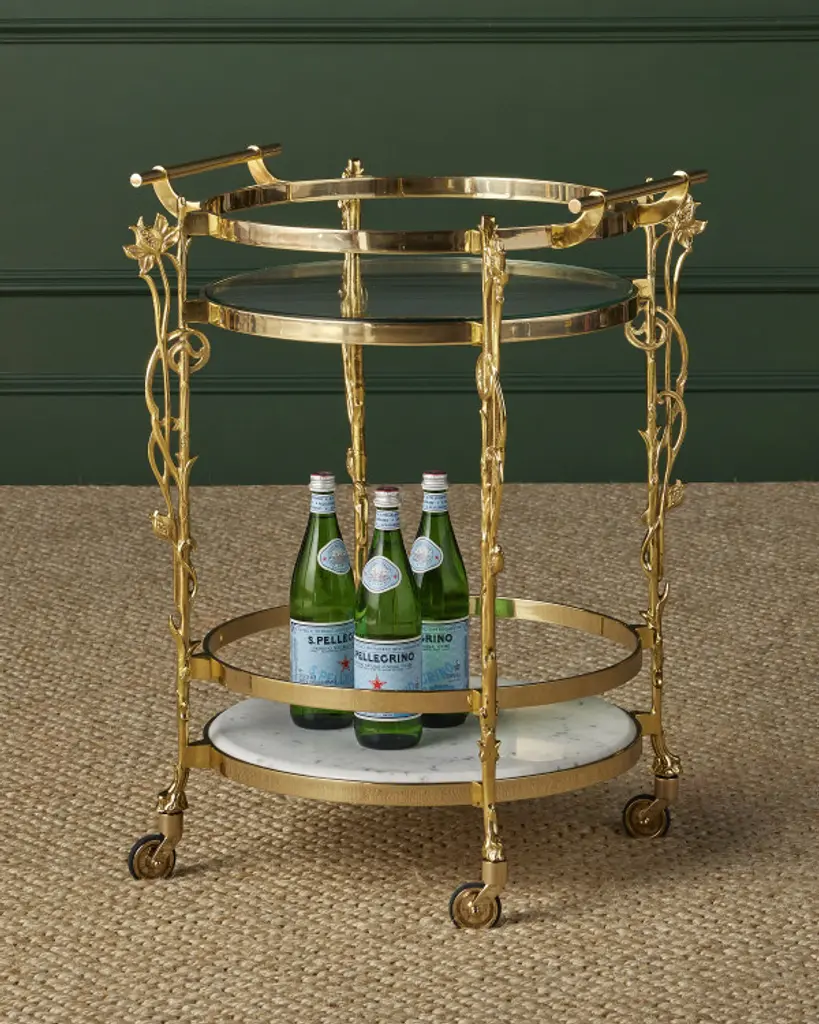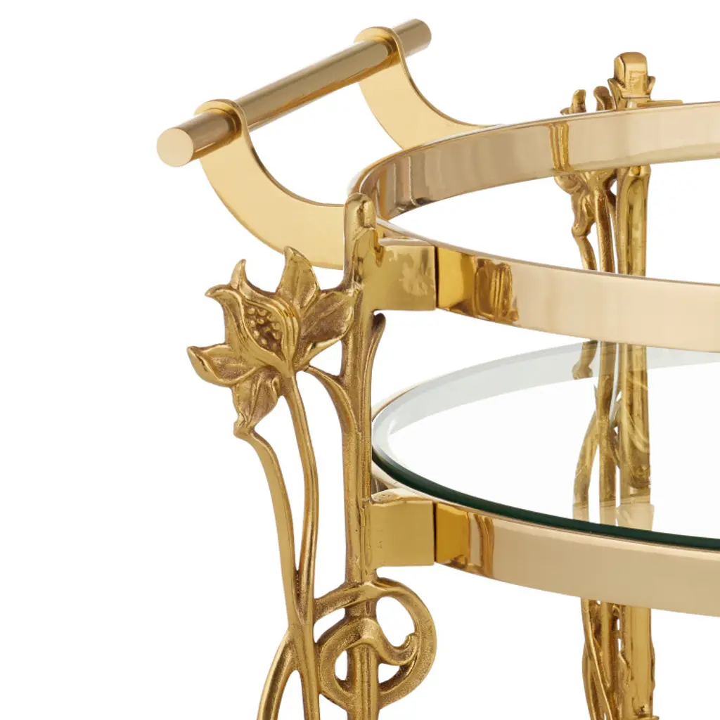 Reflecting its beautiful name, which means flower in Italian, the Fiore Bar Cart has lovely floral motifs flowing up each of its legs toward a metal band into which a glass top is inset. Just above the graceful ball-shaped feet fitted with non-marring casters sits a natural white marble shelf, the stone a crisp contrast to the luminous polished brass finish.