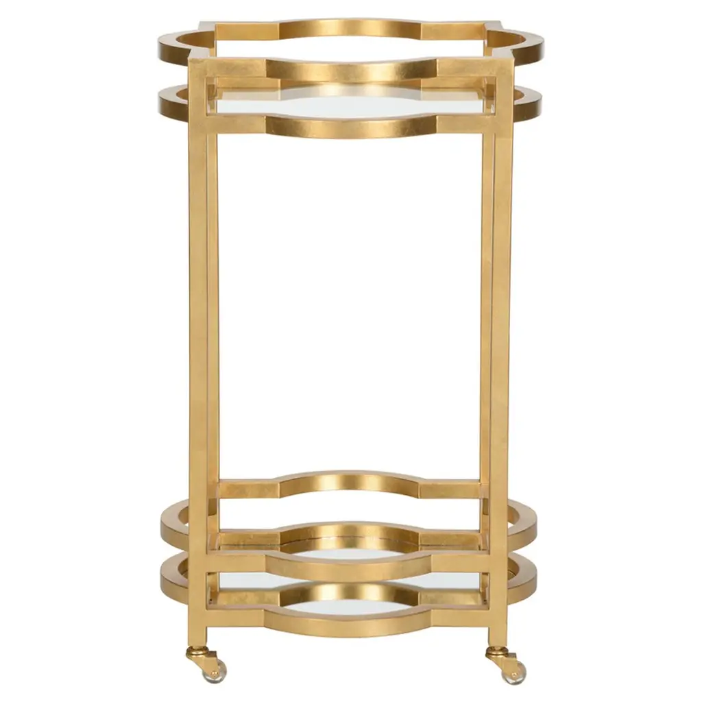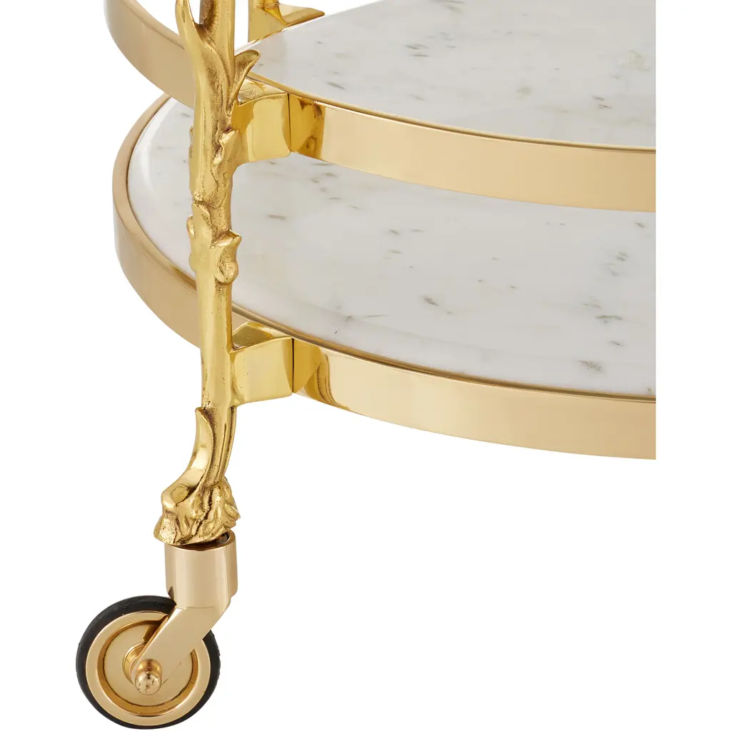 Reflecting its beautiful name, which means flower in Italian, the Fiore Bar Cart has lovely floral motifs flowing up each of its legs toward a metal band into which a glass top is inset. Just above the graceful ball-shaped feet fitted with non-marring casters sits a natural white marble shelf, the stone a crisp contrast to the luminous polished brass finish.
