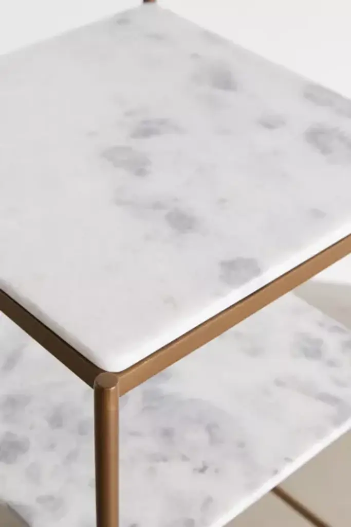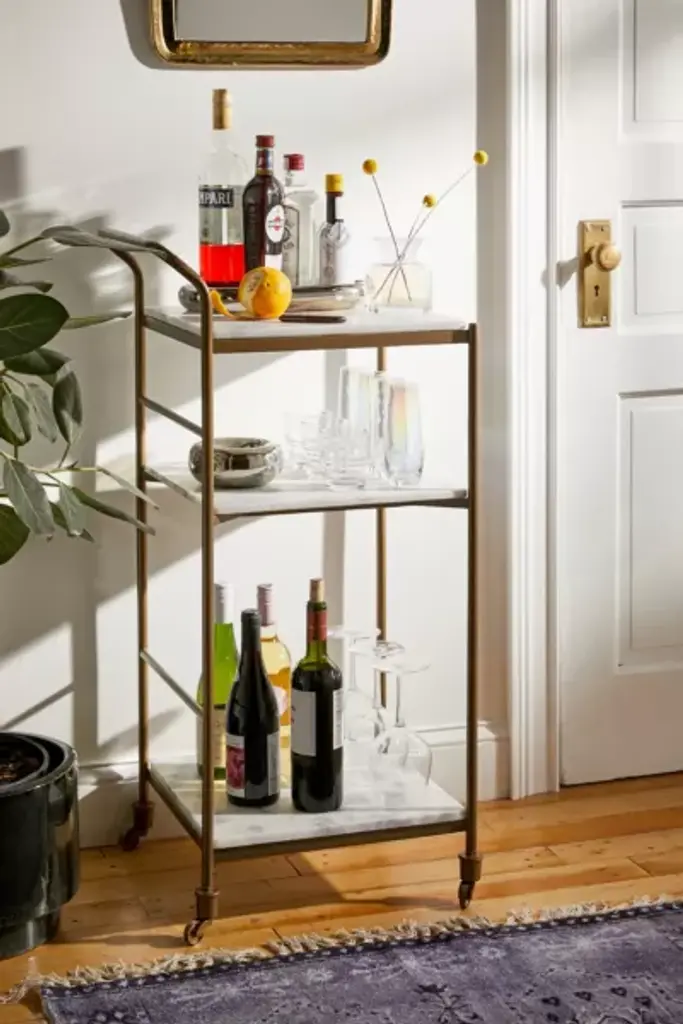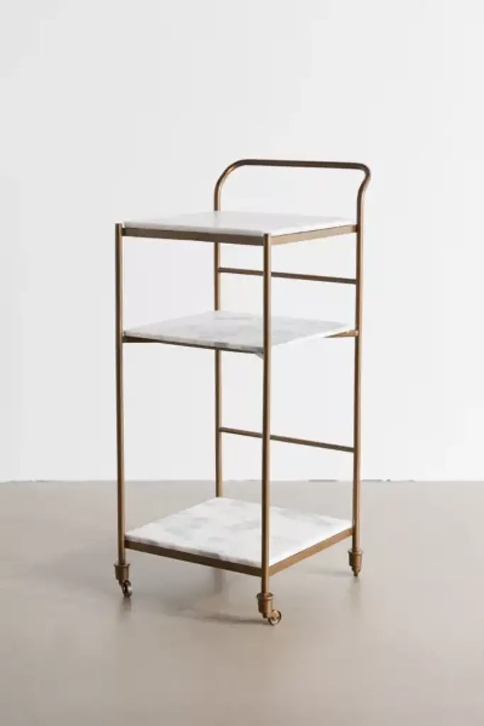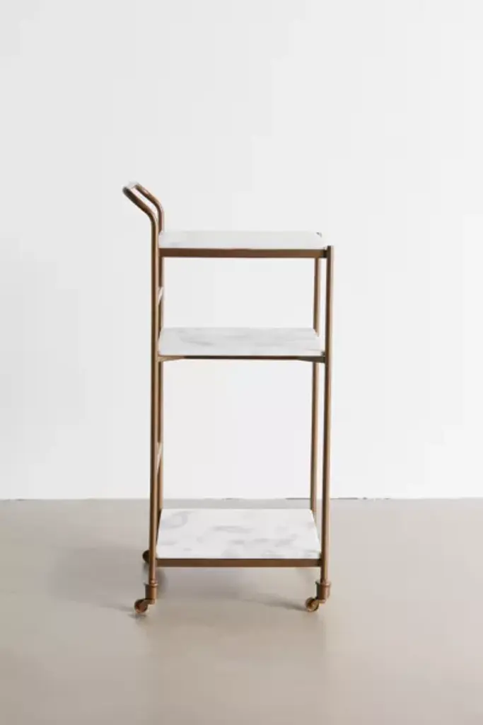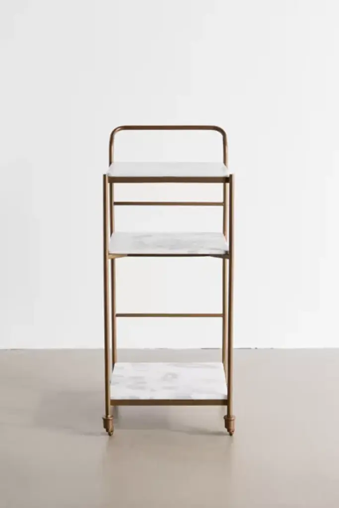 Have a seriously chic moment every time you host cocktails from this marble-paned bar cart. Framed in aluminum with an antiqued brass finish, topped with a trio of marble tiered shelves. Finished with a wheeled base and push handle. **Features** \- Frances Marble Bar Cart \- Three marble shelves \- Antiqued brass framing \- Wheeled base **Content + Care** \- Aluminum, marble \- Wipe clean \- Imported **Size** \- Dimensions: 18.5"l x 16.5"w x 36.5"h \- Shelf dimensions: 16.5"l x 14.5"h \- Shelving weight limit: 80 lbs \- Leg height: 4.25" \- Weight: 52.91 lbs Ships in 2 packages \- Shipping package 1 dimensions: 19.75"l x 19.75"w x 41.5"h \- Shipping package 1 weight: 22.6 lbs \- Shipping package 2 dimensions: 21.5"l x 22"w x 8.75"h \- Shipping package 2 weight: 52.91 lbs