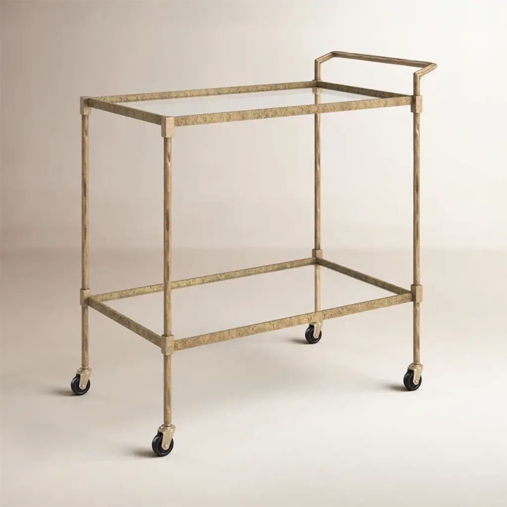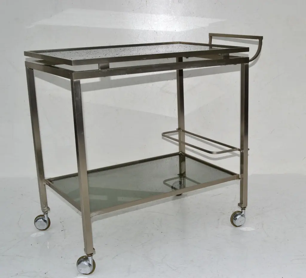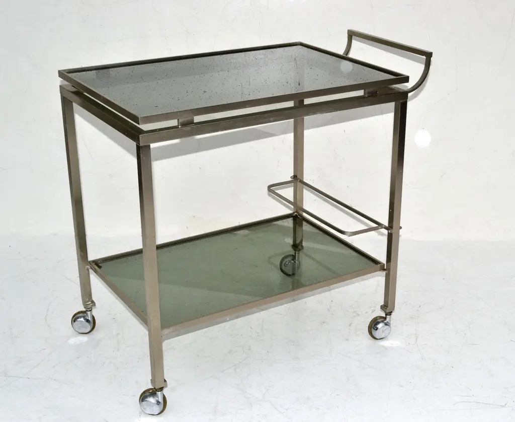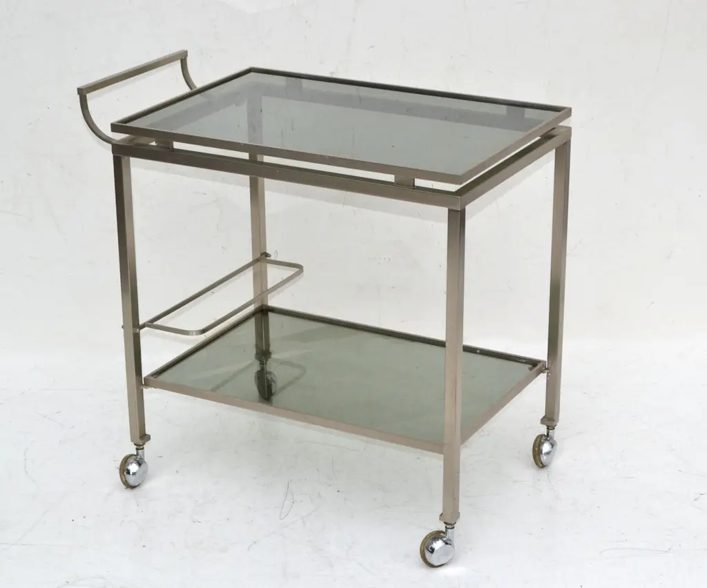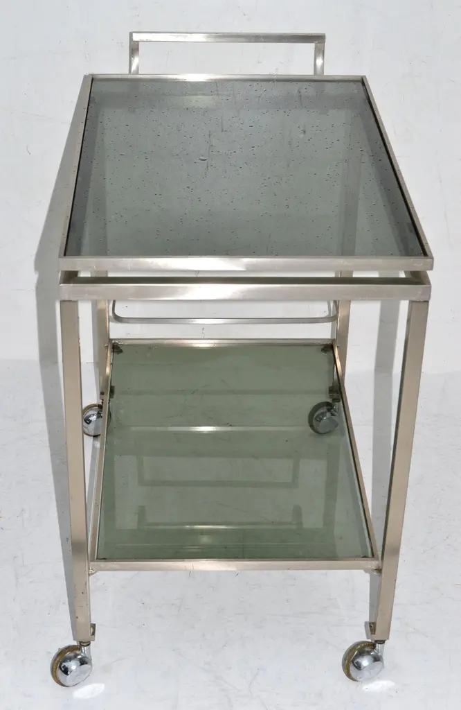 1 of 2 French bar cart two-tier by Guy Lefevre for Maison Jansen. 1960 in Chrome with smoked glass shelves and all original wheels.Measures: 24 Inches length without the handle, 29 inches length overall, 27.5 inches height overall, 25.3/4 inches height without the handle, 8 inches height from the floor to the 1st tier, 16 inches depth.Priced individually.