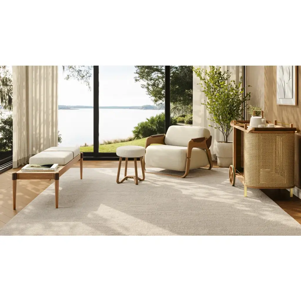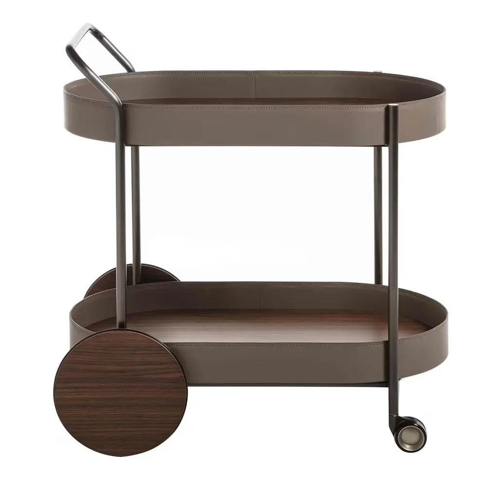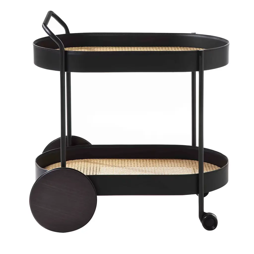 The Dinda Bar Cart is a stylish and versatile addition to your home. Crafted in Brazil, this Modern bar cart showcases a sturdy yet elegant solid Tauari wood frame that exudes both strength and sophistication. The mirrored tabletop adds a touch of glamour, reflecting the beauty of your drinkware and décor. The leather-wrapped handle provides a luxurious accent, while the polished golden metal details lend a touch of elegance. With its convenient wheels, the Dinda Bar Cart can be easily moved to accommodate your entertaining needs, and the organic charm of natural cane weaving brings a modern and unique aesthetic to the cart.