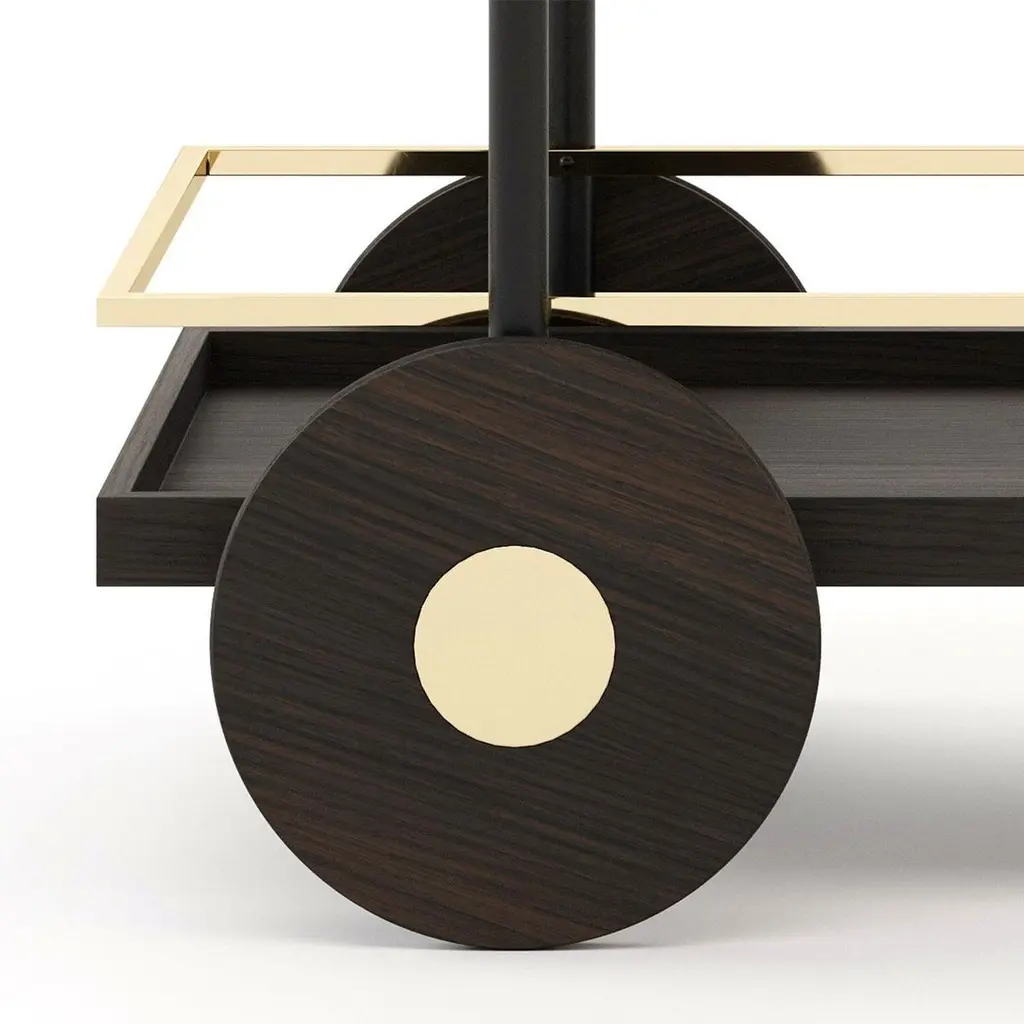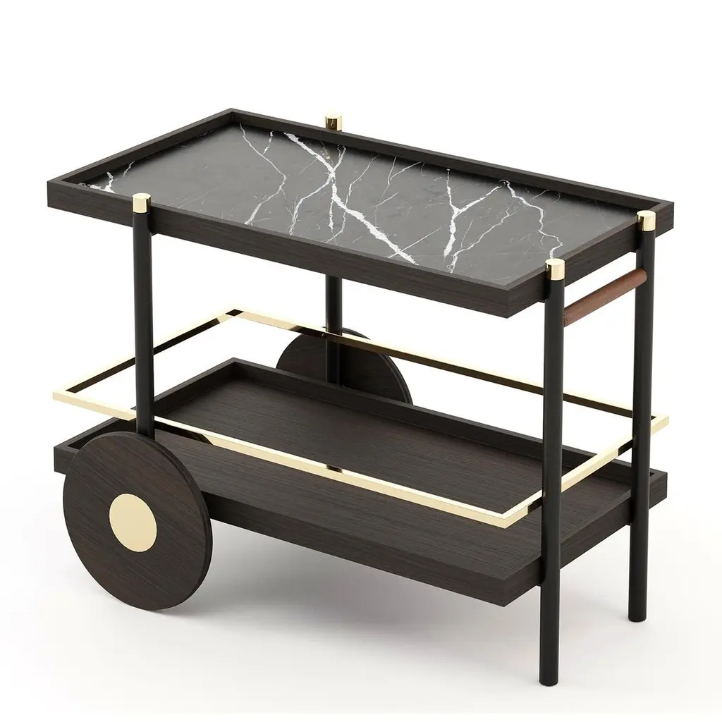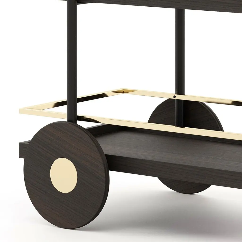 Trolley Hector with wooden structure in smocked.Oak matte finish, with polished stainless steel in gold.Finish and with 1 handle covered with brown leather.Upper top in black marble and bottom top in woodIn smocked oak matte finish.Also available on request in ebony glossy or matte.or in black ash matte, or in smocked eucalyptus matte. or in walnut glossy or glossy finishes.