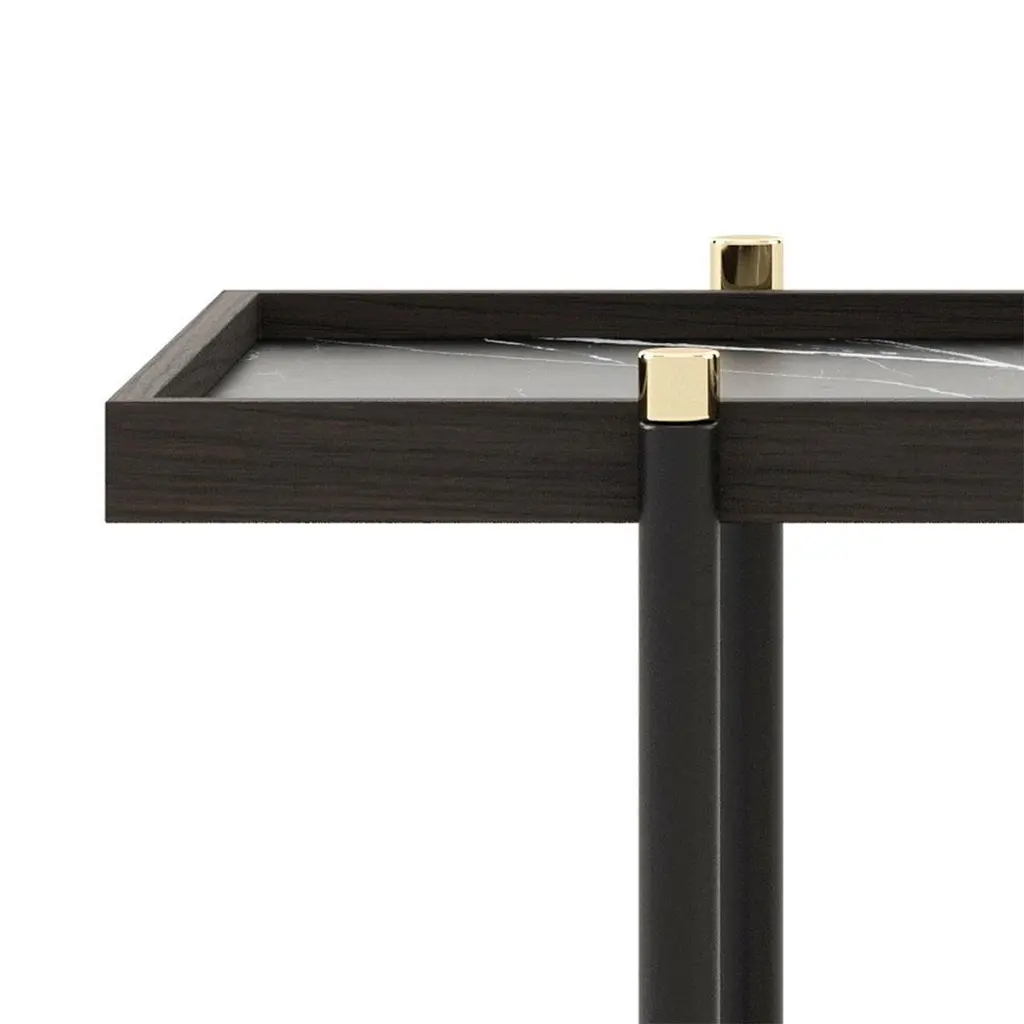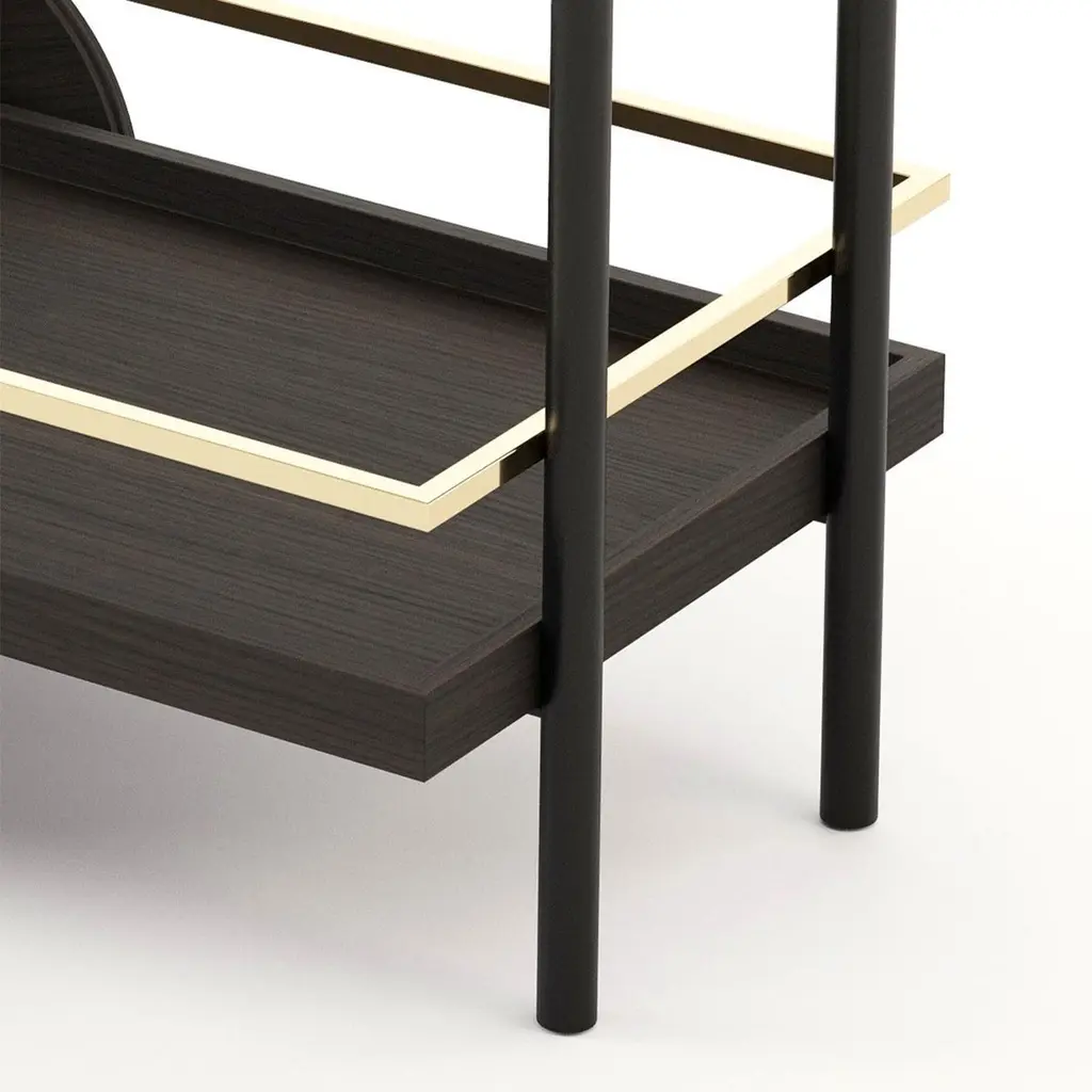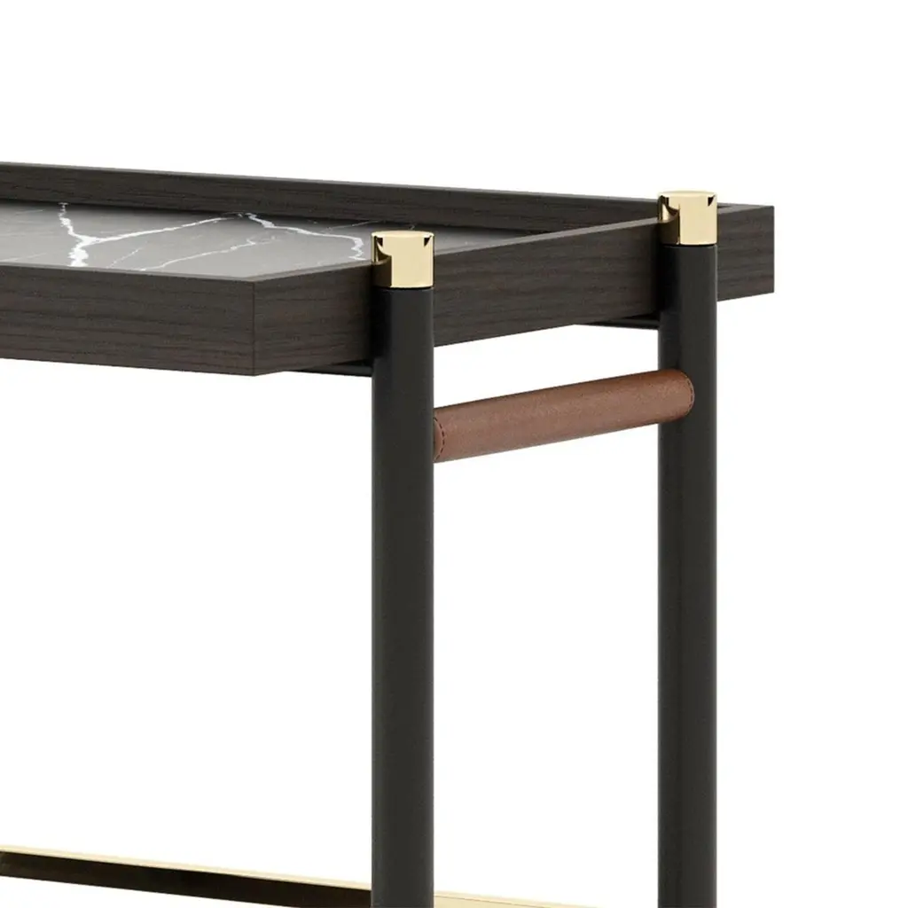 Trolley Hector with wooden structure in smocked.Oak matte finish, with polished stainless steel in gold.Finish and with 1 handle covered with brown leather.Upper top in black marble and bottom top in woodIn smocked oak matte finish.Also available on request in ebony glossy or matte.or in black ash matte, or in smocked eucalyptus matte. or in walnut glossy or glossy finishes.