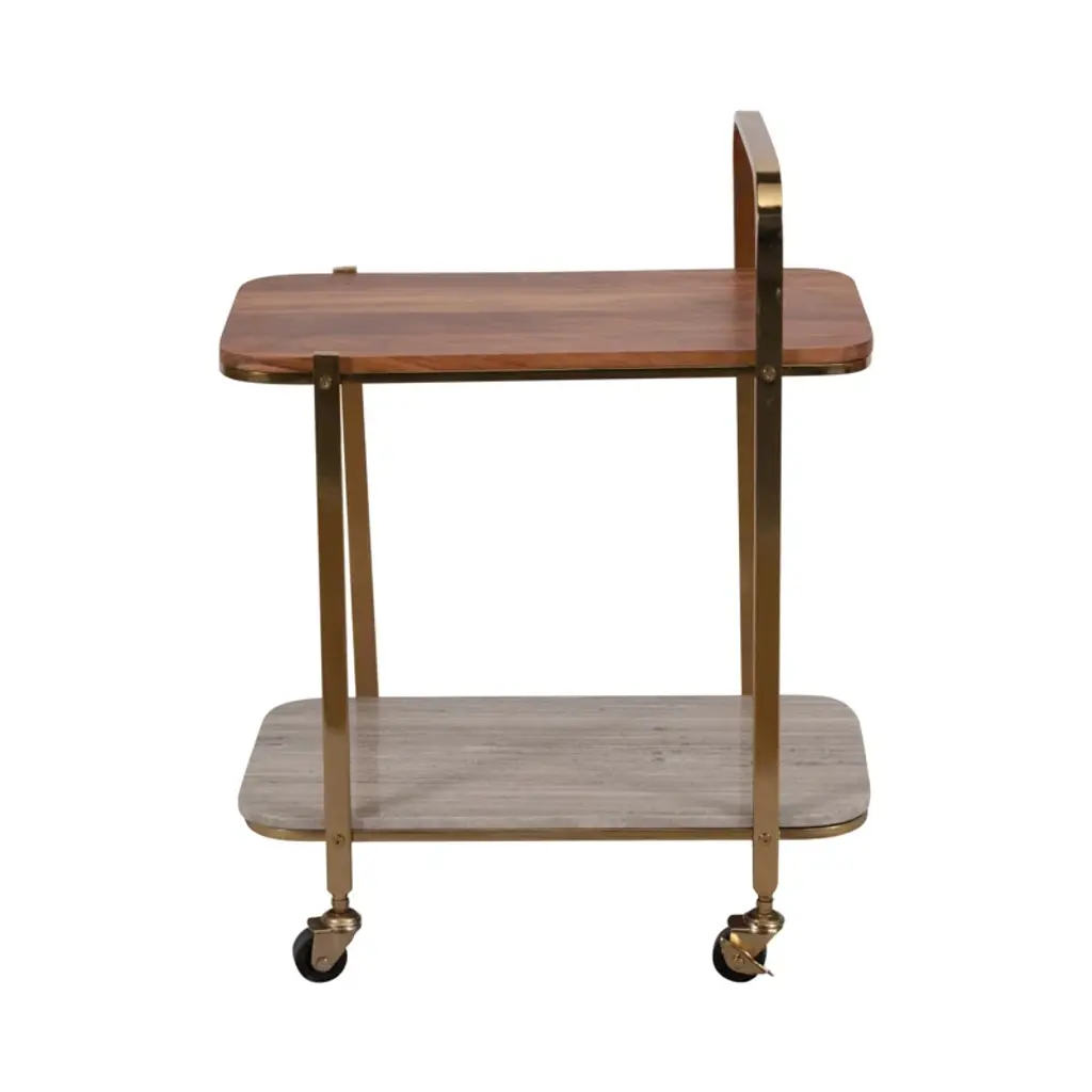 Roll with the party. Our modern rustic bar cart is a host's best friend, featuring a marble top and an iron frame that comes in a gold finish. The rectangular design with rounded edges offers ample space for drinks, snacks, and glassware, while the towel bar and handle make it easy to maneuver. Four caster wheels let you bring the festivities from room to room. So, go ahead and elevate your entertaining game with this stylish and functional bar cart.