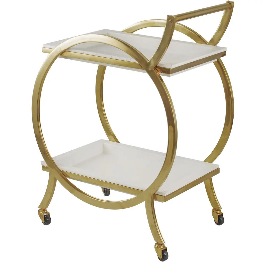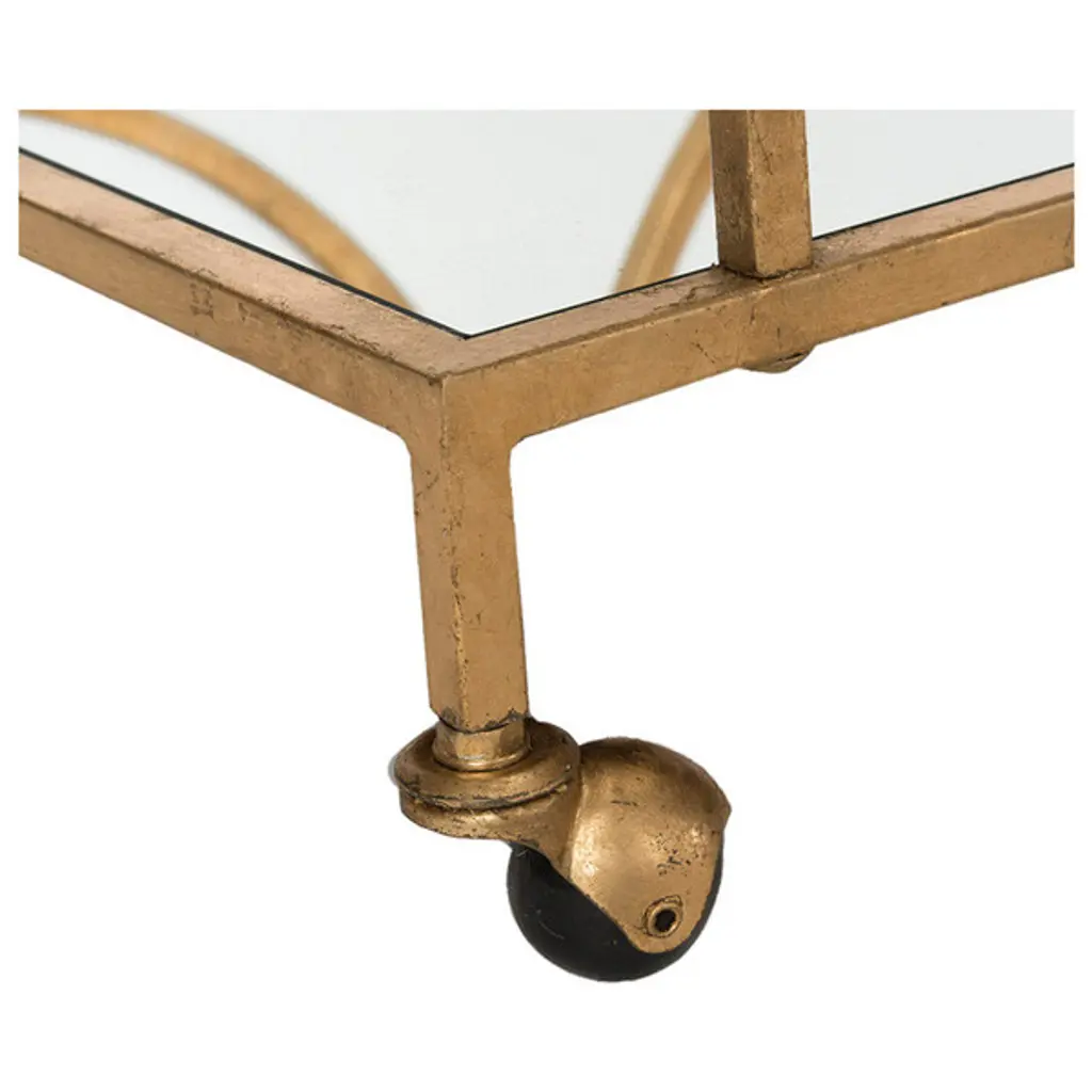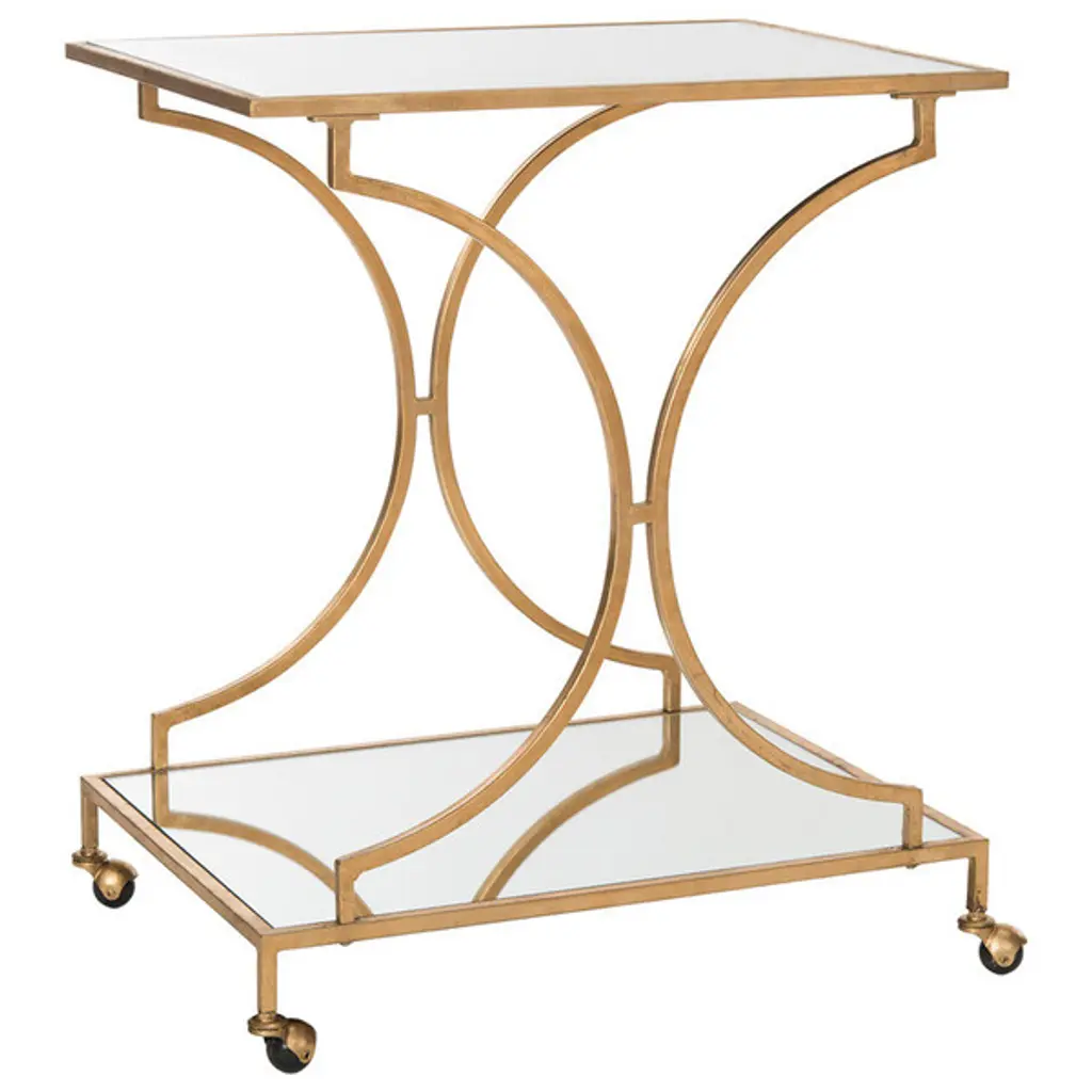 Serve beverages, desserts and other superb items from a first-rate cart -- the Ignatius Bar Cart from Safavieh. This bar cart brings old-world luxury into the modern age, as it features a beautifully forged iron base in a lustrous gold finish that pops. And with the bar cart's mirrored glass shelves, you'll have plenty of space to transport food and drinks from the kitchen to the dining room, too. Add a deluxe bar cart that is both practical and elegant -- the Ignatius Bar Cart.
