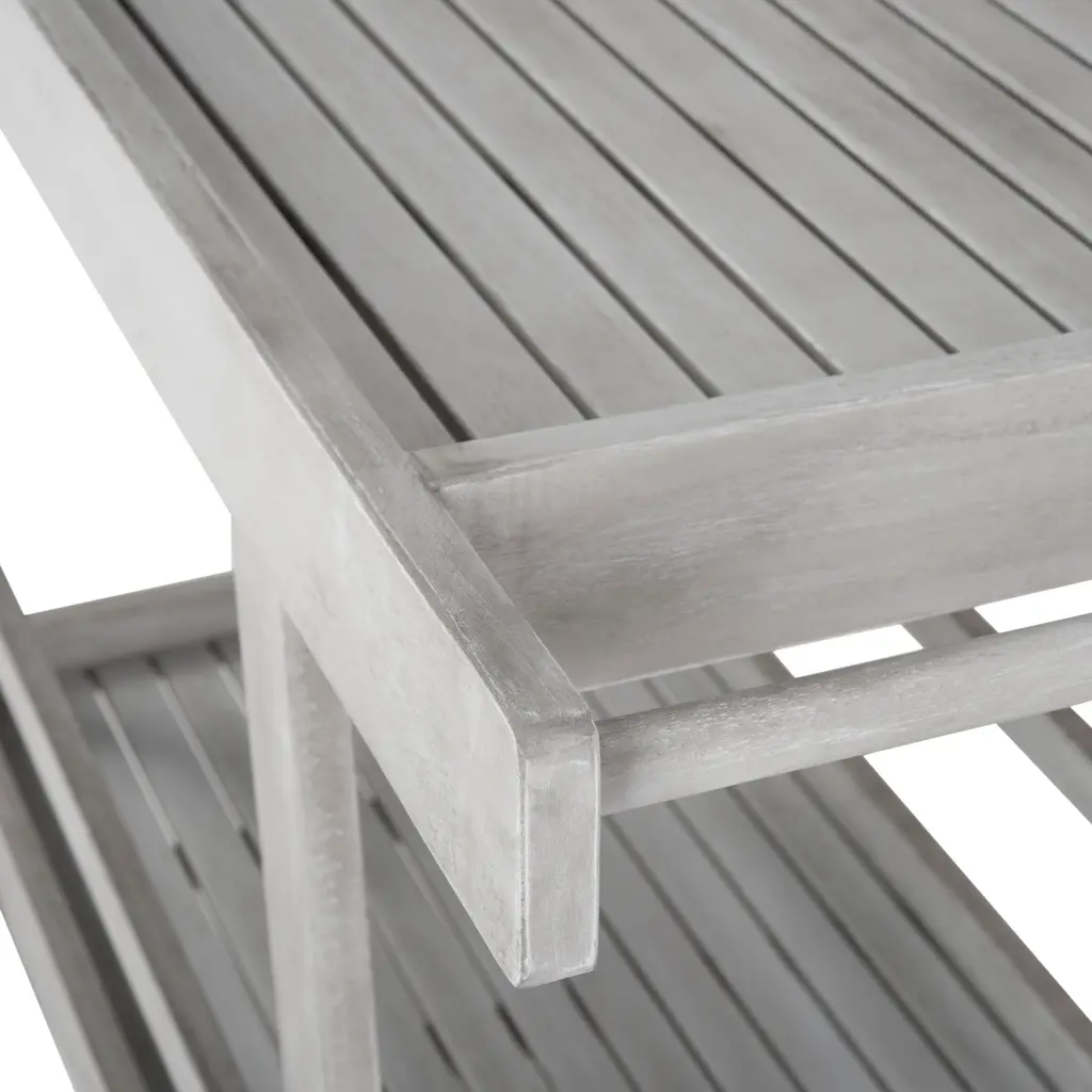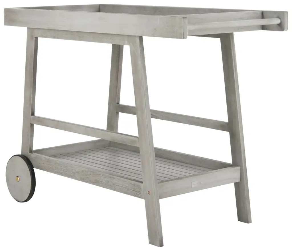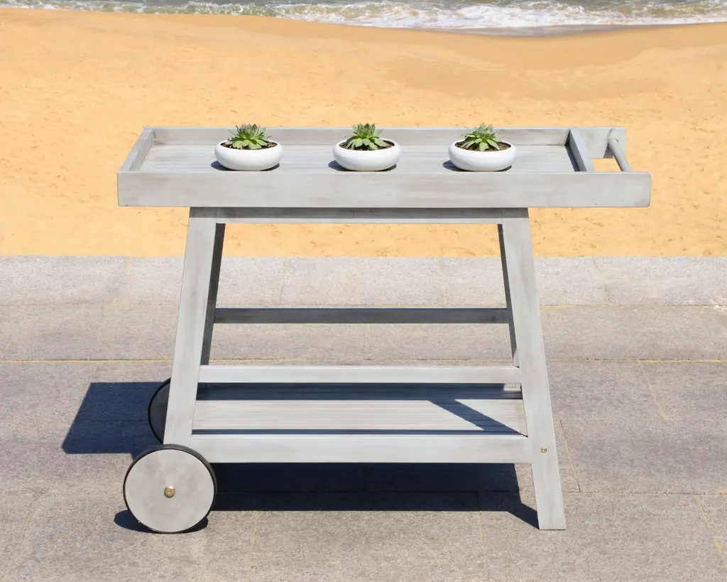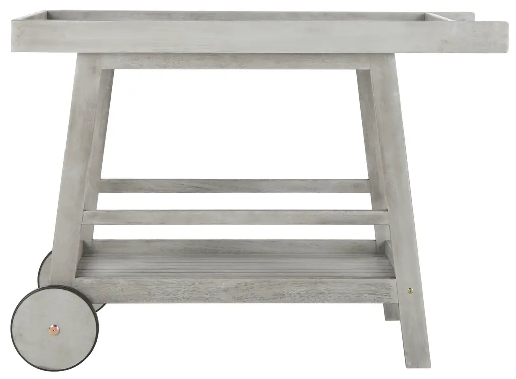 Designed for the modern host, this contemporary indoor/outdoor bar cart makes entertaining a breeze. Finished in a grey wash, it's eucalyptus wood construction makes it perfect for transporting cocktails and canapes from the kitchen to any outdoor oasis. Store outdoor furniture indoors or cover well when not in use. Remove wooden furniture from standing water. Dust regularly with small brush or vacuum. Spills should be taken care of immediately before they harden or stain with a slightly dampened sponge. Do not use bleach solutions. Some assembly required.