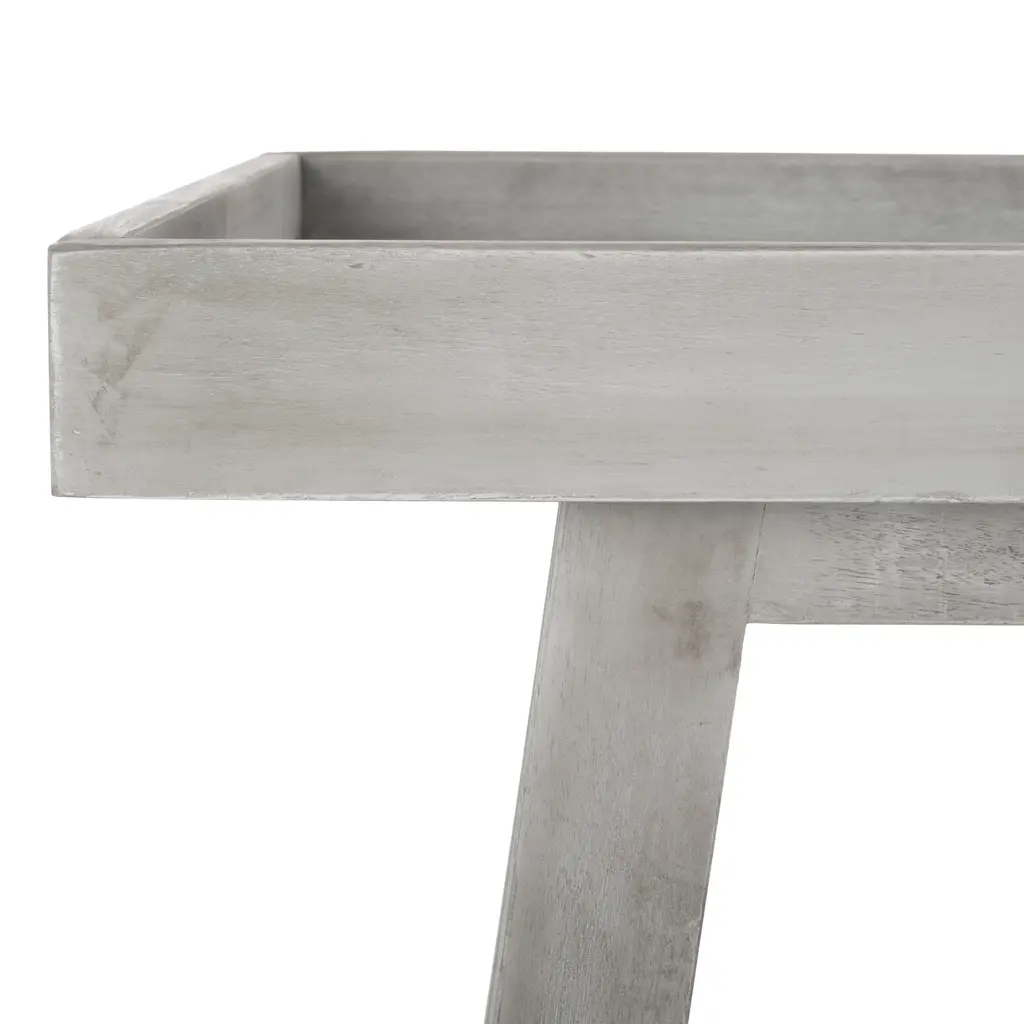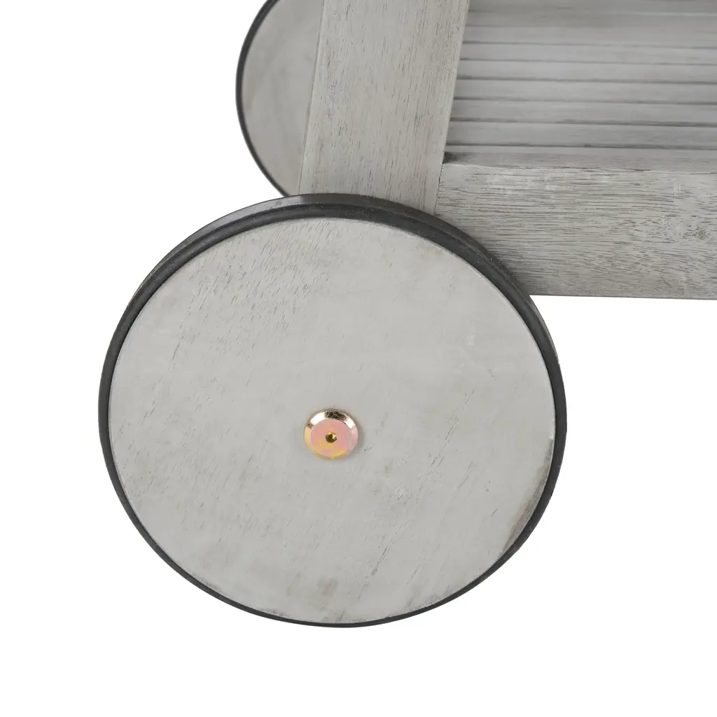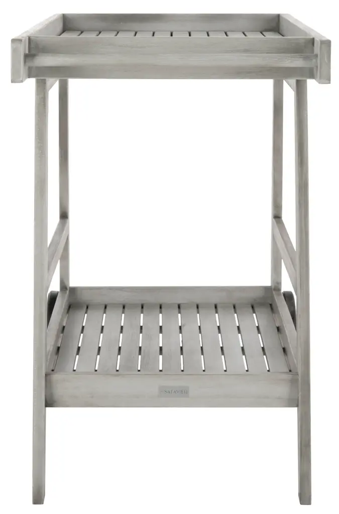 Designed for the modern host, this contemporary indoor/outdoor bar cart makes entertaining a breeze. Finished in a grey wash, it's eucalyptus wood construction makes it perfect for transporting cocktails and canapes from the kitchen to any outdoor oasis. Store outdoor furniture indoors or cover well when not in use. Remove wooden furniture from standing water. Dust regularly with small brush or vacuum. Spills should be taken care of immediately before they harden or stain with a slightly dampened sponge. Do not use bleach solutions. Some assembly required.