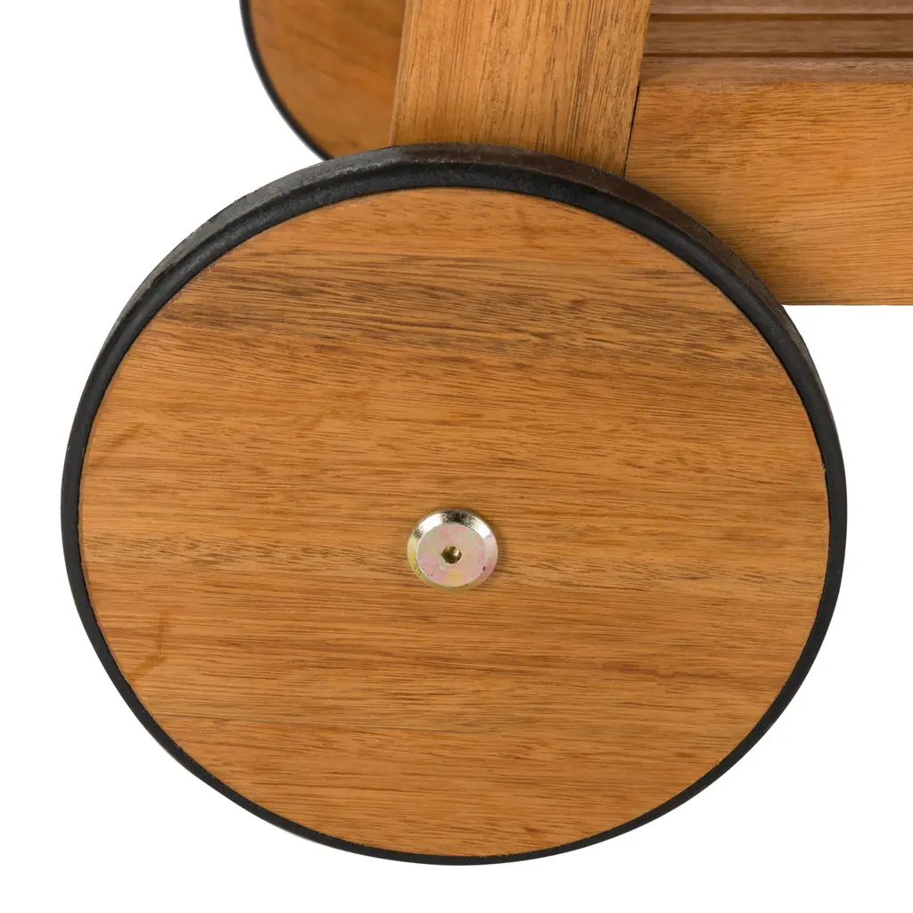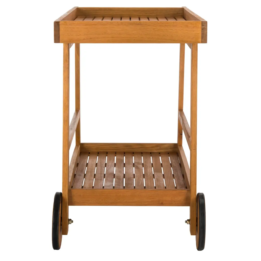 Designed for the modern host, this contemporary indoor/outdoor bar cart makes entertaining a breeze. Finished in classic natural, it's eucalyptus wood construction makes it perfect for transporting cocktails and canapes from the kitchen to any outdoor oasis. Store outdoor furniture indoors or cover well when not in use. Remove wooden furniture from standing water. Dust regularly with small brush or vacuum. Spills should be taken care of immediately before they harden or stain with a slightly dampened sponge. Do not use bleach solutions. Some assembly required.
