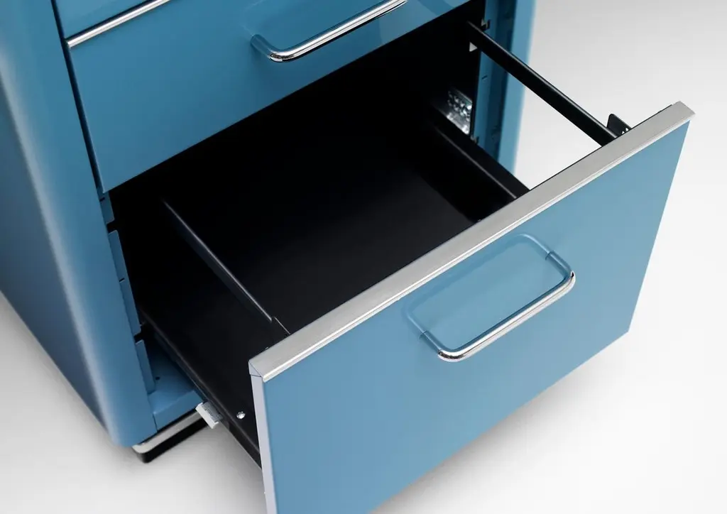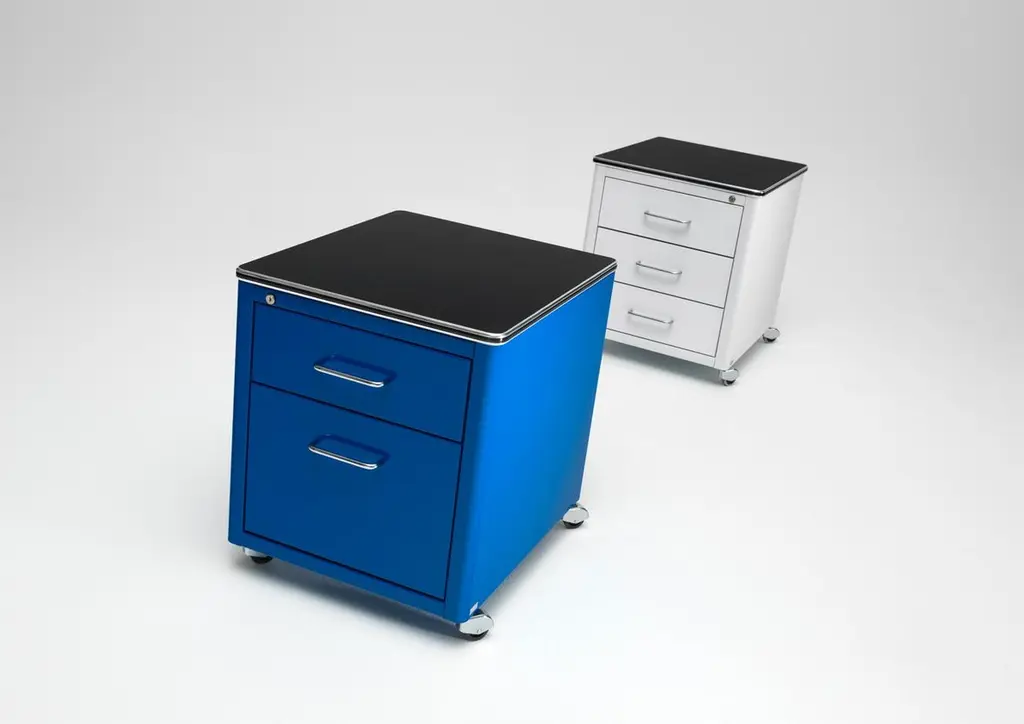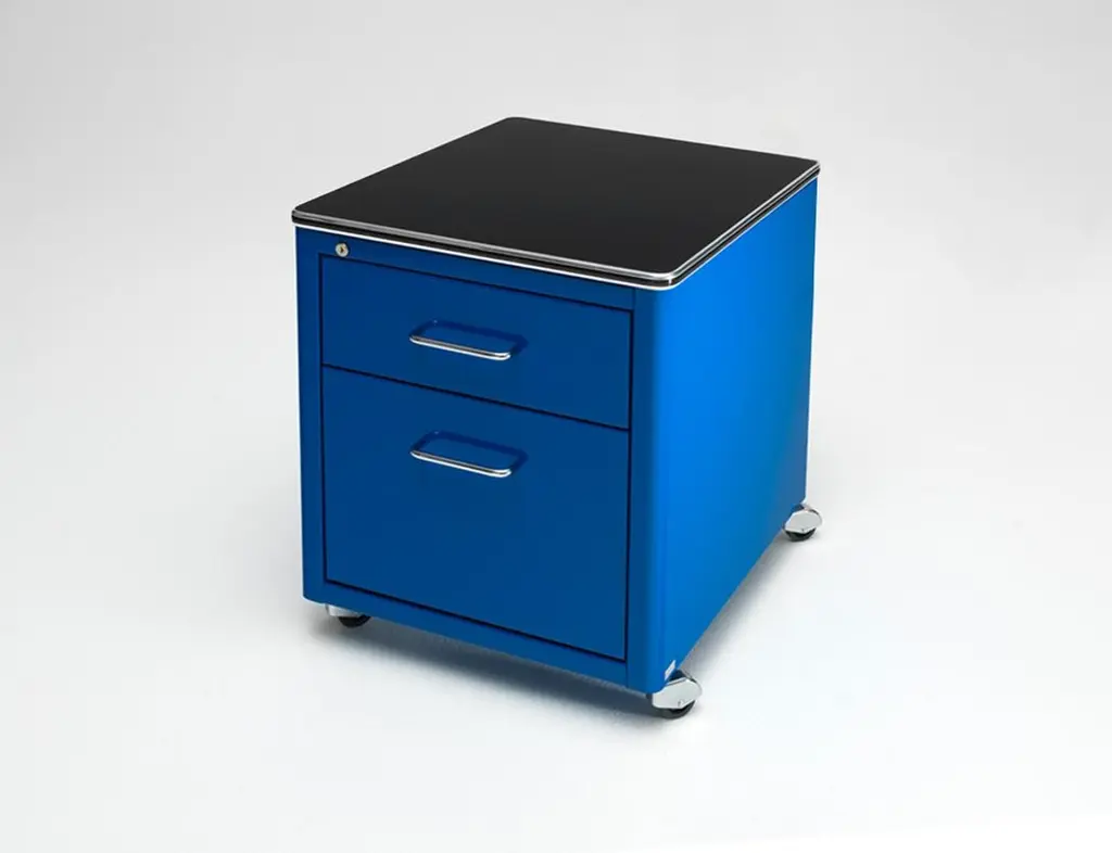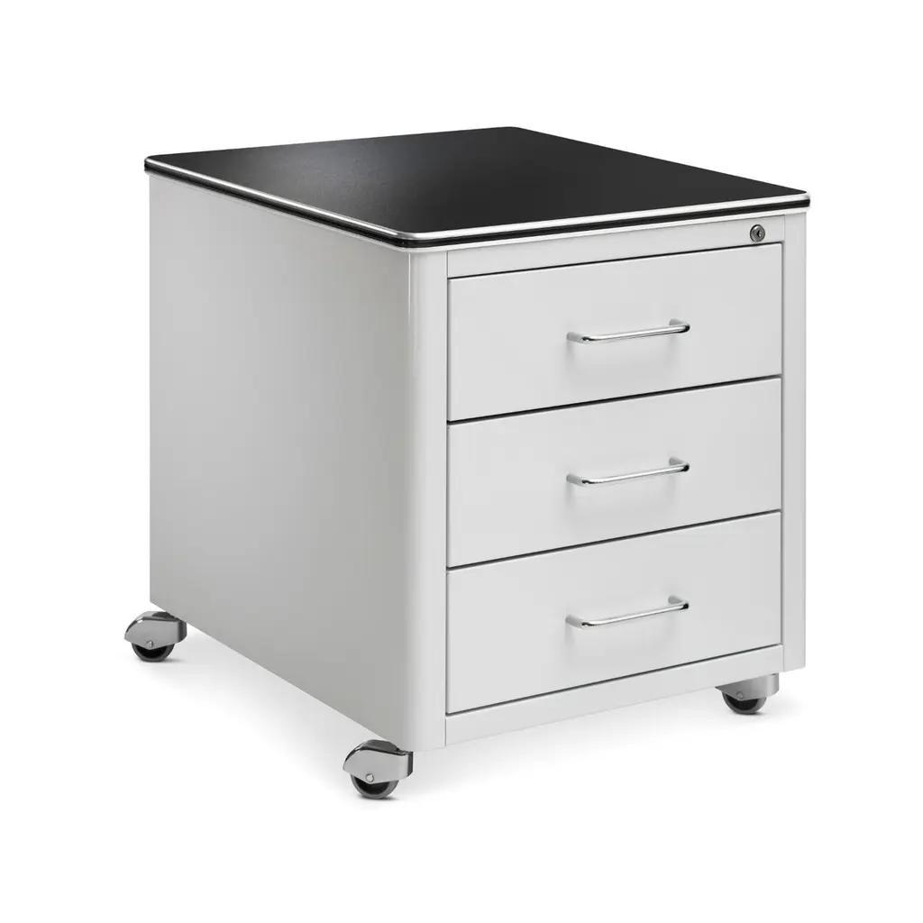 Rolling cart / trolley in classical industrial design style. The timeless essential form is adapted office and living spaces with different interior situations. The desktop can be covered on choice with Linoleum, nanotech laminate or lacquer and is framed with an aluminum profile with a black hard plastic insertion. The metal structure is painted and available in different colors and finish.