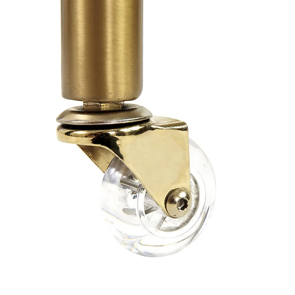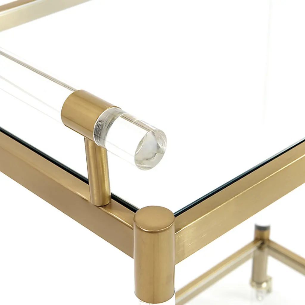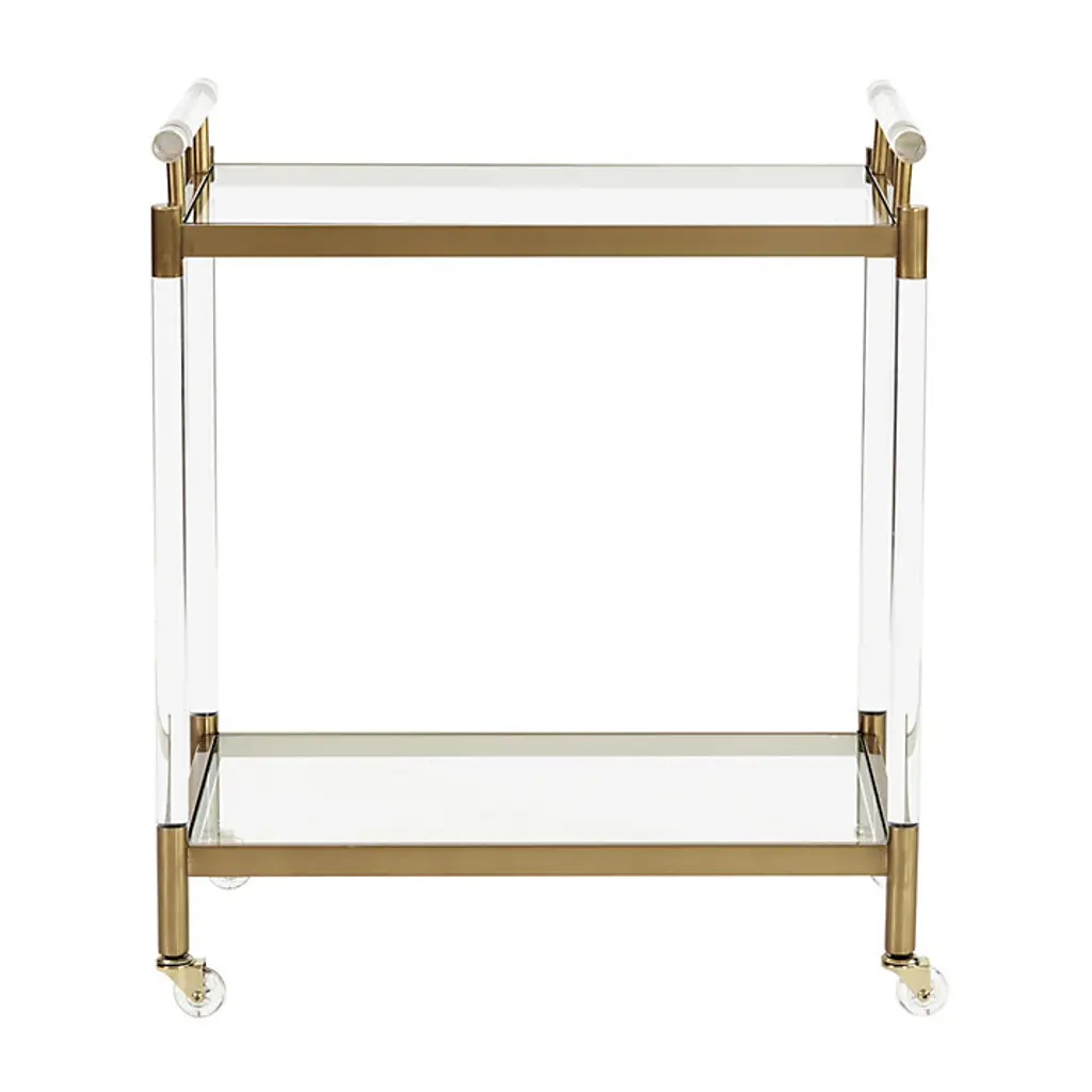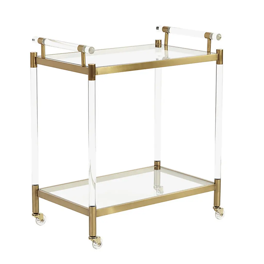 Classic lines reimagined in premium quality acrylic with gleaming brass finish accents. Our Isadora rolling bar cart features swiveling, whisper-quiet translucent casters that make it easy to take the party to your guests. Double handles let you guide the cart from either side. Isadora Acrylic Bar Cart features: