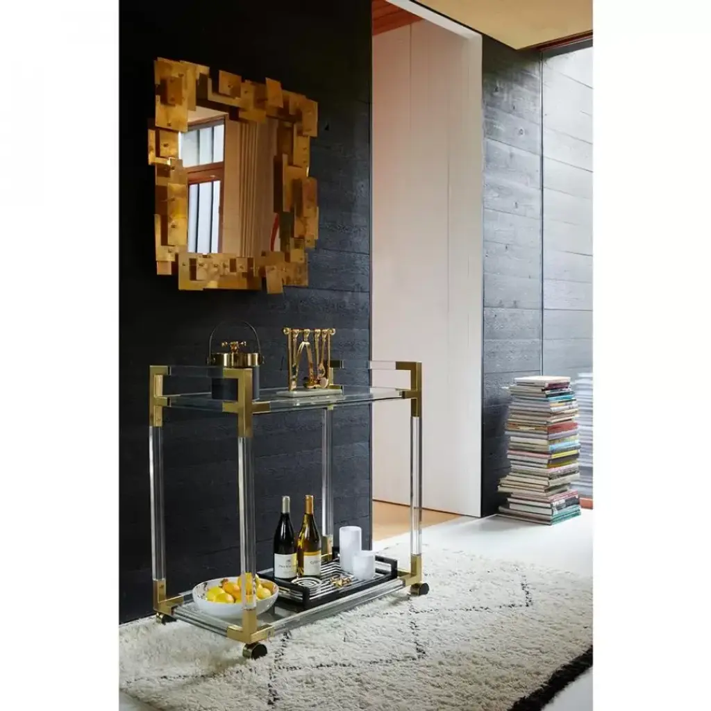The perfect blend of simplicity and glamour, modern and traditional. Bar carts are the swankiest of all home décor. Our Jacques Bar Cart comes in luxe clear acrylic with brushed brass accents or smoke acrylic with polished nickel trimmings. Two glass shelves offer plenty of space for your chosen aperitif and our fabulous Malachite or Newport barware. Transform a lonesome corner into the most scandalously stylish spot of the room. Big presence, weightlessly transparent.