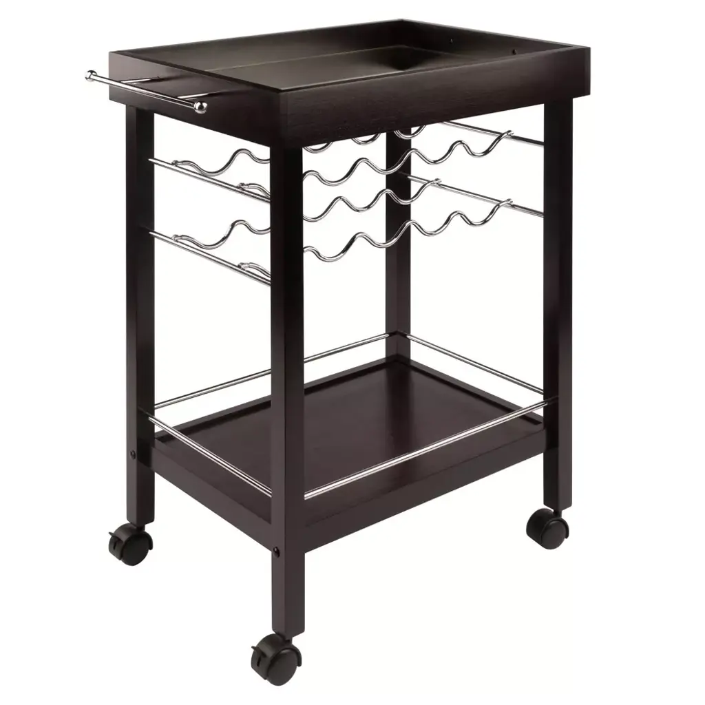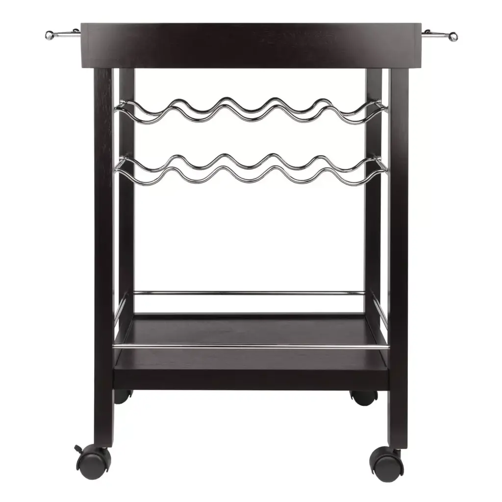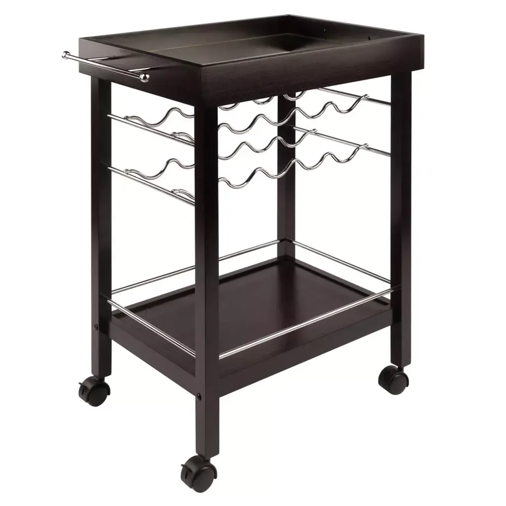 Serve coffee or cocktails in easy style with the Johnnie Bar Cart from Winsome. The rich espresso bar cart shines with silver handles, a wine rack and border along the bottom to keep bottles, cups and glasses from slipping off the sides. Roll the bar cart around the room if you're serving guests, or lock the wheels for a stationary bar cart you can place anywhere. with space for 10 wine bottles, you can stock something for everyone.
