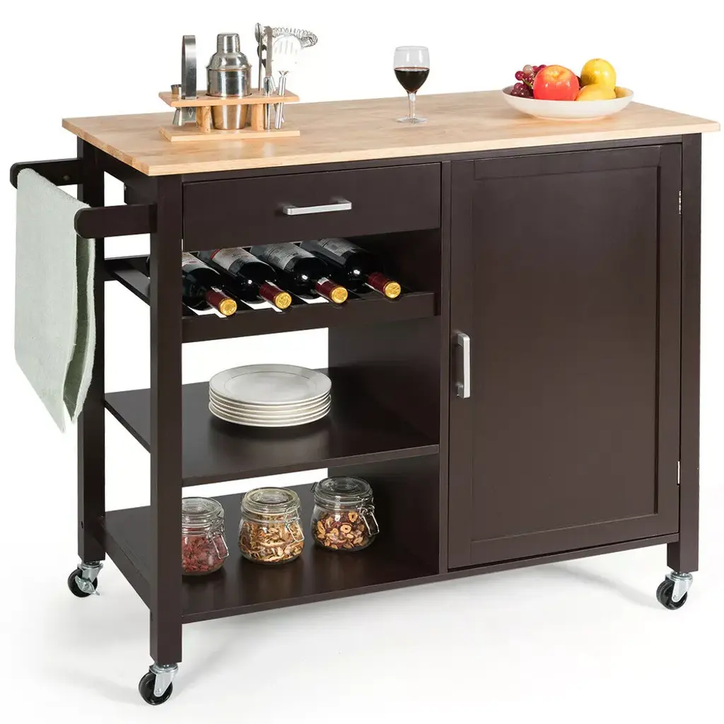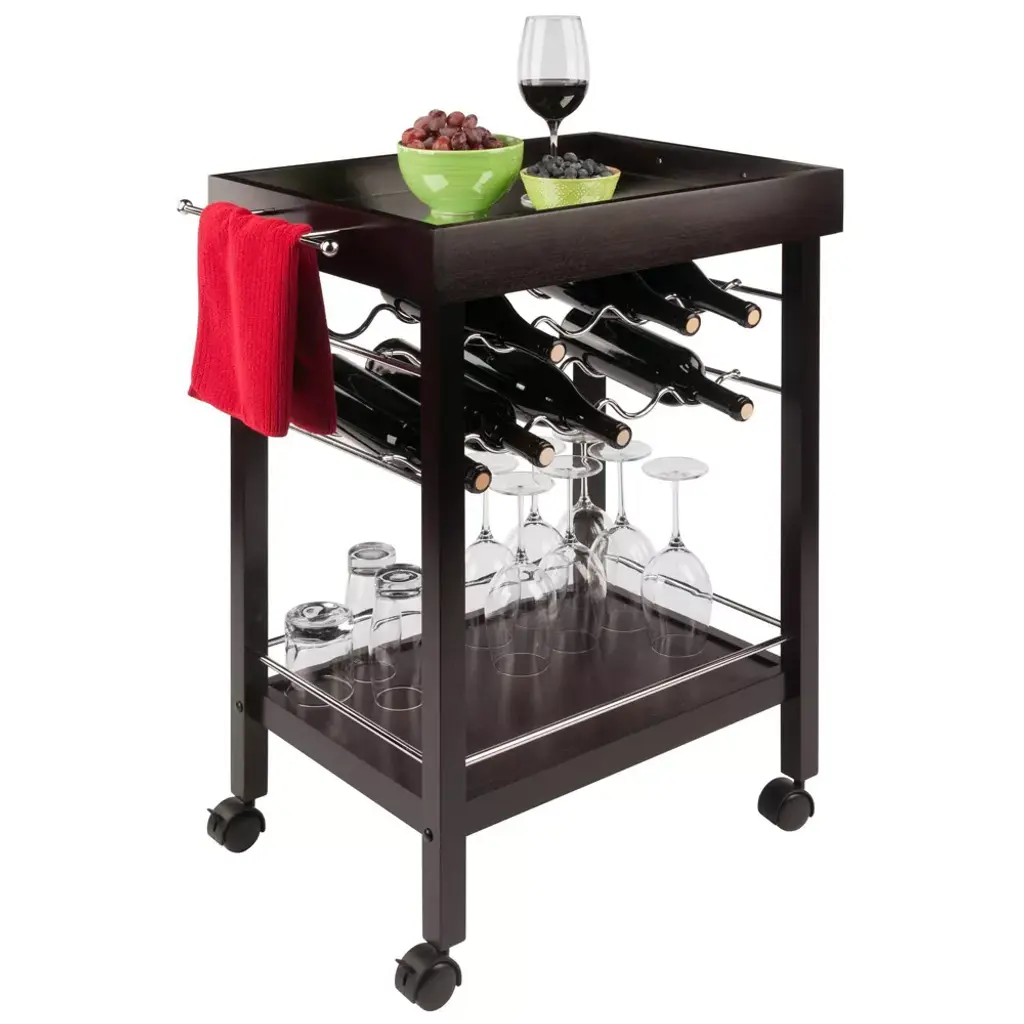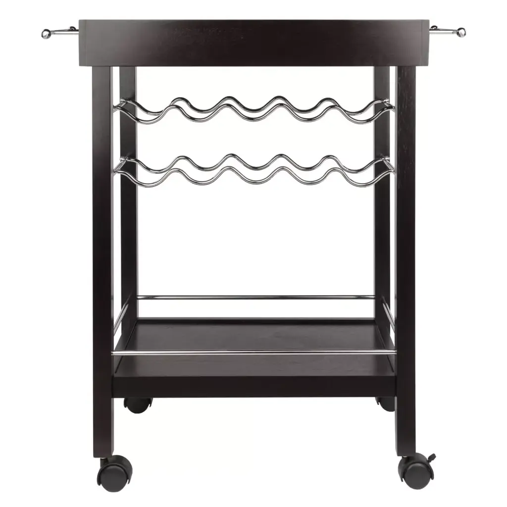 Serve coffee or cocktails in easy style with the Johnnie Bar Cart from Winsome. The rich espresso bar cart shines with silver handles, a wine rack and border along the bottom to keep bottles, cups and glasses from slipping off the sides. Roll the bar cart around the room if you're serving guests, or lock the wheels for a stationary bar cart you can place anywhere. with space for 10 wine bottles, you can stock something for everyone.