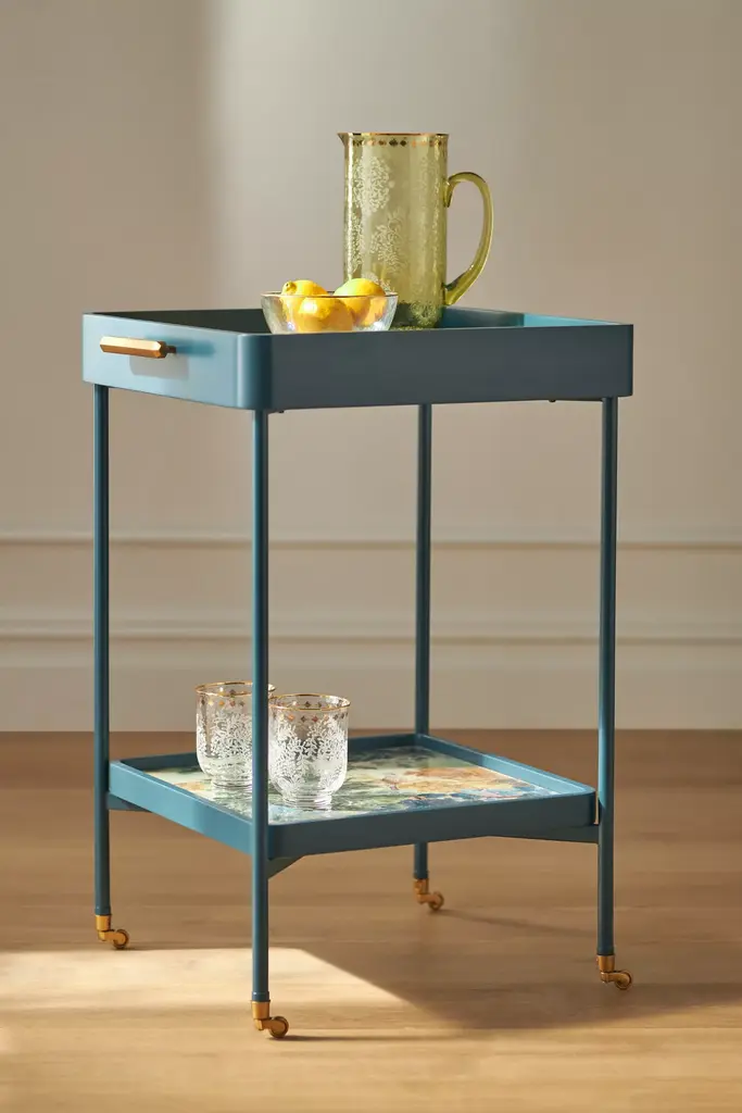 Featuring an enchanting Italian tapestry-inspired design, this bar cart merges impeccable woodworking craftsmanship with an elegantly soft silhouette. Boasting plenty of storage space for spirits, glasses, and bar accessories, you'll be ready to host this season. For ordering assistance and more, please [contact us](https://www.anthropologie.com/help/contact-us#contact-us-section-2). For aesthetic advice and tips to help decorate your space, enjoy our complimentary [home styling services](https://www.anthropologie.com/help/personal-styling-home-decor). For more information on the materials and techniques of this piece, [click here](https://www.anthropologie.com/help/material-care-guide).