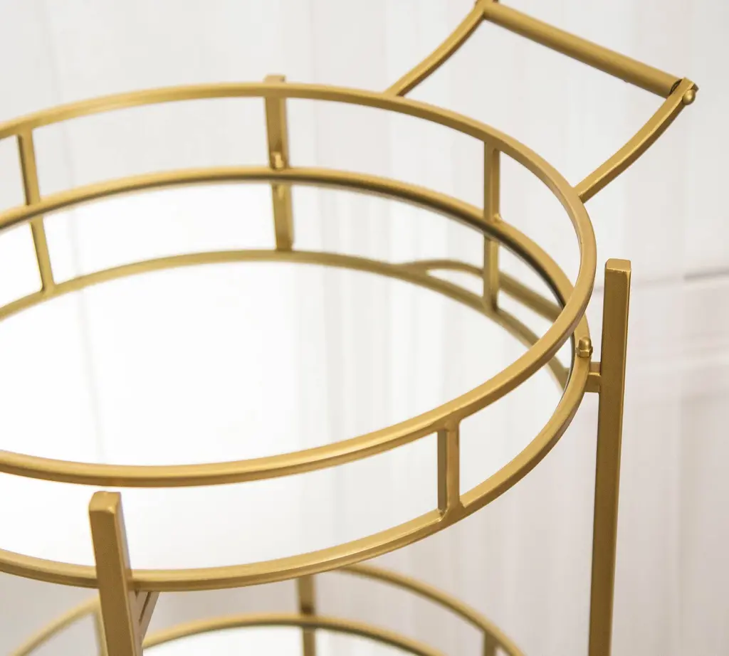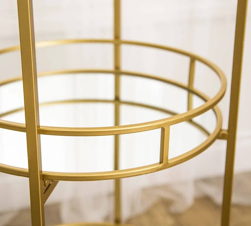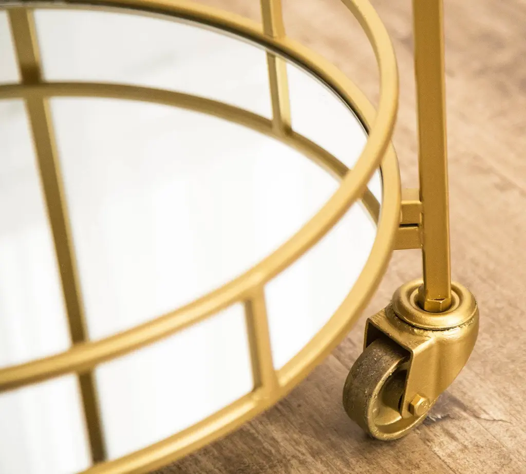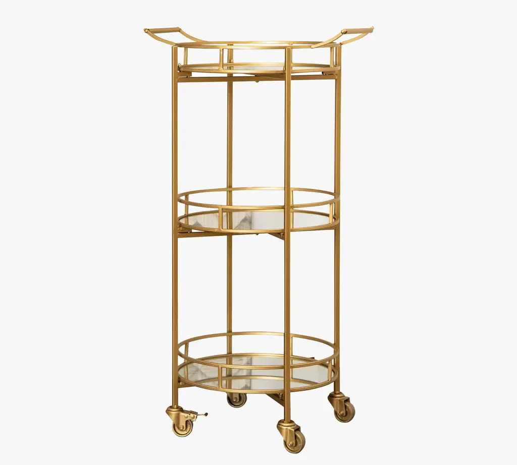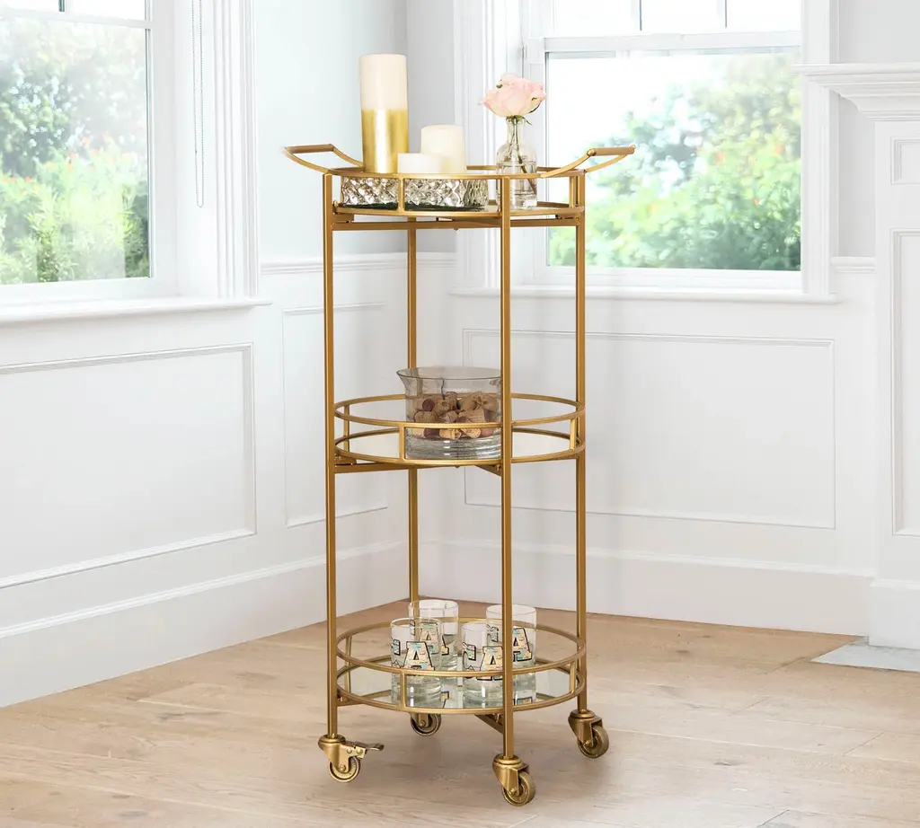 Make spirits glamorous and bright with the Jurupa Bar Cart, with it slender, three-tier design that makes it a must-have for small-space entertaining. The mirrored shelves create a reflective style moment, and the wheels and handles pave the way for easy transport between rooms.
