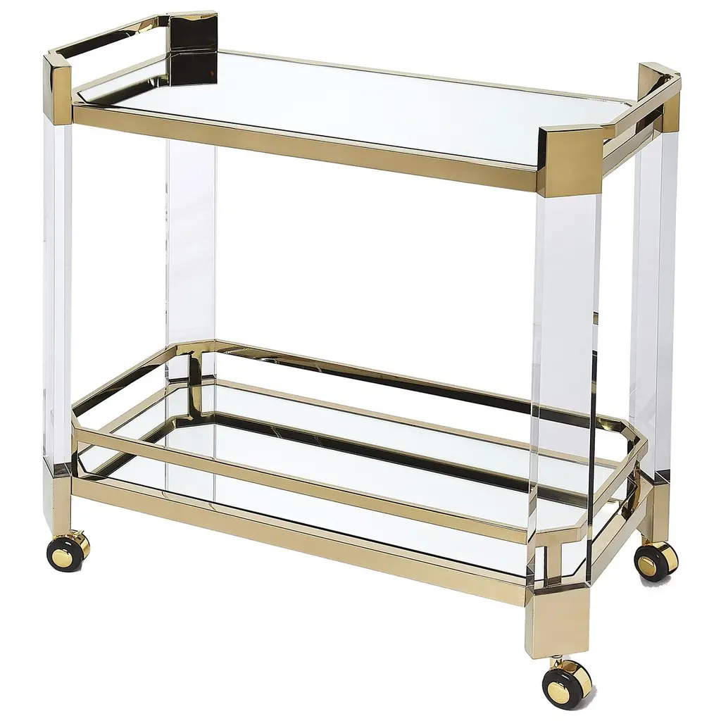 Our Kent Bar Cart is an exact replica of a 1970’s vintage piece we discovered at the Le Pouce in Paris. Crated from clear Acrylic, the sturdy two-tier silhouette rest upon polished brass casters, allowing for effortless movement. Ships In 4-5 Weeks Acrylic and Brass accents Glass shelves This image is for illustrative purposes only. The colors shown are accurate within the constraints of lighting, photography, and the color accuracy of your screen.