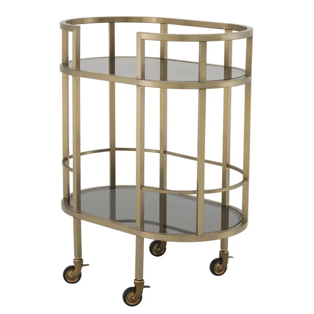 Featuring A Clean Lined Solid Iron Frame, This Contemporary Bar Cart Is Finished In A Two-toned Matte Black And Brushed Gold. Has Two Tempered Glass Shelves, Complete With Rolling And Locking Casters.