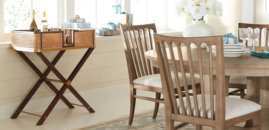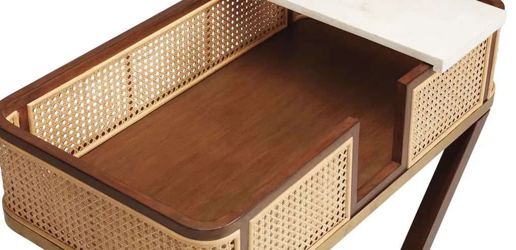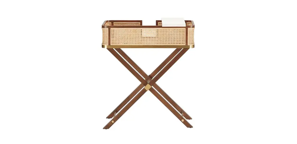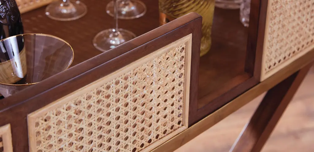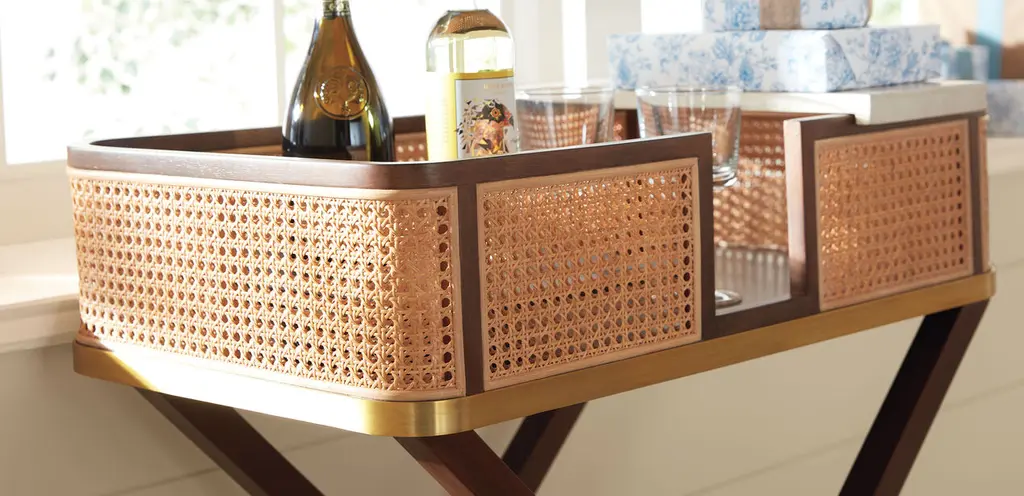 A toast to retro chic, the Lamontagne bar stand is crafted from handwoven cane, over a dark wood frame with painted brass stretcher and collar details. Features a removable tray with stone laminate and folds for easy storage.