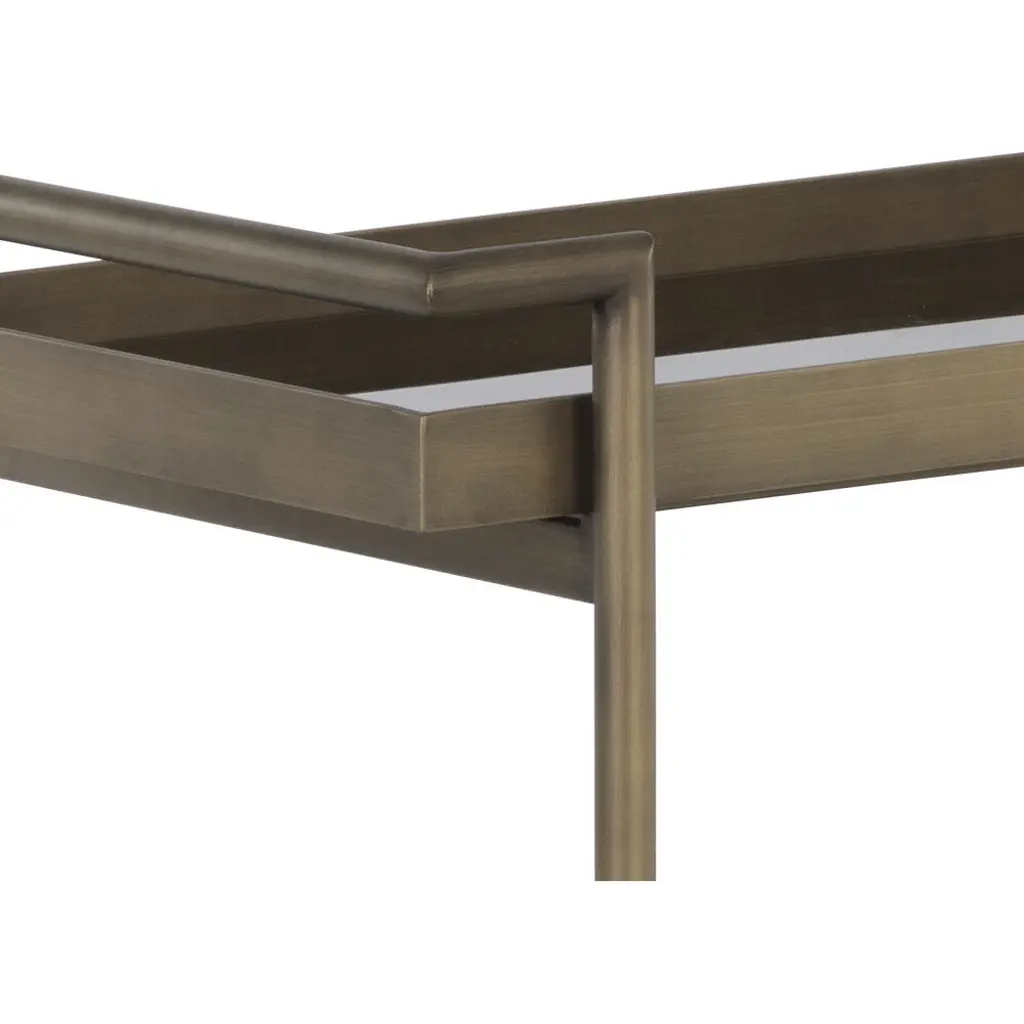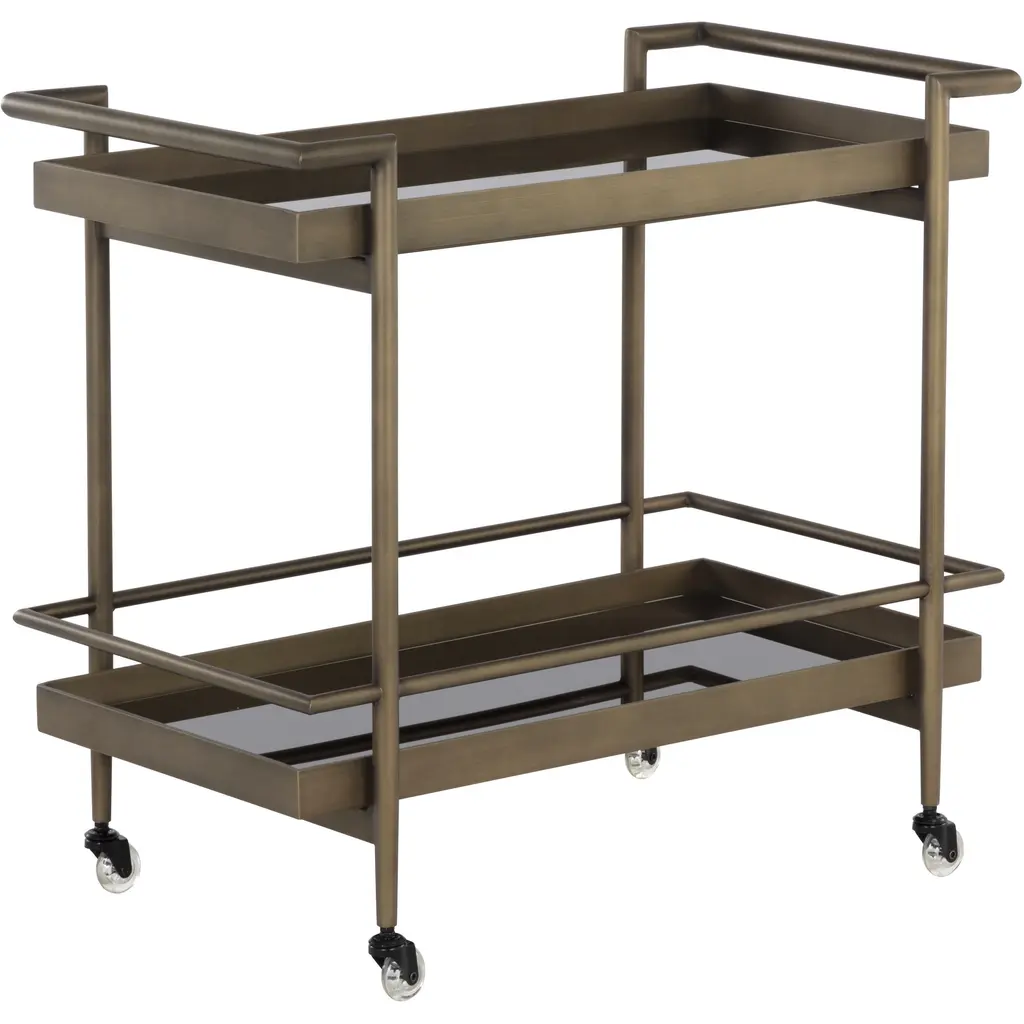 A truly versatile and stylish bar cart featuring sleek, black glass shelving with an antique brass stainless steel tubular frame and legs. Castors allow for easy mobility.