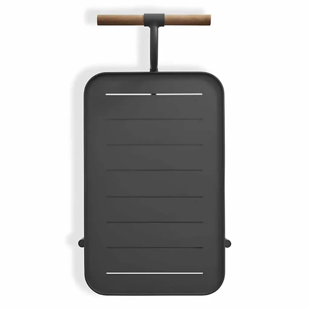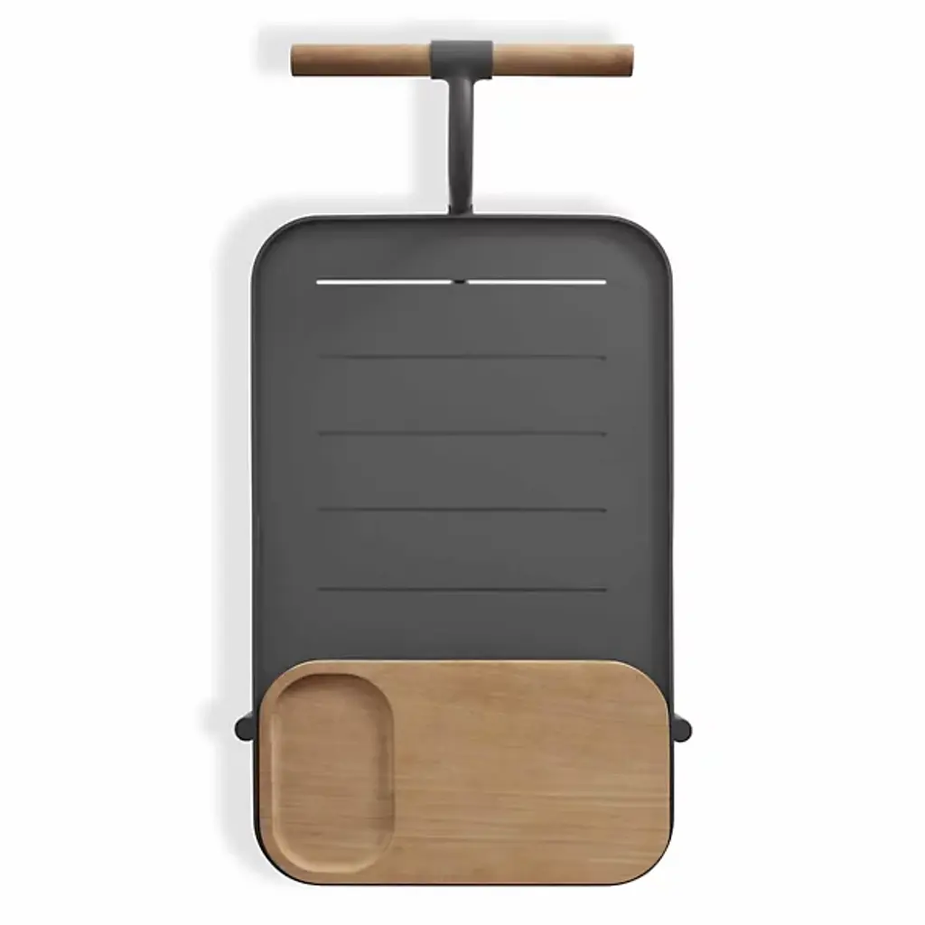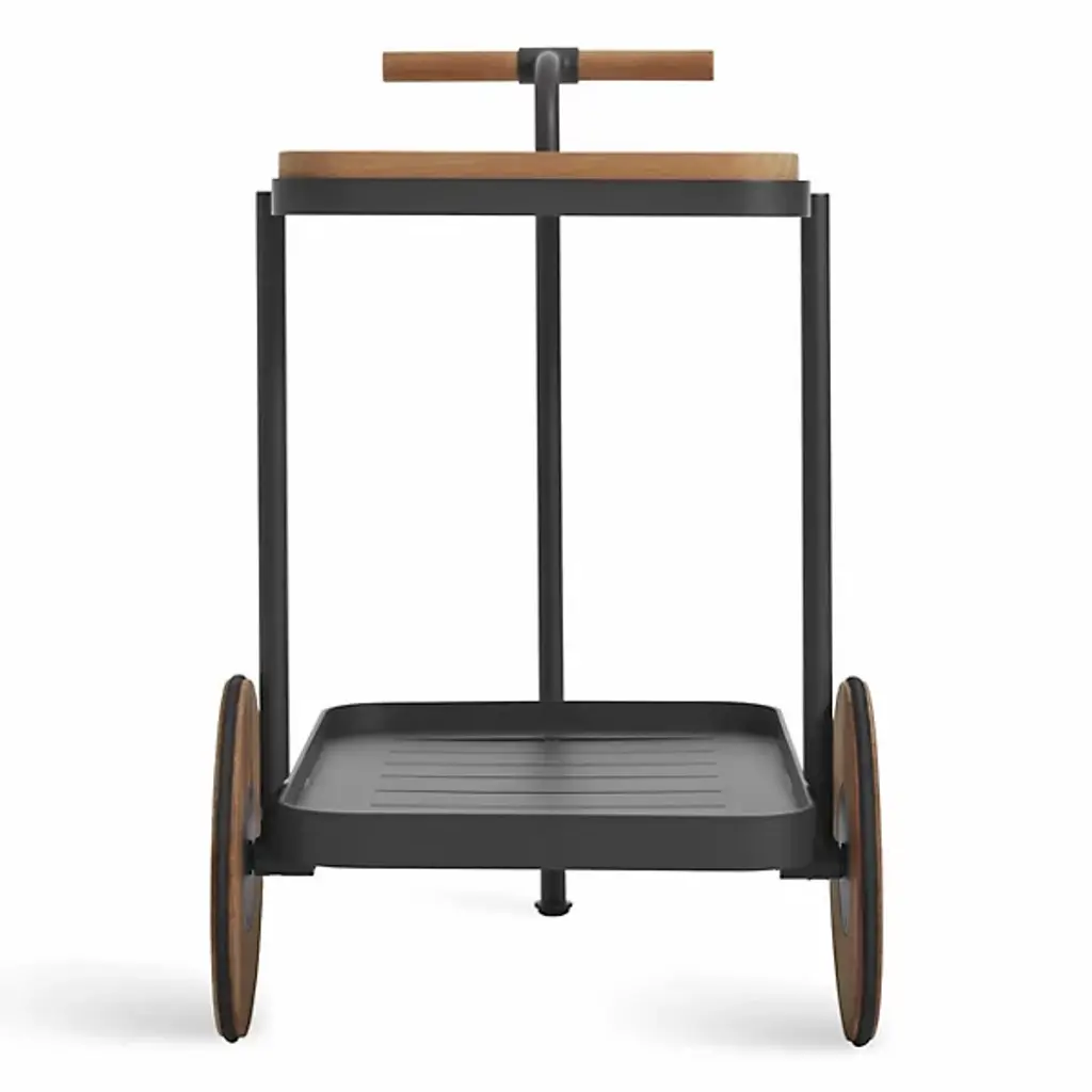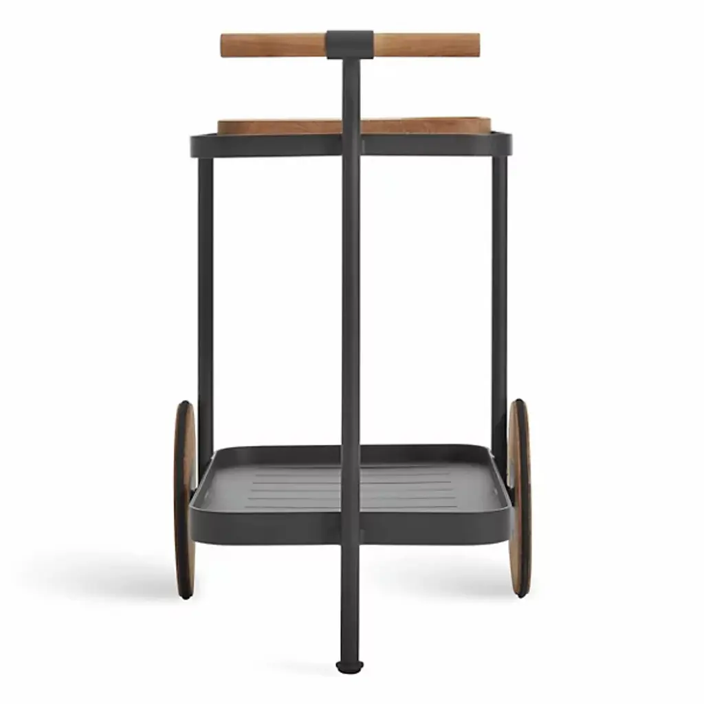 The handsome companion we could use on those long days. Kick off your shoes and sit back with the Longday Bar Cart from Blu Dot sporting your favorite refreshments. It’s the bar cart that gives you something to admire as you sip on your drink. The eyes get lost in the natural warmth and texture of the teak wood elements. The wood gives the piece a distinct pop against the smooth and sleek aluminum structure. Quarter up some limes on the elegant cutting board. Bring the party across the home through the smooth spinning wheels. The piece offers two shelves for storing glassware, liquids, and garnishes. If a spill happens inside, linear cuts help drain it for easy cleanup.