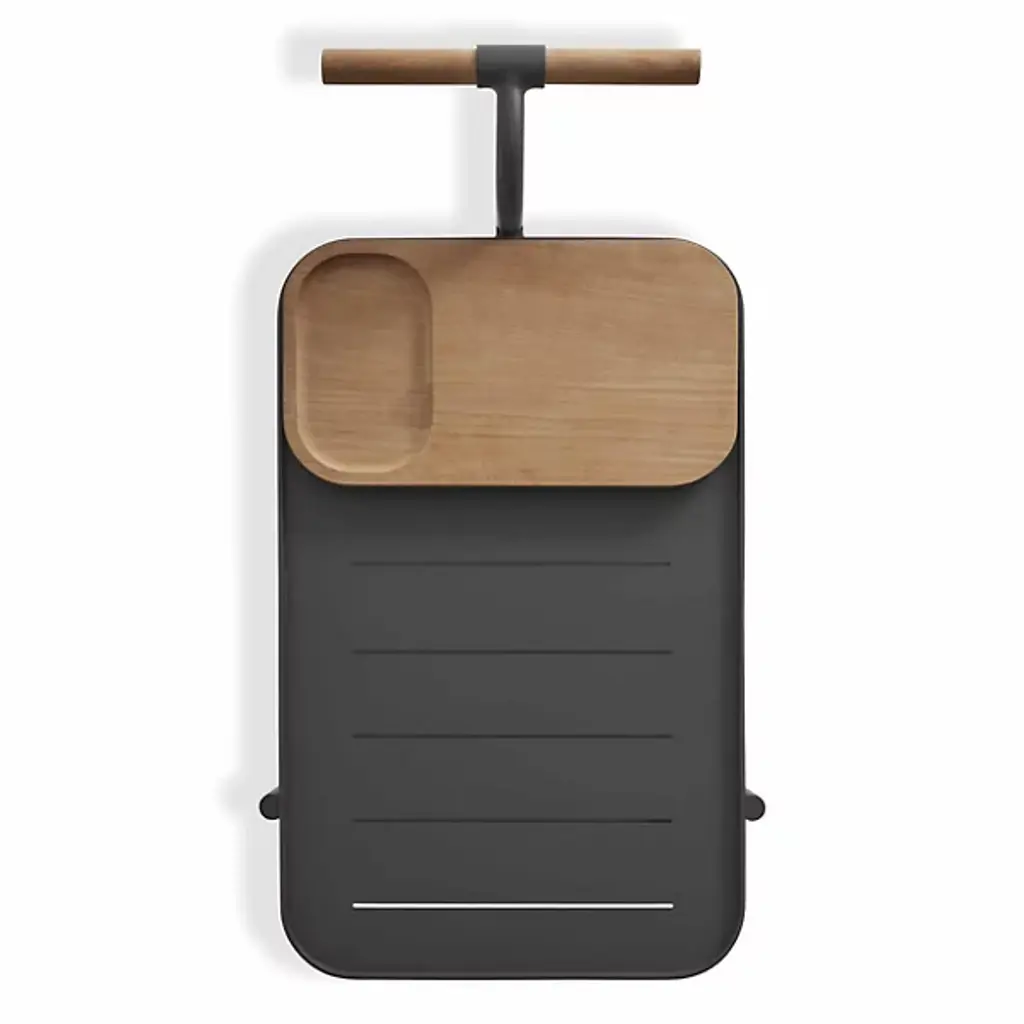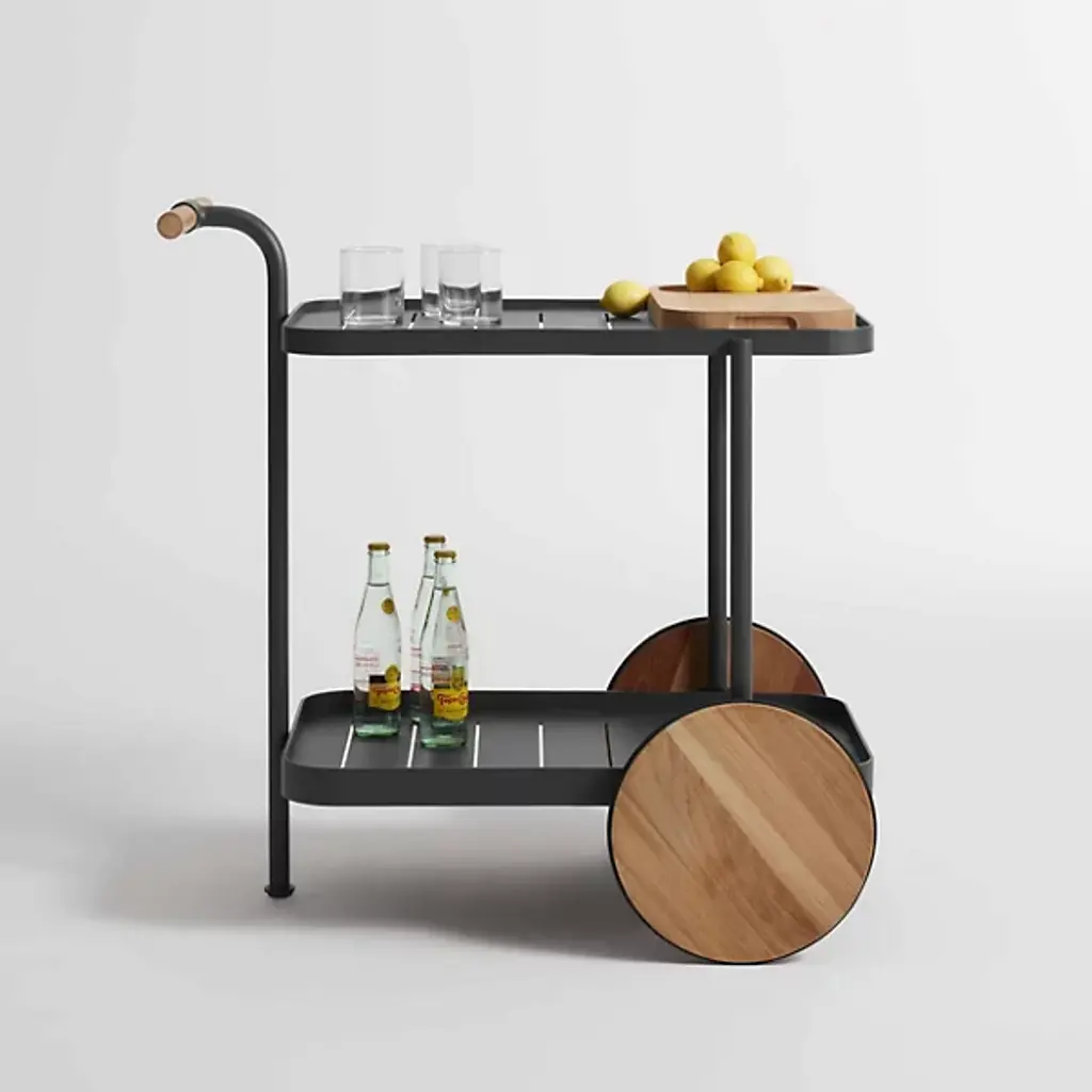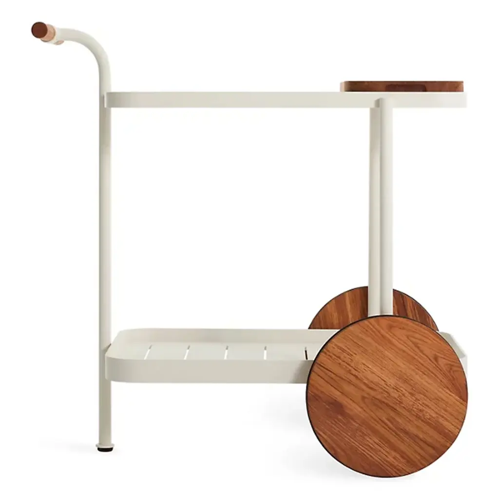 The handsome companion we could use on those long days. Kick off your shoes and sit back with the Longday Bar Cart from Blu Dot sporting your favorite refreshments. It’s the bar cart that gives you something to admire as you sip on your drink. The eyes get lost in the natural warmth and texture of the teak wood elements. The wood gives the piece a distinct pop against the smooth and sleek aluminum structure. Quarter up some limes on the elegant cutting board. Bring the party across the home through the smooth spinning wheels. The piece offers two shelves for storing glassware, liquids, and garnishes. If a spill happens inside, linear cuts help drain it for easy cleanup.