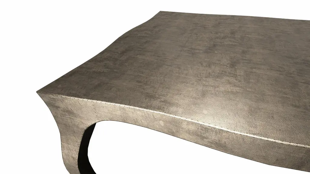 Nesting Tables from our Louise Collection. The renowned designer Paul Mathieu chose the name “Louise” when he created his more feminine version of Louis XV (1730-1760) furniture. The characteristic cabriole leg, curving outward at the knee and inward towards the foot in an "S" shape was born during this period. It is during the same era that English furniture makers produced the Queen Anne and Chippendale styles.Crafted with utmost care and attention to detail, these Louis Nesting Tables are made to order and are available in twelve metal clad finishes, ensuring that you can choose the perfect one to match your individual style and taste. The use of high-quality materials and expert craftsmanship ensure that each Art Deco Louis Nesting Tables is not only beautiful but also a true piece of art.The curved legs and side arms of this Art Deco Louis Nesting Tables are hand carved from solid pieces of teak. Pattern makers trace and cut complex forms that will cover the chair in a skin of copper, white bronze, brass or antiqued white bronze The metal finishes will tarnish over time. Regular non-abrasive household metal polishes can be used to restore the original luster.Overall, if you're looking for a piece of furniture that combines luxury, comfort, and style, then the Art Deco Nesting Tables is an excellent choice. With its distinctive curved profile and multiple finish options, this Chair set is sure to elevate the look of any room it is placed in, and be a beloved addition to your home for years to come.The images shown in this listing are shot in different lighting conditions and/or are 3D illustrations. We encourage our customers to please request a sample or a full sample set of 12 finishes so that they can experience the finish first hand. Louise Art Deco Carts and Bar Carts Fine Hammered Antique Bronze by Paul MathieuSize- 31.5"x 31.5"x 16"HMaterials - Antique Bronze, Metal sheet, Teak, Wood, MetalTechniques: Hand-Crafted, Hand-Carved, Metal Work, Wood Work, Metal Wrapping, PolishedPlease note that moisture in air, sudden change in temperature and natural movement of wood over time causes the metal to wrinkle or bubble up. We use well seasoned, reclaimed teak and high quality marine grade MDF (wherever technically possible) to avoid and delay the mentioned changes. However a perfect stability of metal cannot be guaranteed. Please note that our smooth finish metal clad pieces will have some unavoidable tool marks. This is proof that everything is done by hand. The smooth finish will not come out like a machine made perfect surface and the master artisan will do their best to make it look as good/clean/stable/perfect as he possibly can.The antique white bronze finish is hand done by using an acidic chemical over the white bronze finish to recreate a natural patination. Like with the natural patination of silver, copper, or brass, the final result and color uniformity of the patina cannot be guaranteed. The goal of this finish is to achieve rainbow-like shades with dull, shiny, cloudy, and streaky patches to give an illusion of antiquing. Please note:None of our metal clad pieces are treated with a protective “finish” thus enabling the items to age naturally over time. We will of course polish them well before we pack them. a) Copper oxidizes faster than the other metals. In six to twelve months it will most likely lose its shine and will gradually turn to different shades of brown and/or green/blue. This aging process and its effect is referred to as verdigris. After a year the piece should not change much more. Copper does not rust, but does require periodic cleaning in order to retain its original shine if that the preferred option. ('BRASSO' or any known copper polish can be used to polish copper).b) Brass retains its shine for far longer than others, but will tarnish if not cleaned on occasion. ('BRASSO' is made to polish brass).c) White bronze, has the least tendency to show age or tarnish. If kept in a controlled climate, this metal will hold its shine for years. It can be cleaned with a cleanser and polished with a cloth. d) The antiqued white bronze finish will react with the natural elements the fastest in the beginning but it too will stop reacting and will settle down in a stable state like copper after 6-12 months. Since it is already antiqued and looked like it is tarnished, as described in an earlier message, this fast reaction will not change the over all look. In that way this surface is most forgiving. The images shown in this listing are shot in different lighting conditions and/or are 3D illustrations. We encourage our customers to please request a sample or a full sample set of 12 finishes so that they can experience the finish first hand.